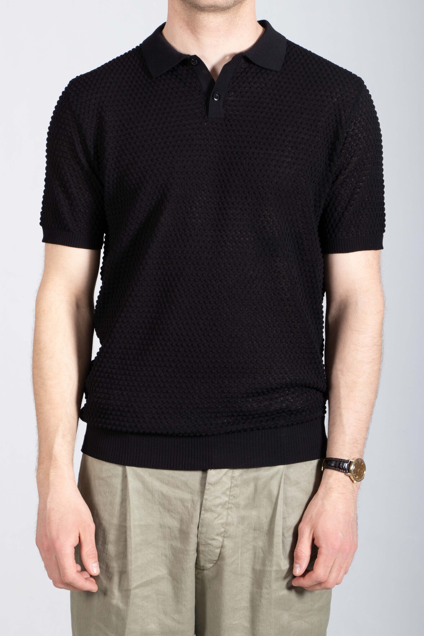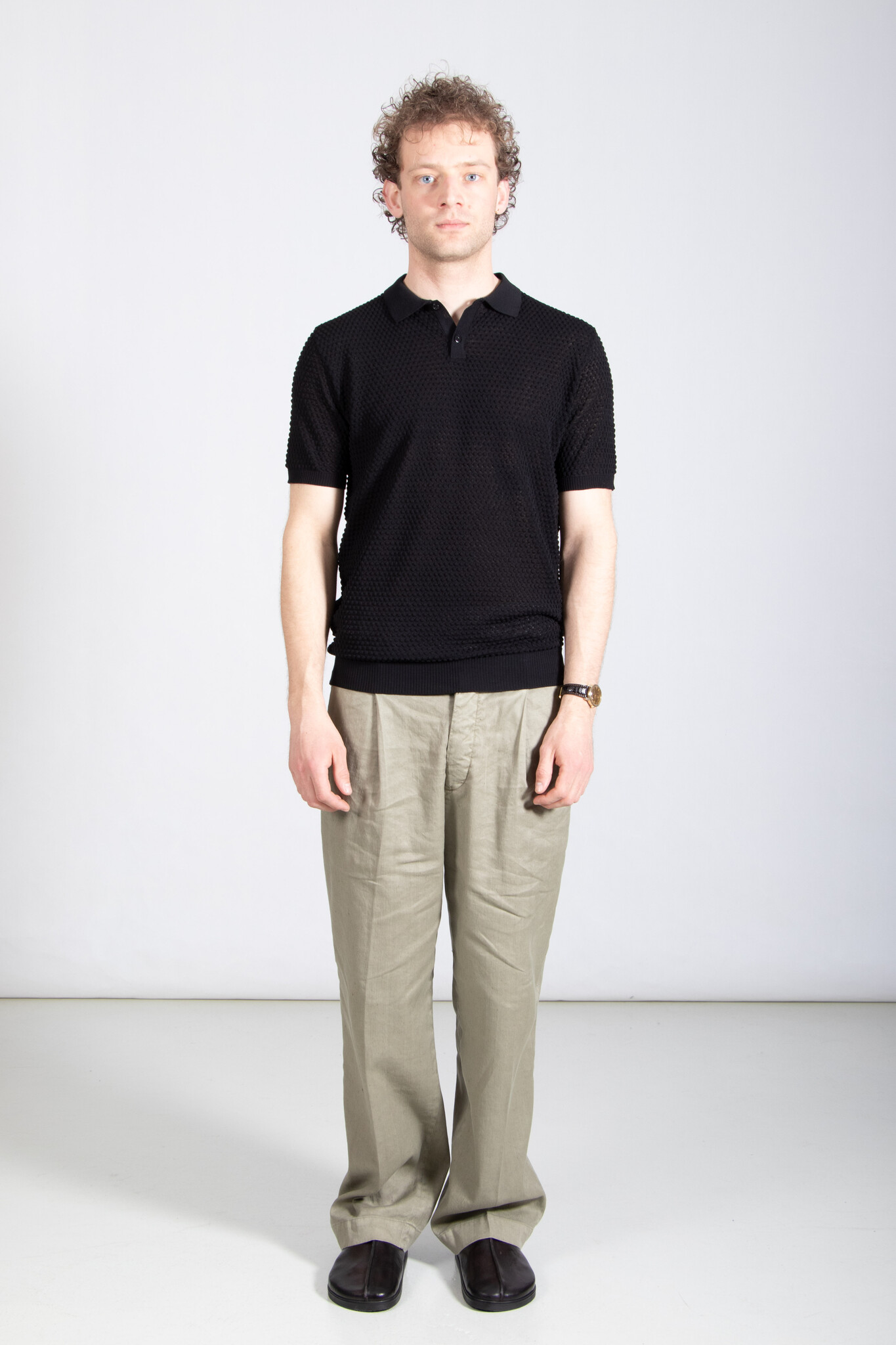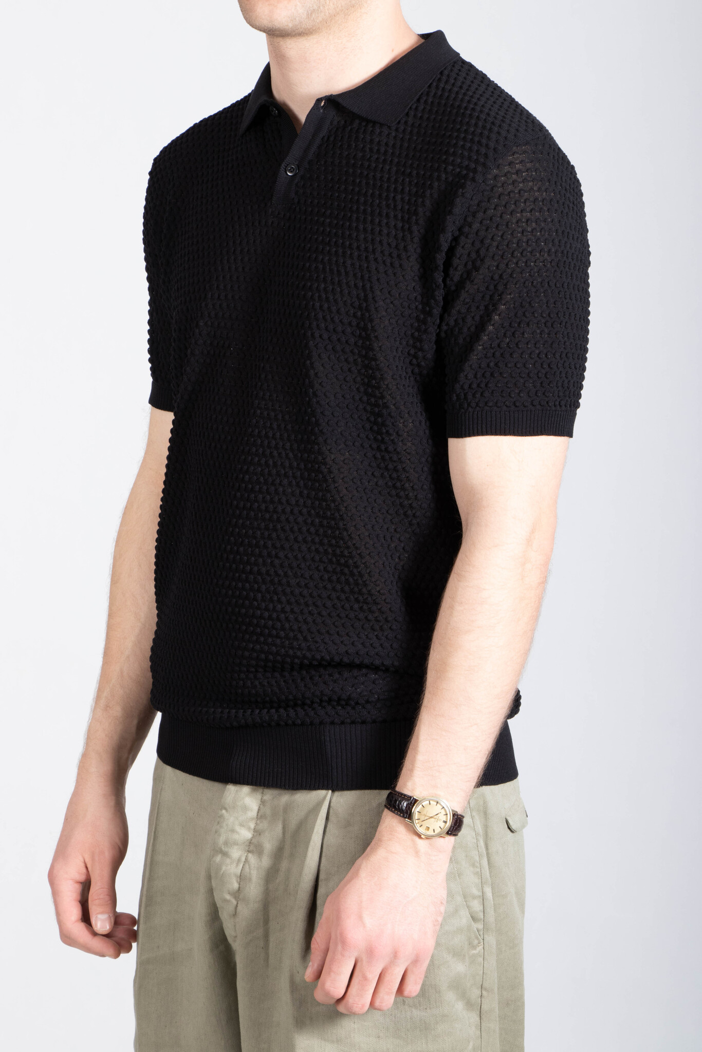 | Poloshirt mit kurzen Ärmeln und Knopfleiste von G.R.P. aus Florenz. Gestrickt aus trockenem Crepekatoen in der sogenannten Spotknit, einem Strickmuster, das G.R.P. 2004 selbst entwickelt hat. Unser Model ist 189 cm groß und trägt Größe XL. | |
