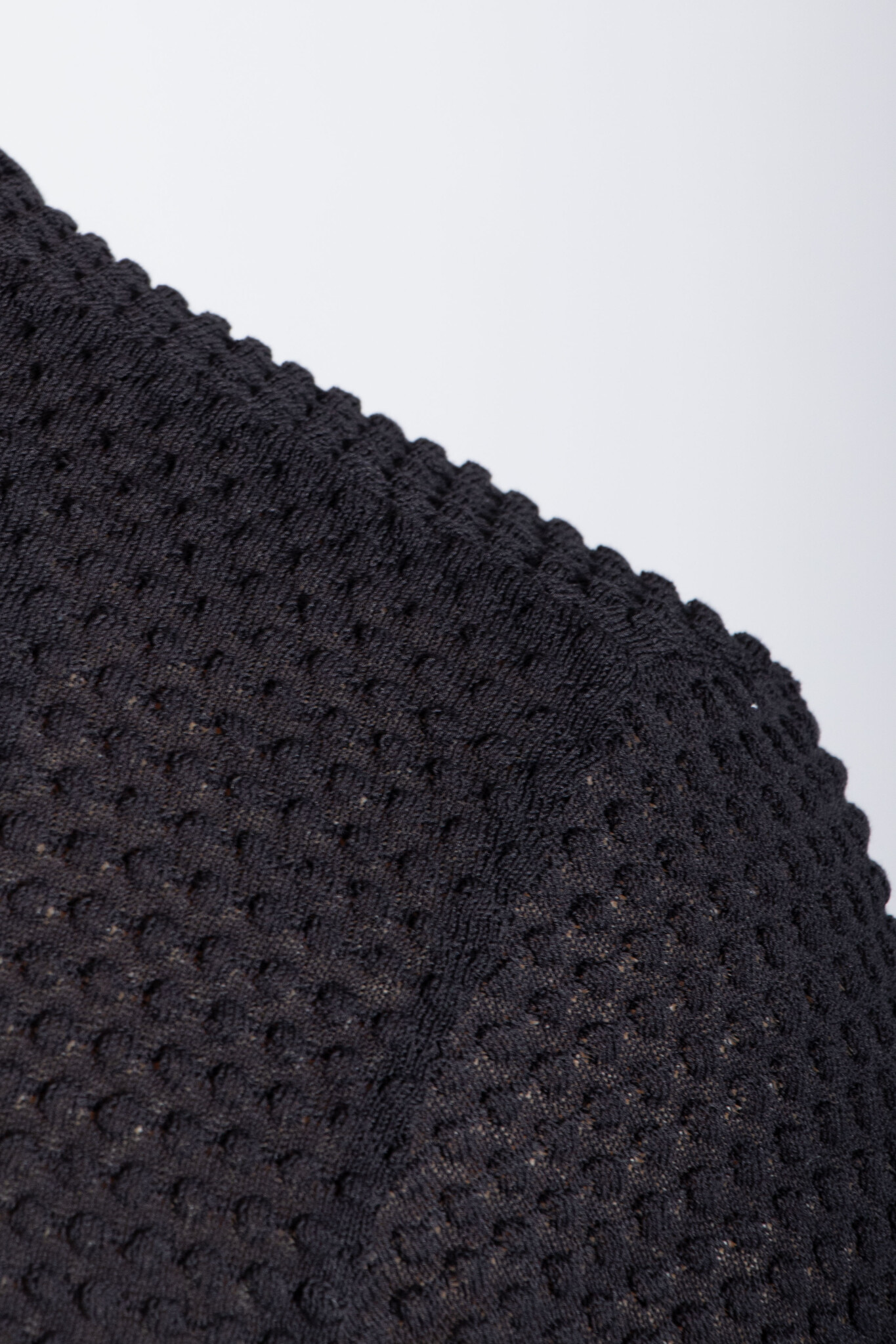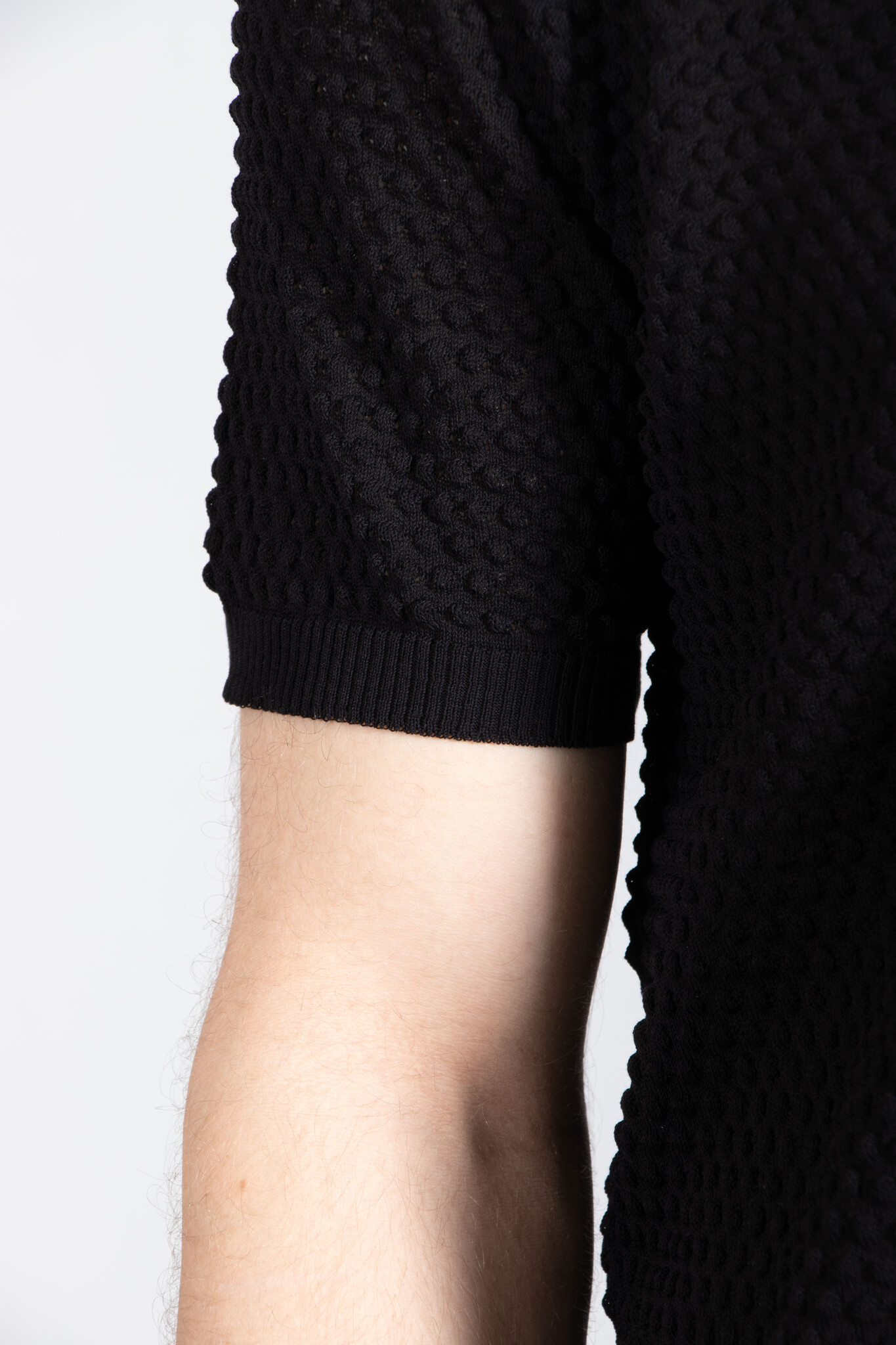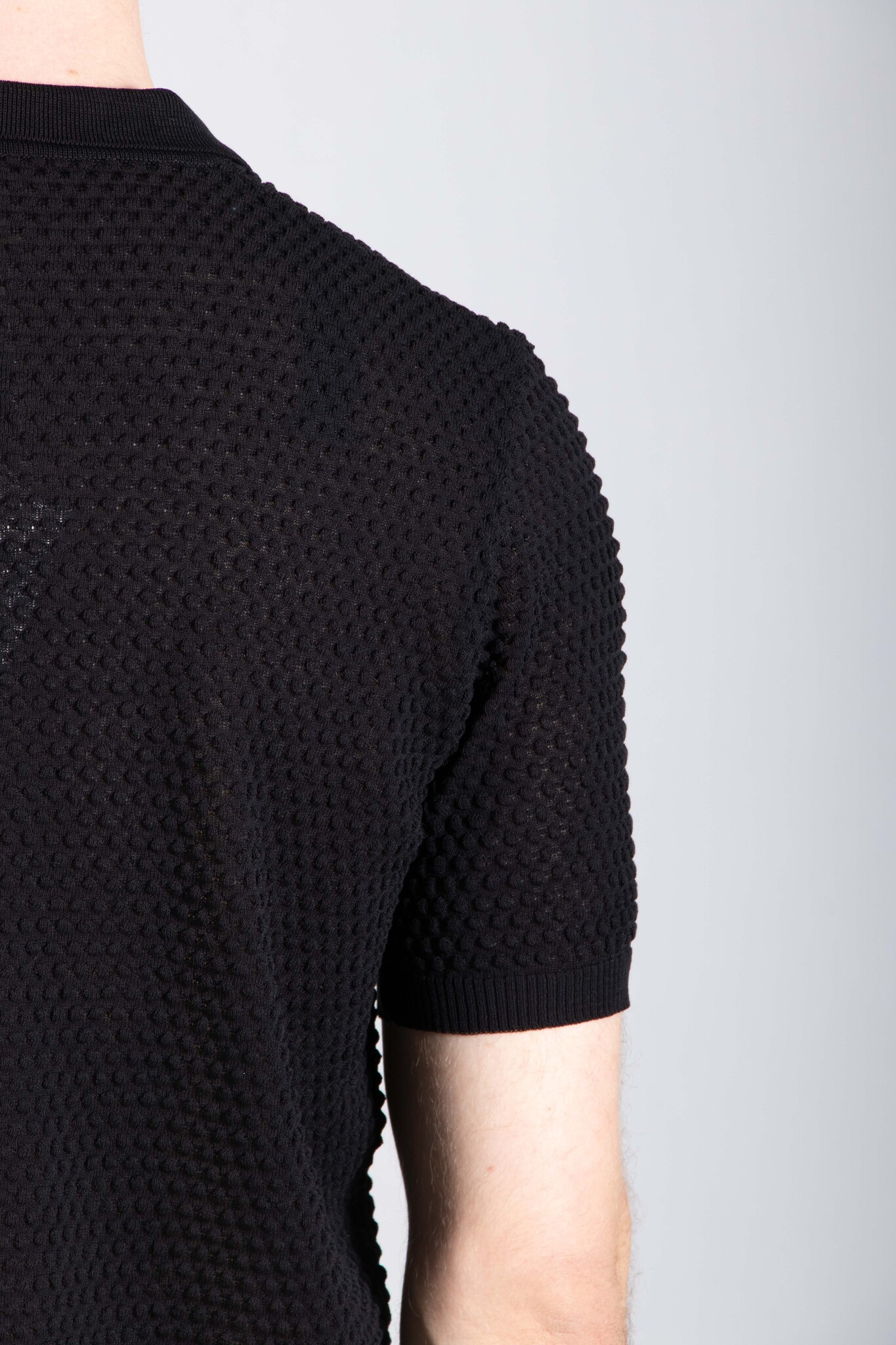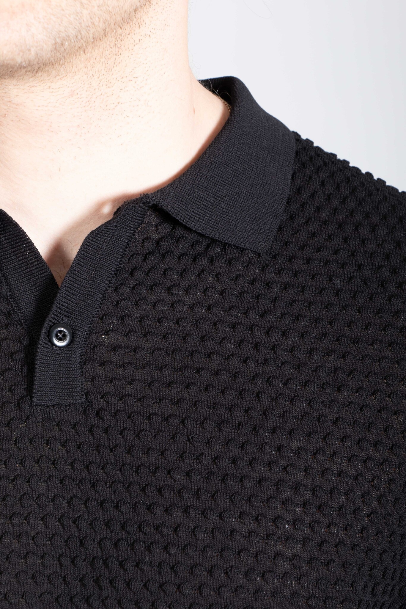 | Poloshirt mit kurzen Ärmeln und Knopfleiste von G.R.P. aus Florenz. Gestrickt aus trockenem Crepekatoen in der sogenannten Spotknit, einem Strickmuster, das G.R.P. 2004 selbst entwickelt hat. Unser Model ist 189 cm groß und trägt Größe XL. | |
