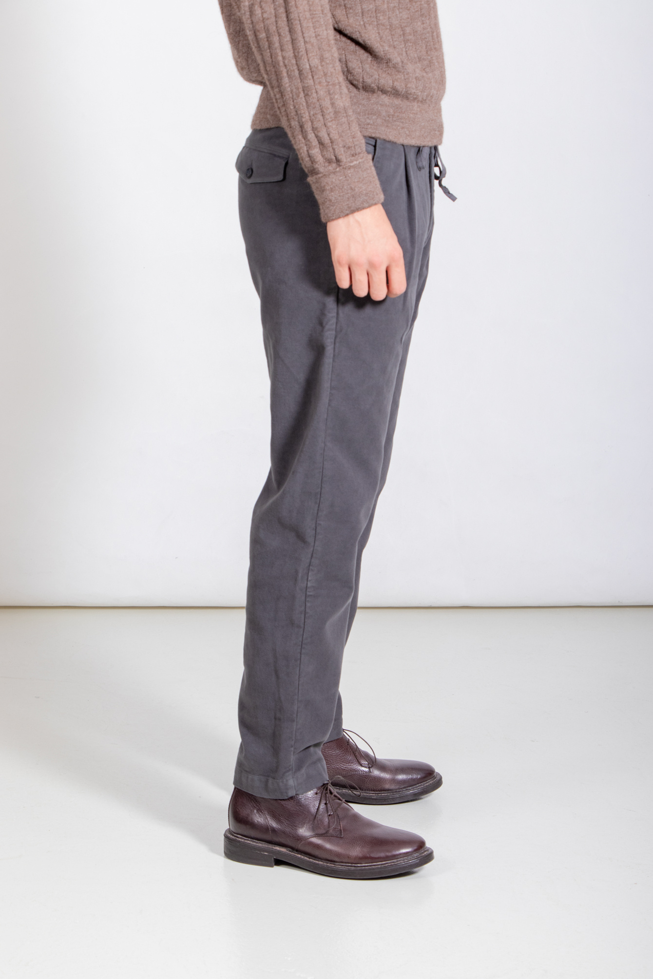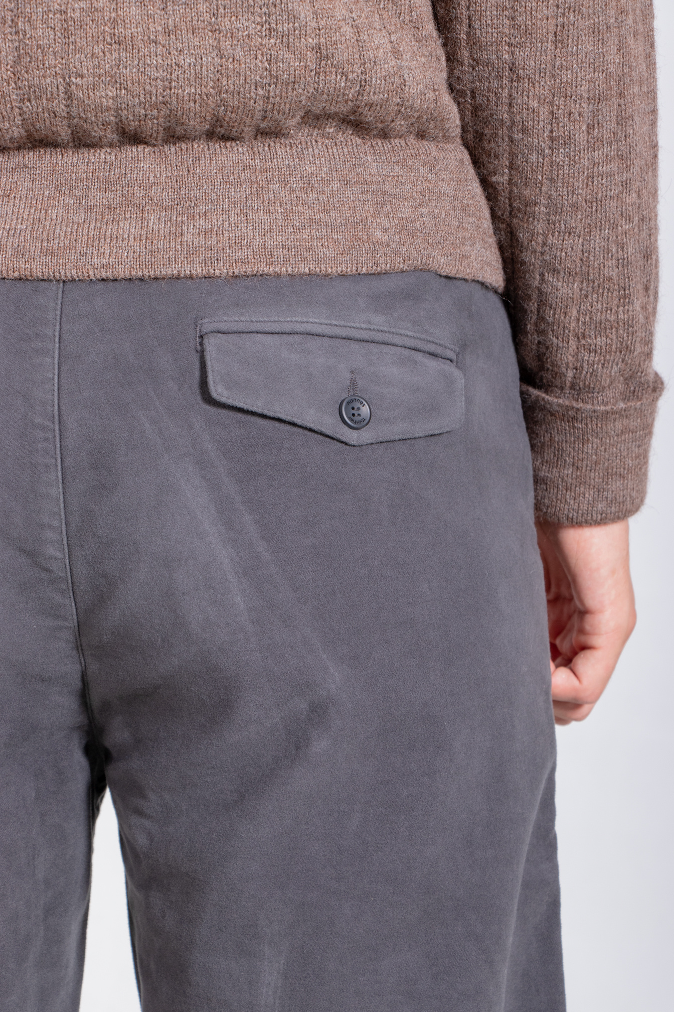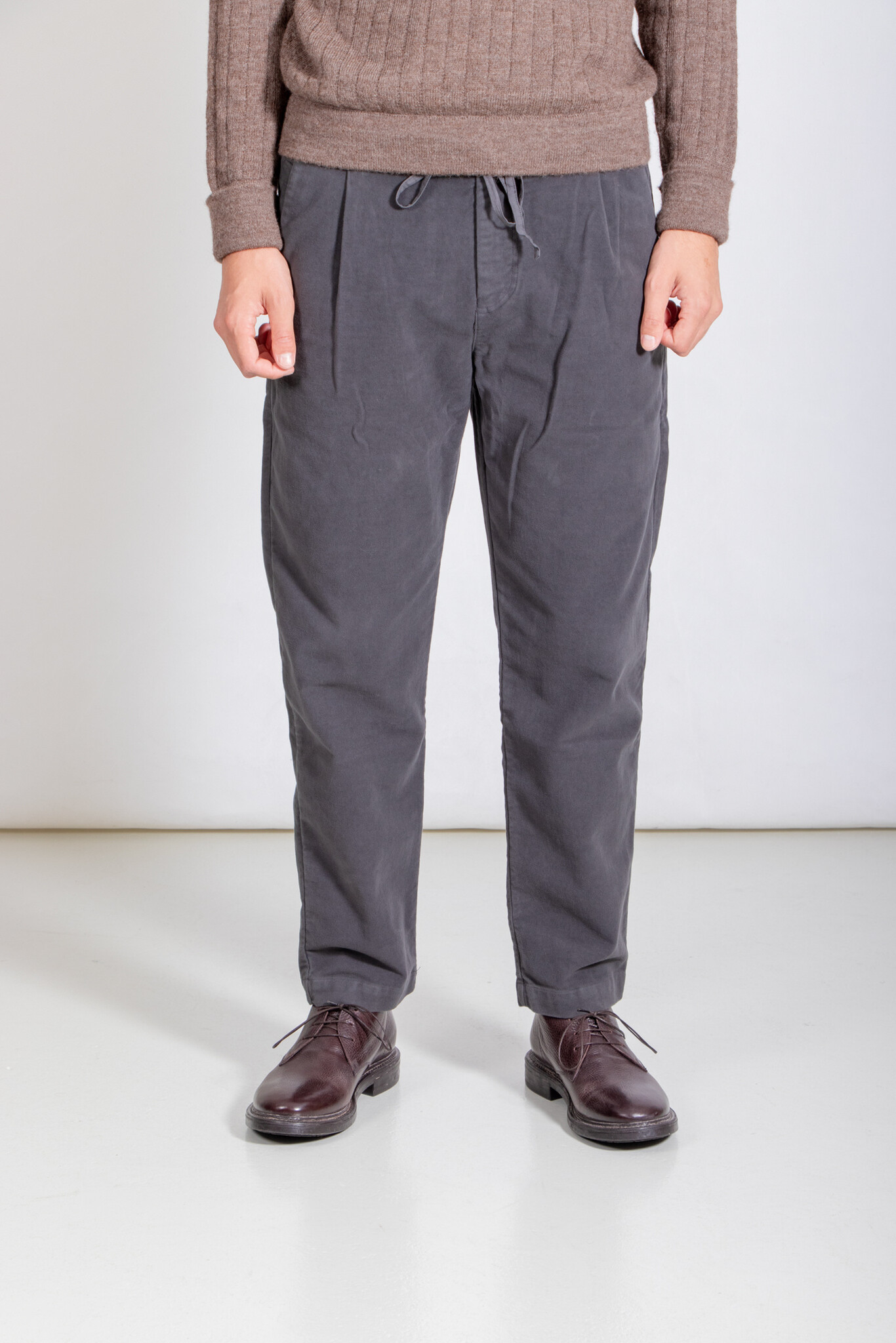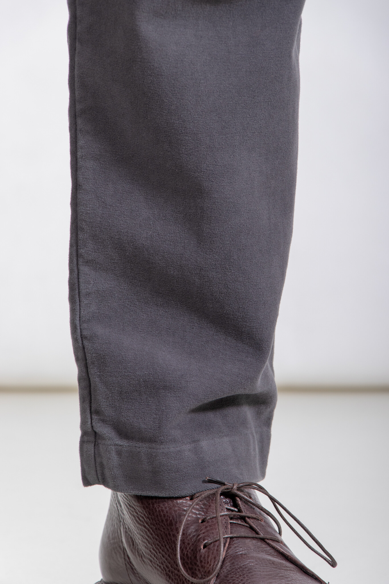 Hose von Hannes Roether. Gefertigt aus Baumwoll-Moleskin, angenehm weich und gleichzeitig robust. Die Hose hat eine einzelne Bundfalte und schmal zulaufende Beine. Unser Model ist 192 cm groß und trägt Größe M. | |