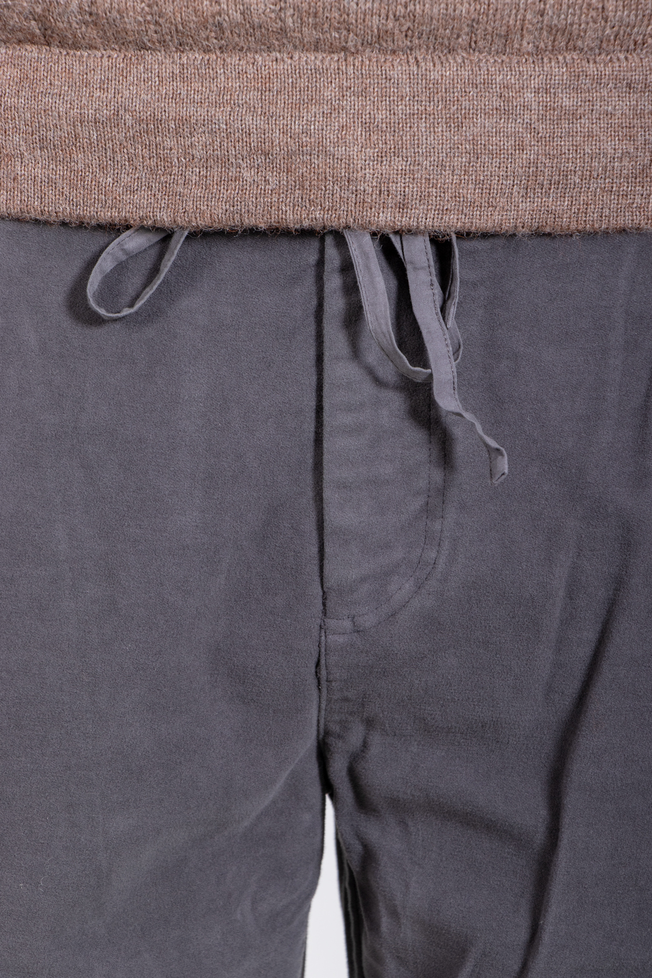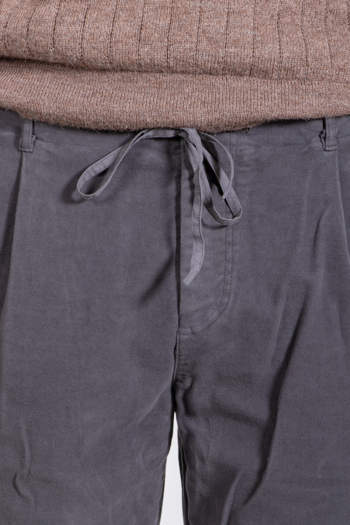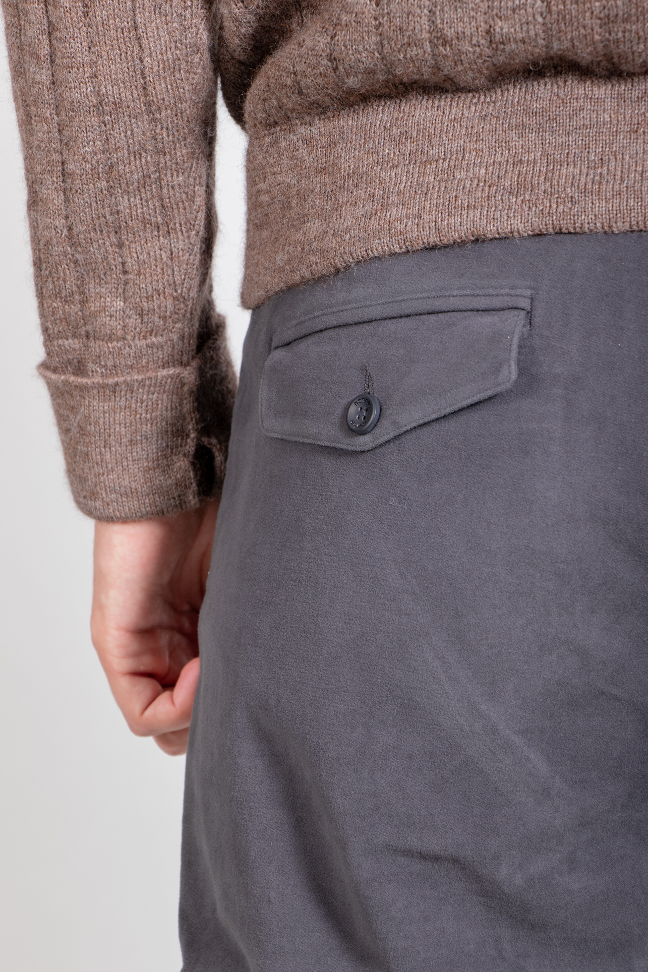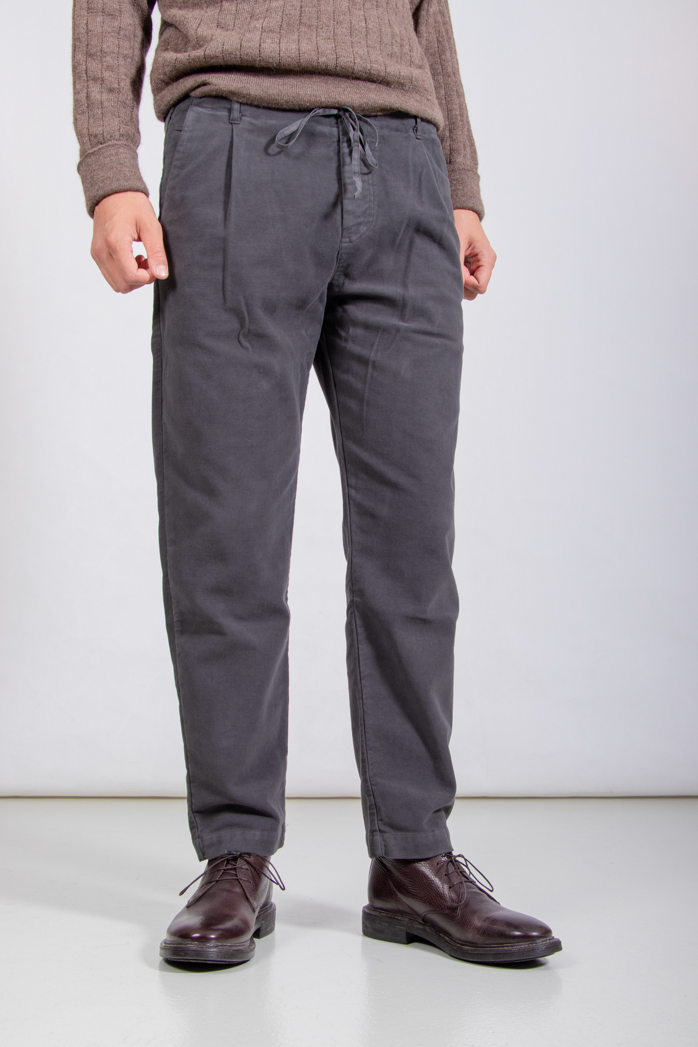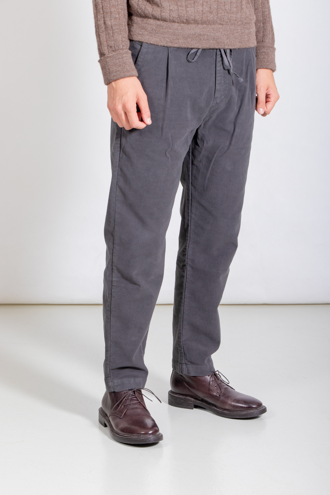 Hose von Hannes Roether. Gefertigt aus Baumwoll-Moleskin, angenehm weich und gleichzeitig robust. Die Hose hat eine einzelne Bundfalte und schmal zulaufende Beine. Unser Model ist 192 cm groß und trägt Größe M. | |