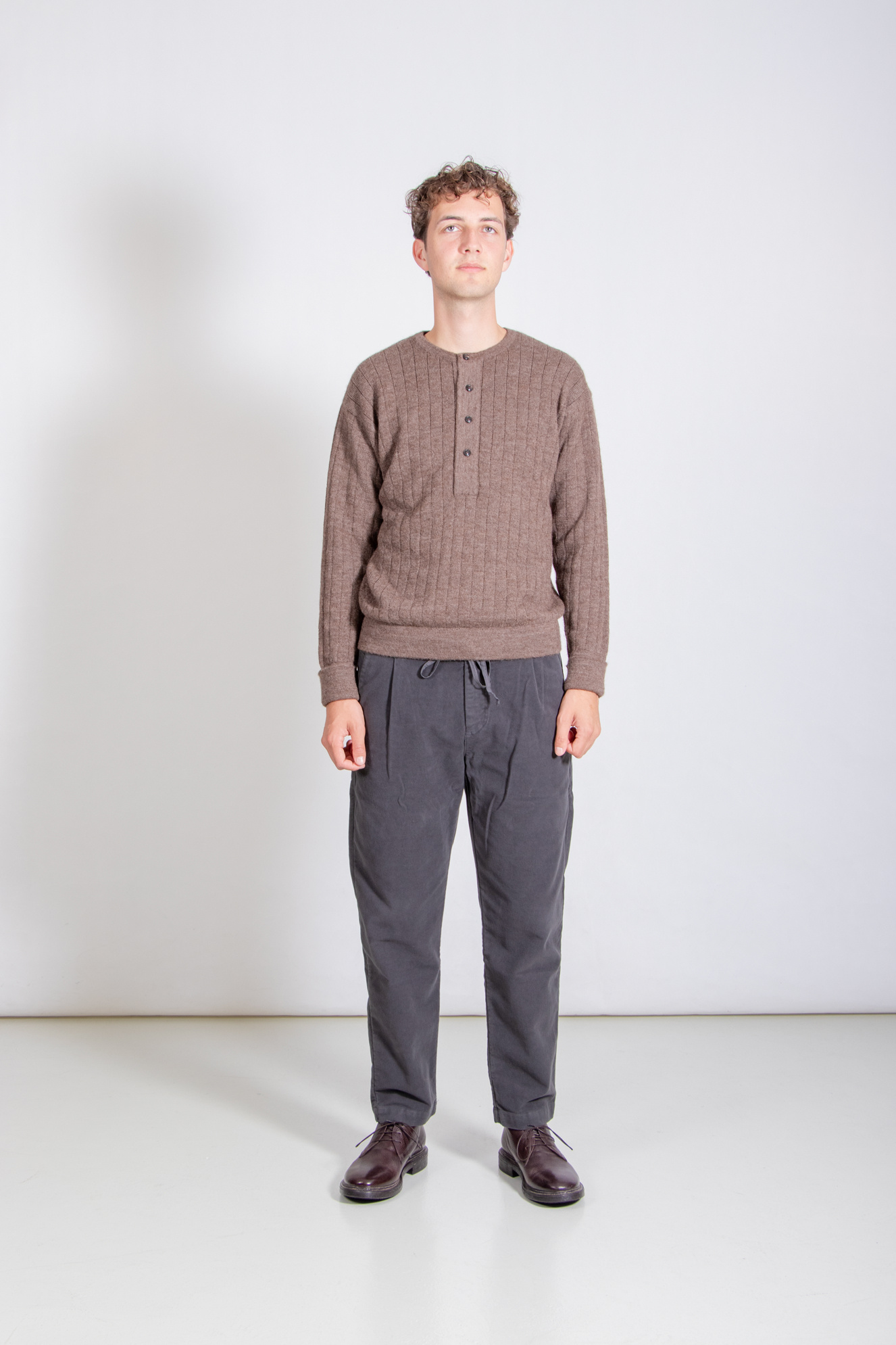 Hose von Hannes Roether. Gefertigt aus Baumwoll-Moleskin, angenehm weich und gleichzeitig robust. Die Hose hat eine einzelne Bundfalte und schmal zulaufende Beine. Unser Model ist 192 cm groß und trägt Größe M. Lesen Sie mehr