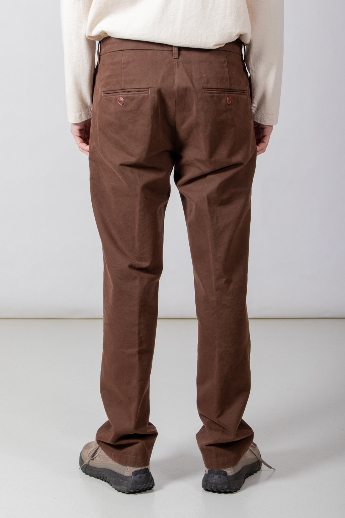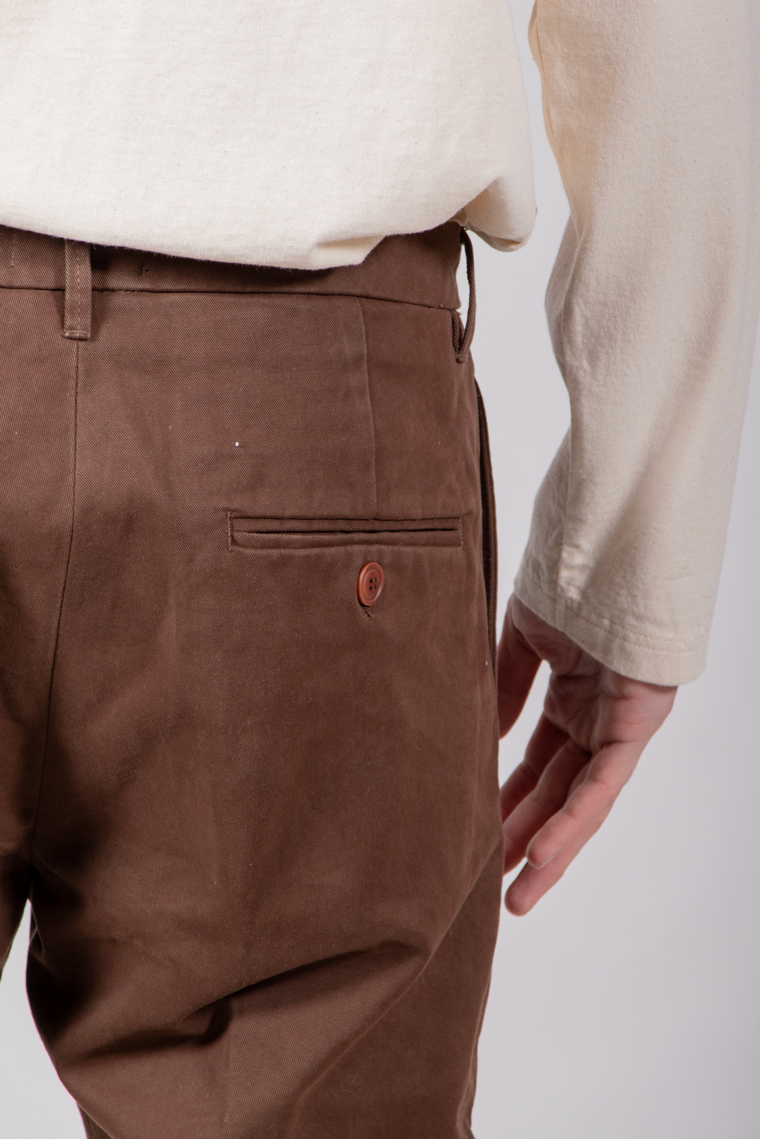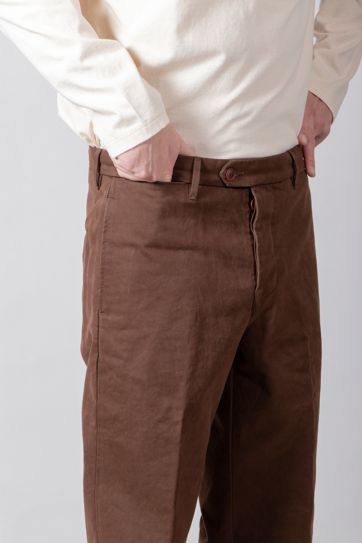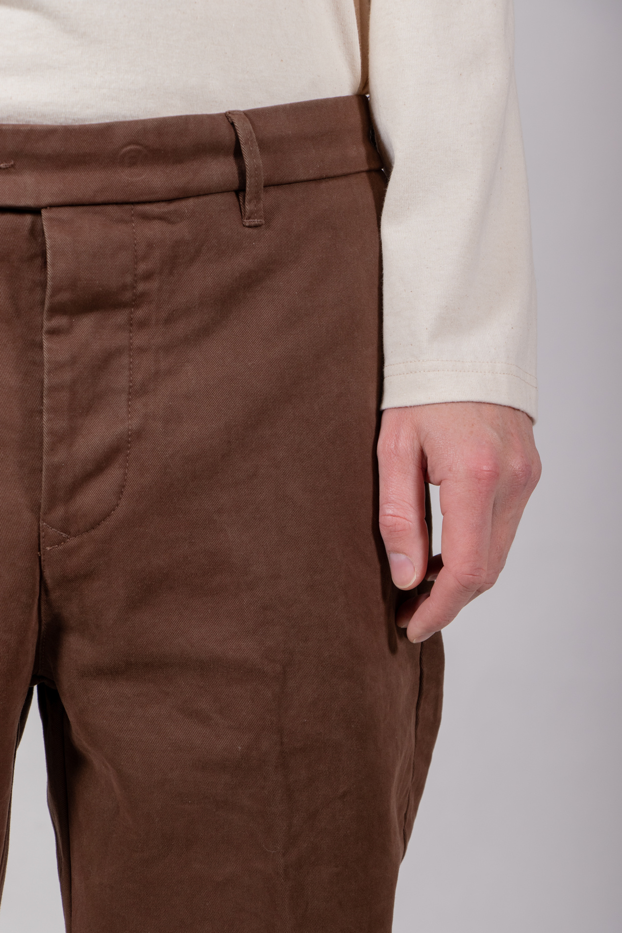 | Bekanntes Modell von Myths, in Italien aus Baumwolle mit etwas Elasthan gefertigt und mit Bundfalte versehen. Unser Modell ist 189 cm groß und trägt die Größe 50. | |