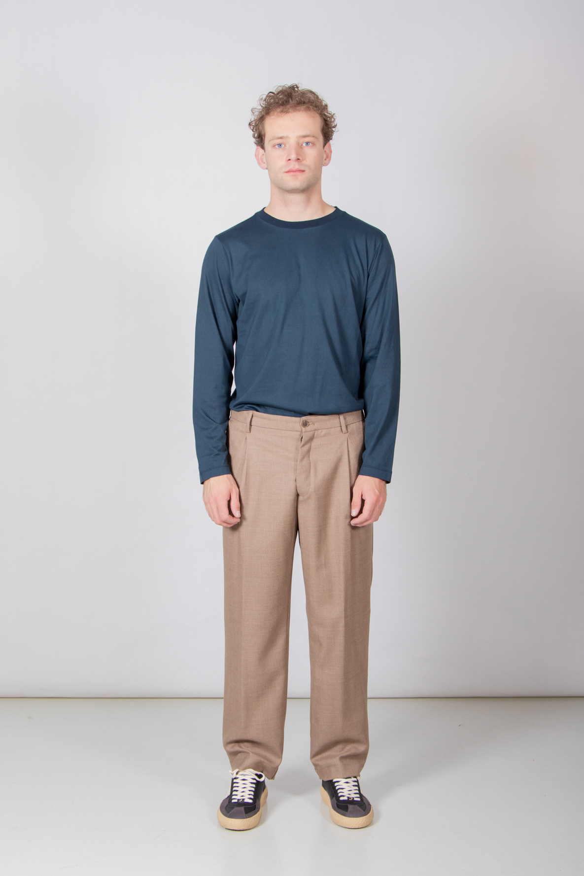 Weitere Hose von Myths. Die Hose ist aus einem weichen Wollstoff gefertigt. Außerdem hat die Hose eine einzelne Bundfalte. Unser Model ist 189 cm groß und trägt Größe 50. Lesen Sie mehr