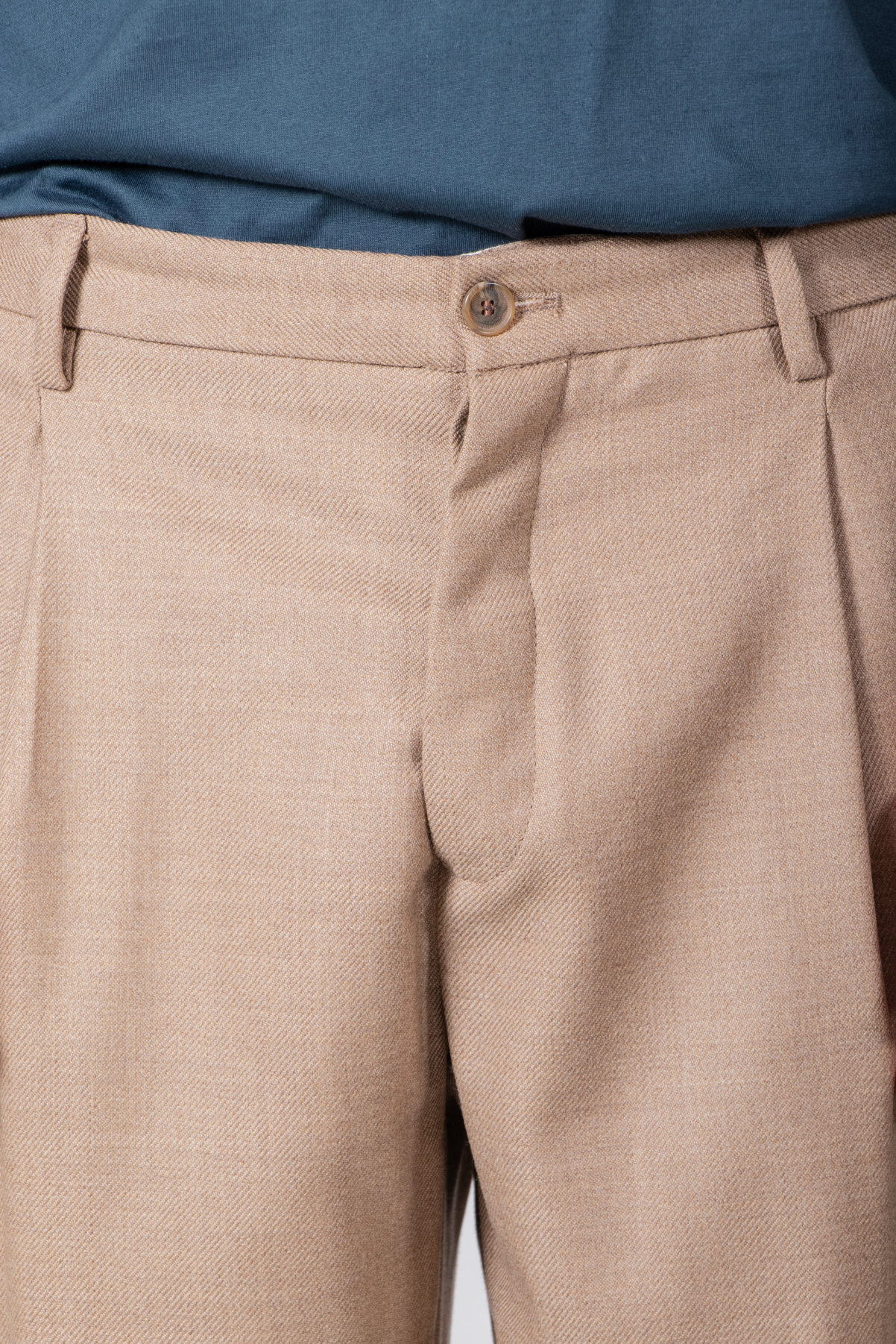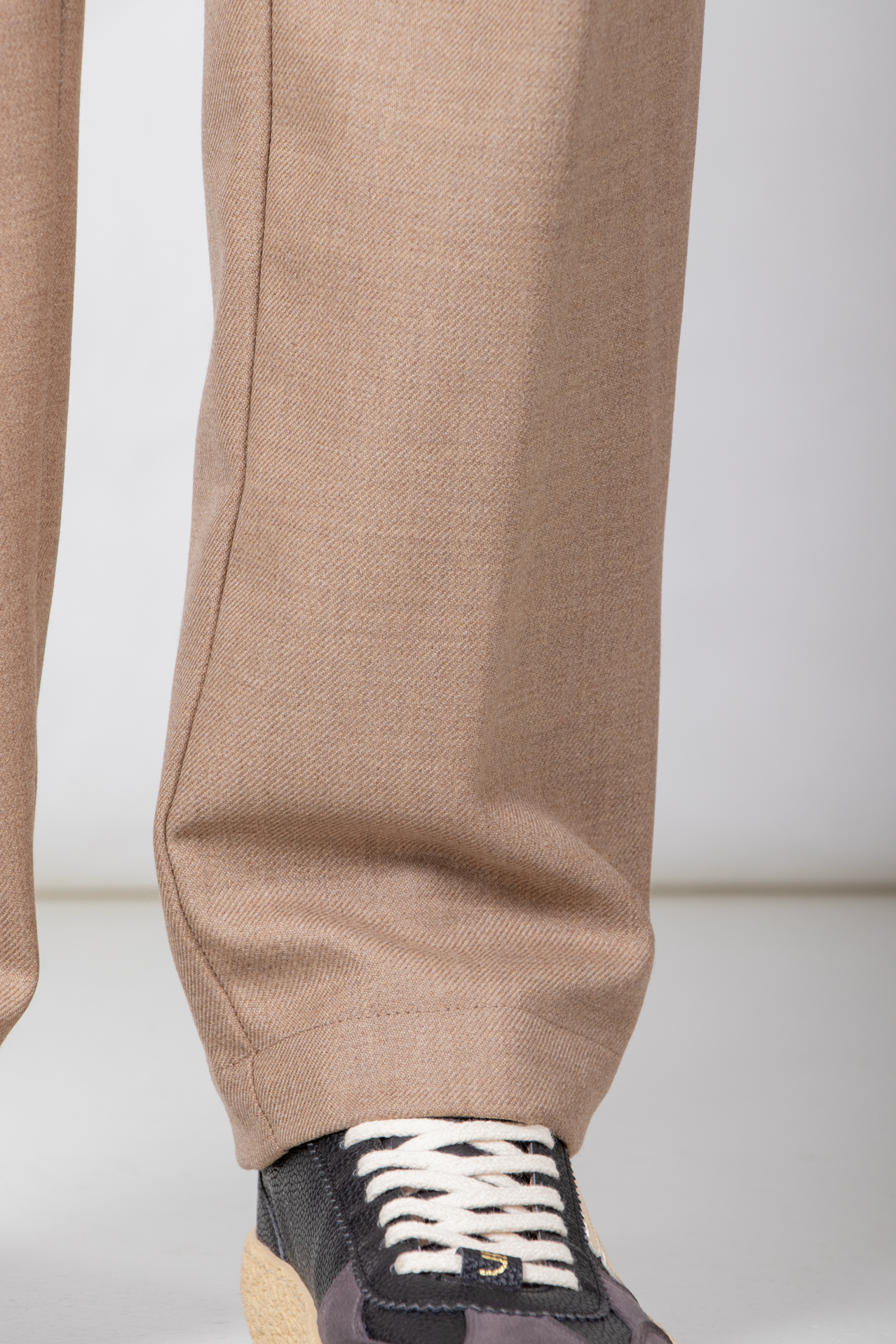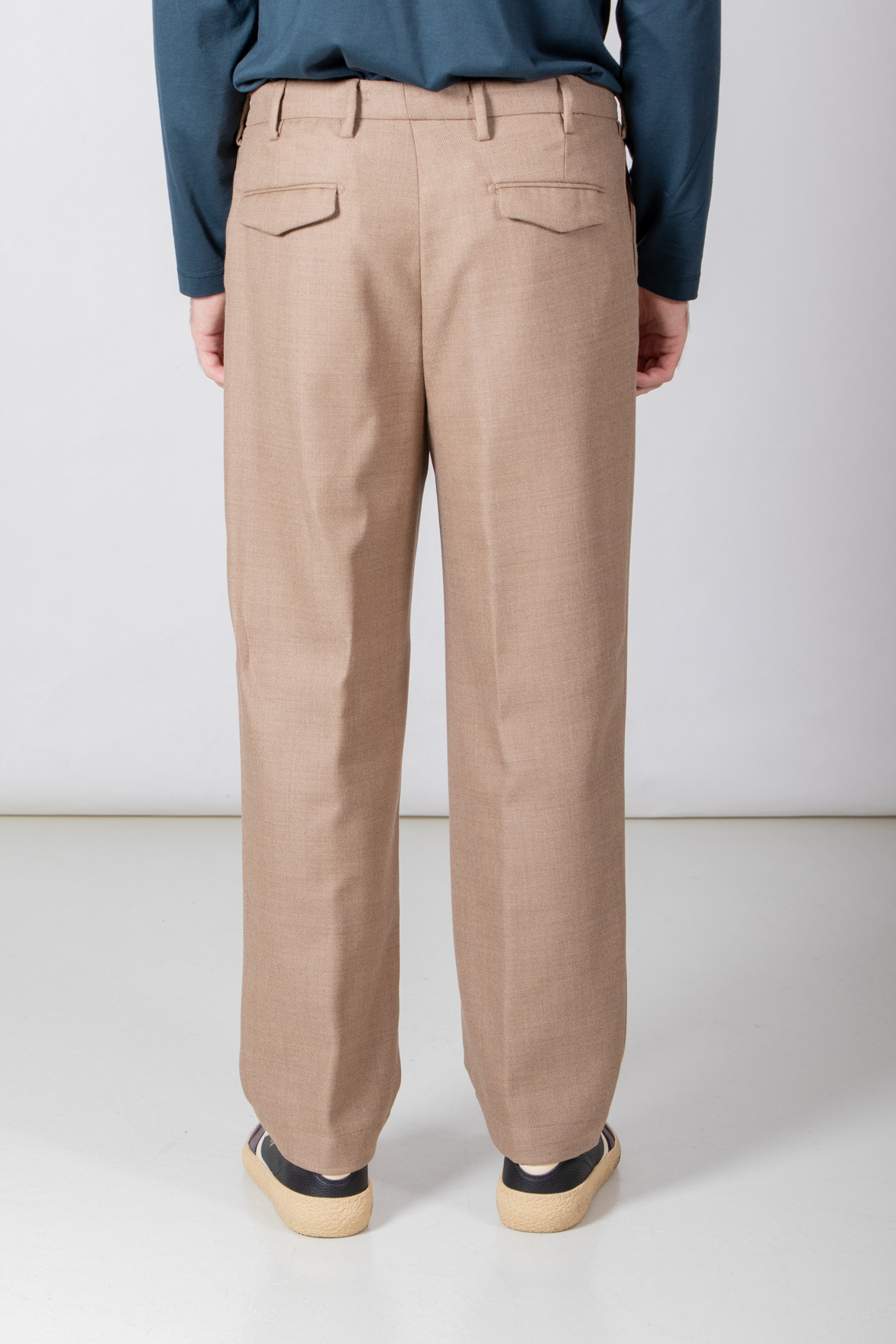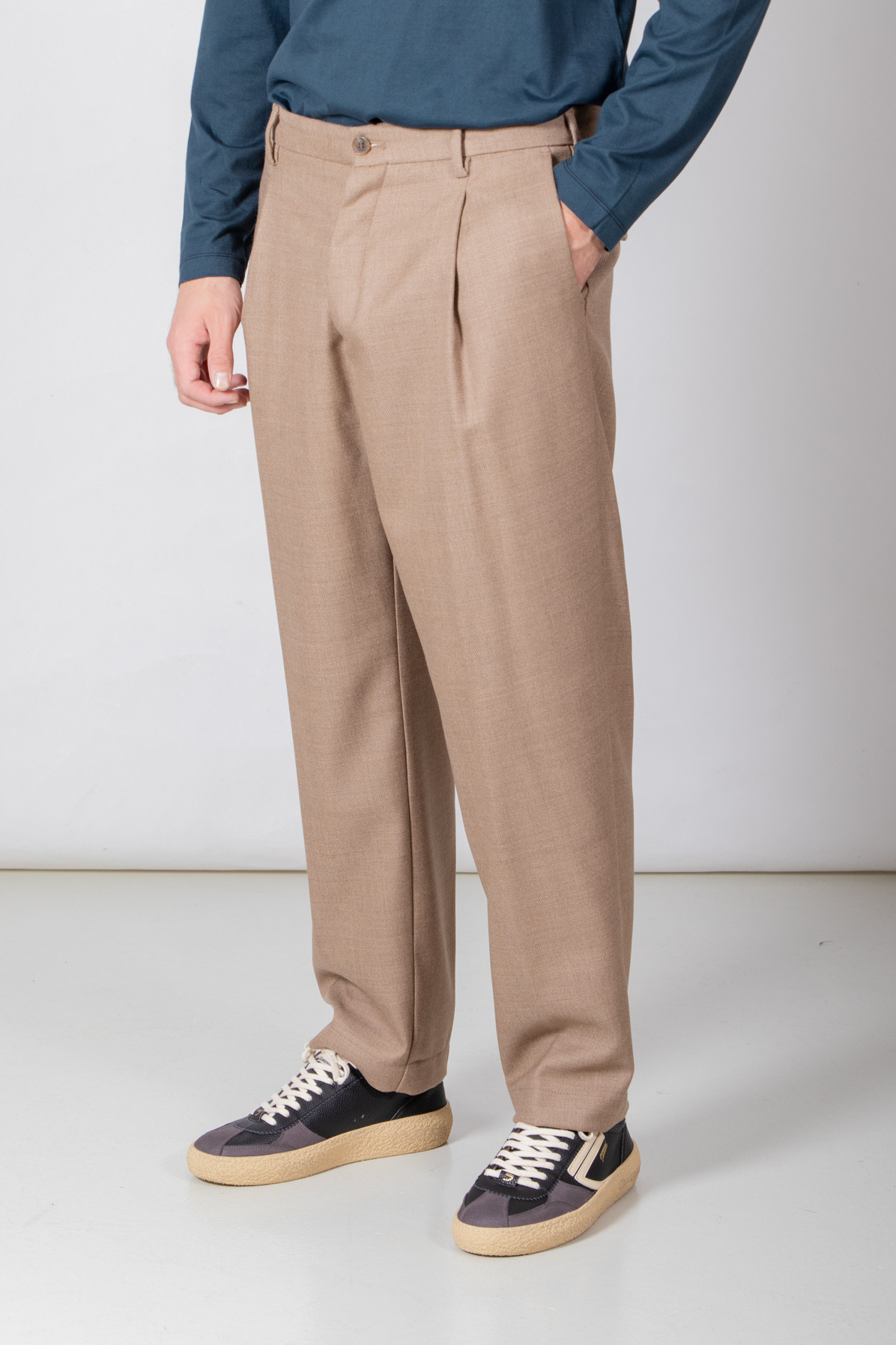 | Weitere Hose von Myths. Die Hose ist aus einem weichen Wollstoff gefertigt. Außerdem hat die Hose eine einzelne Bundfalte. Unser Model ist 189 cm groß und trägt Größe 50. | |