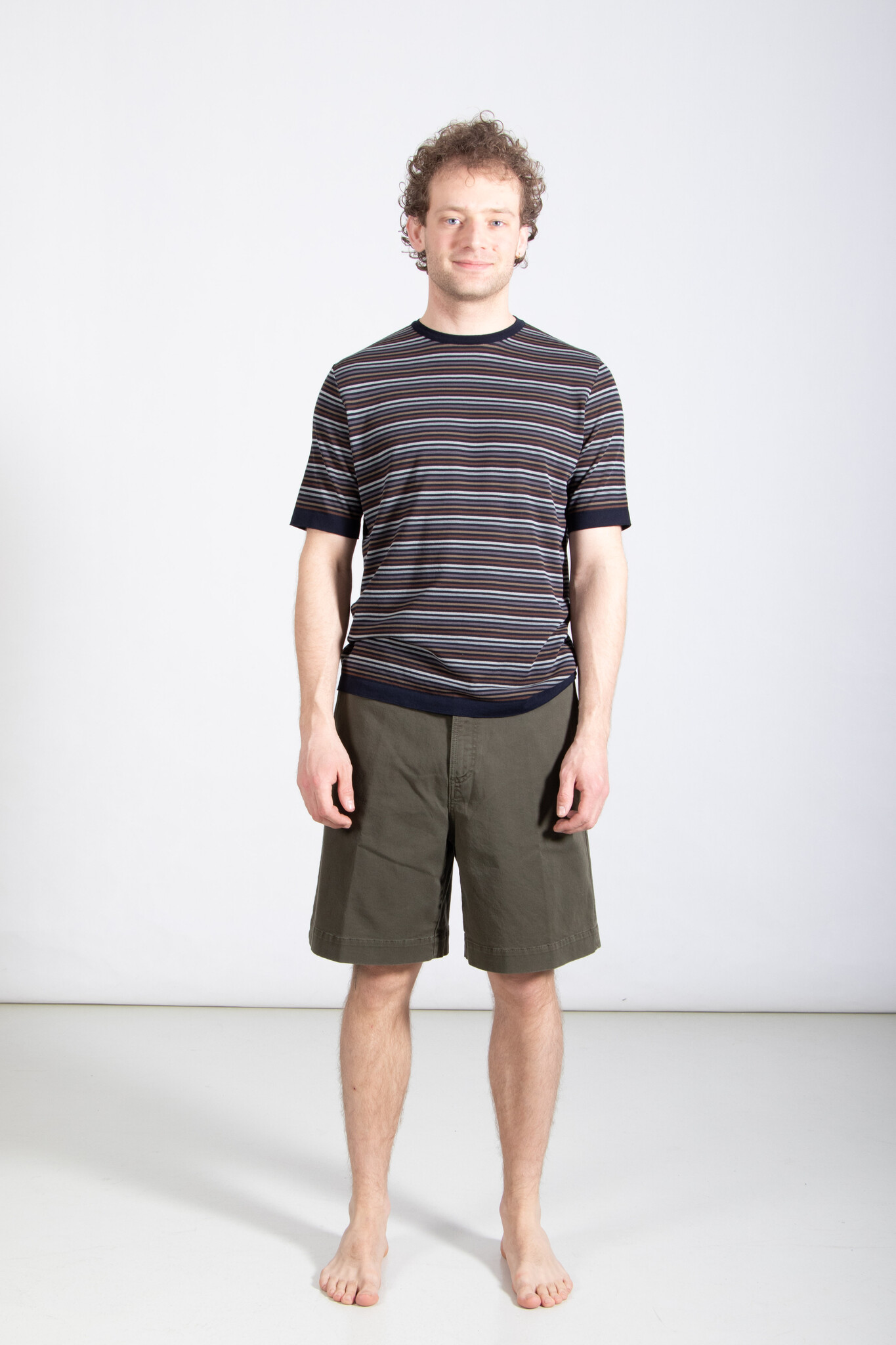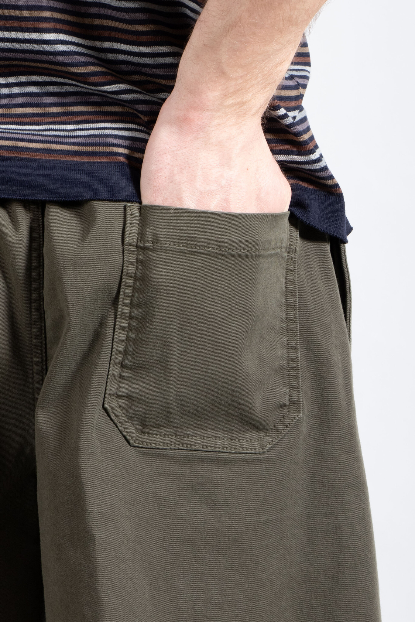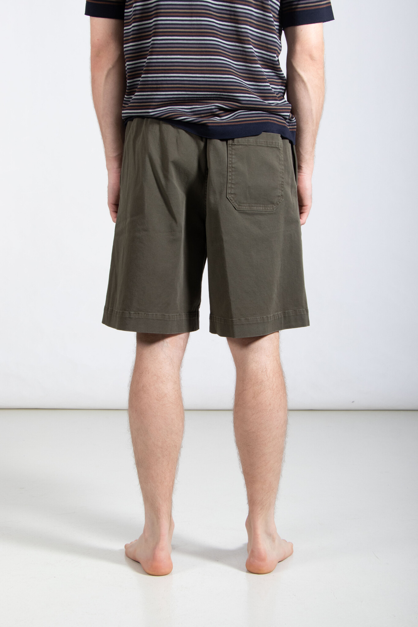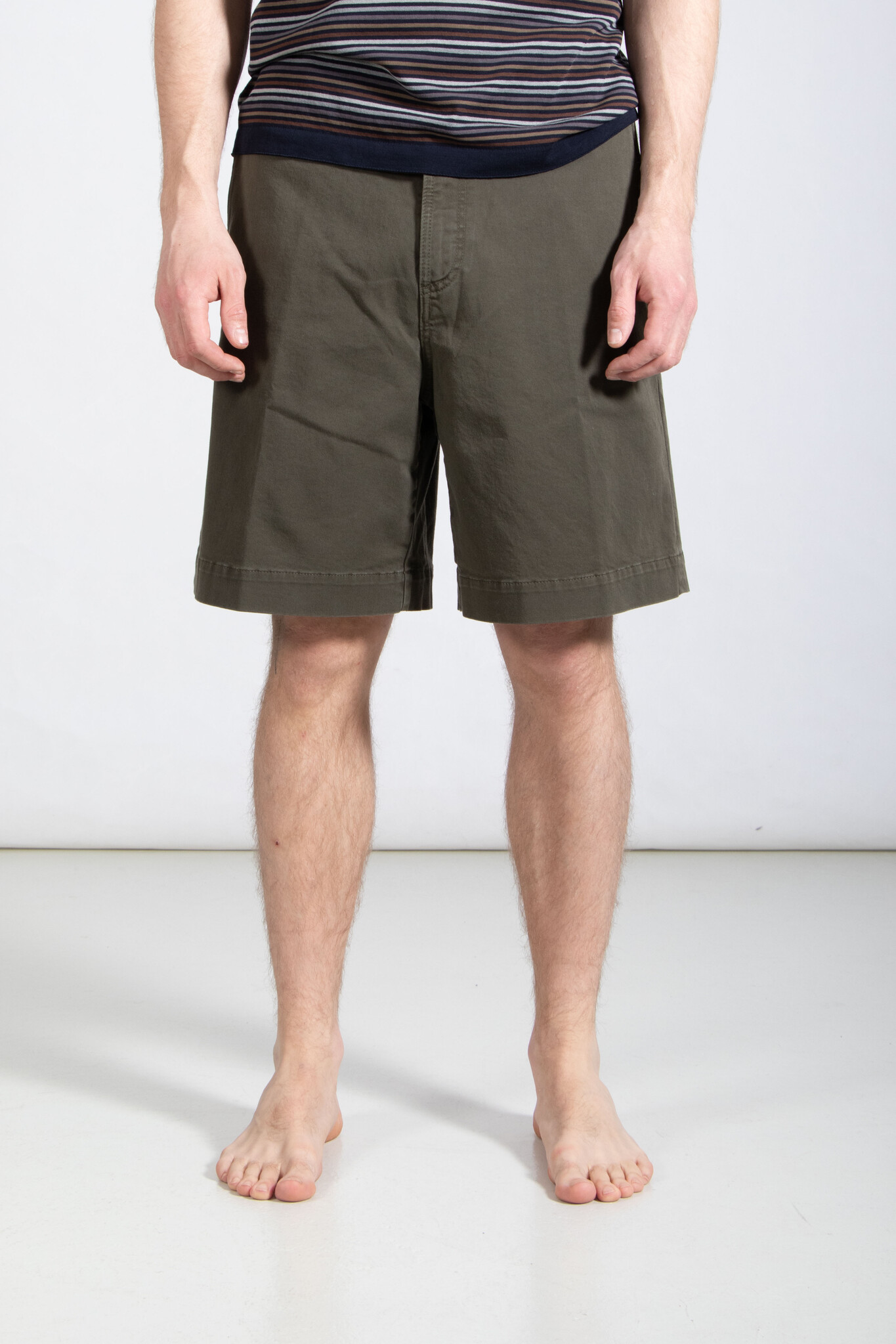 Kurze Bermuda-Shorts von Nine in the Morning, gefertigt aus Baumwolle in Oliv. Unser Modell ist 189 cm groß und trägt Größe 32. Lesen Sie mehr