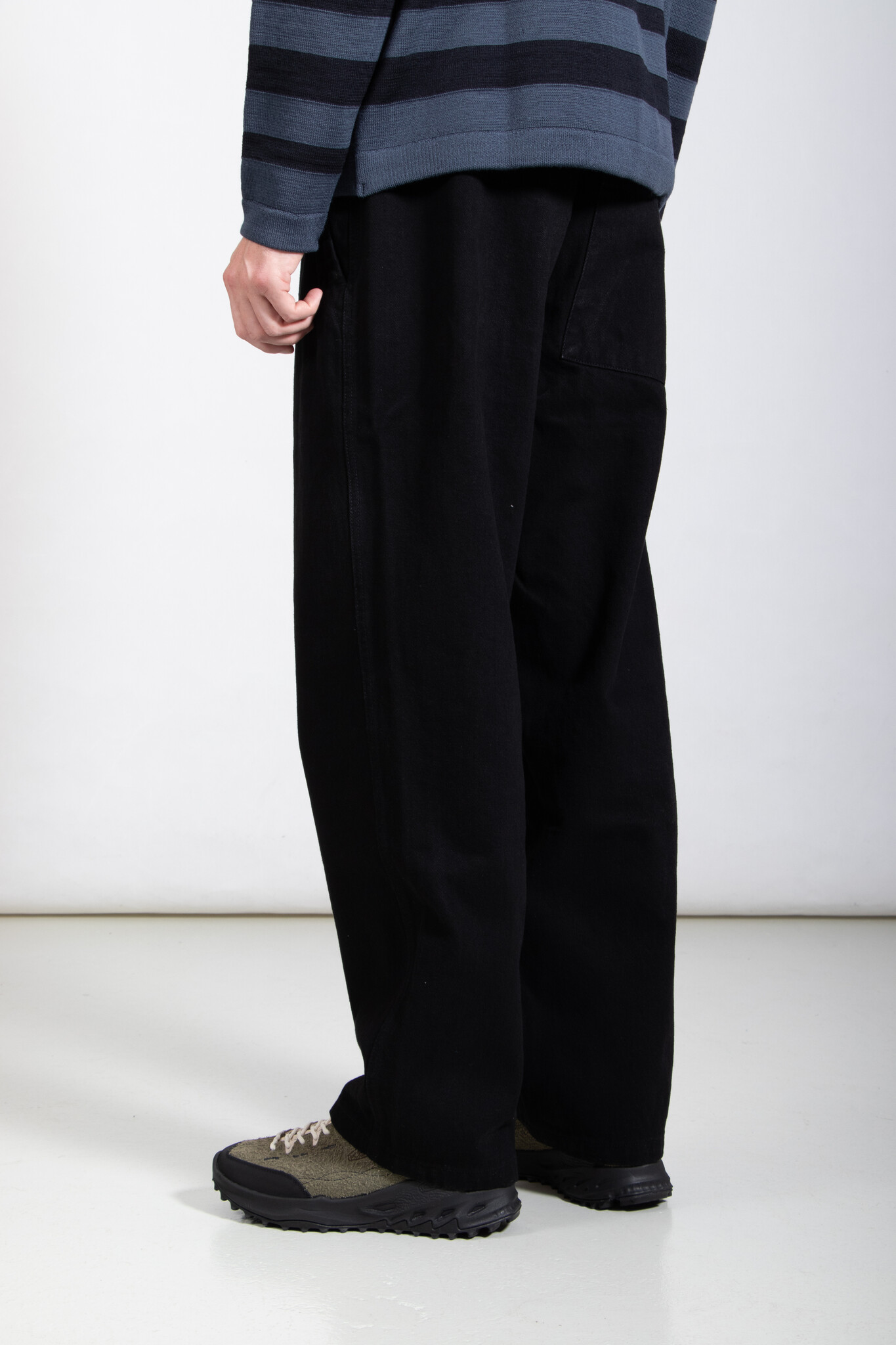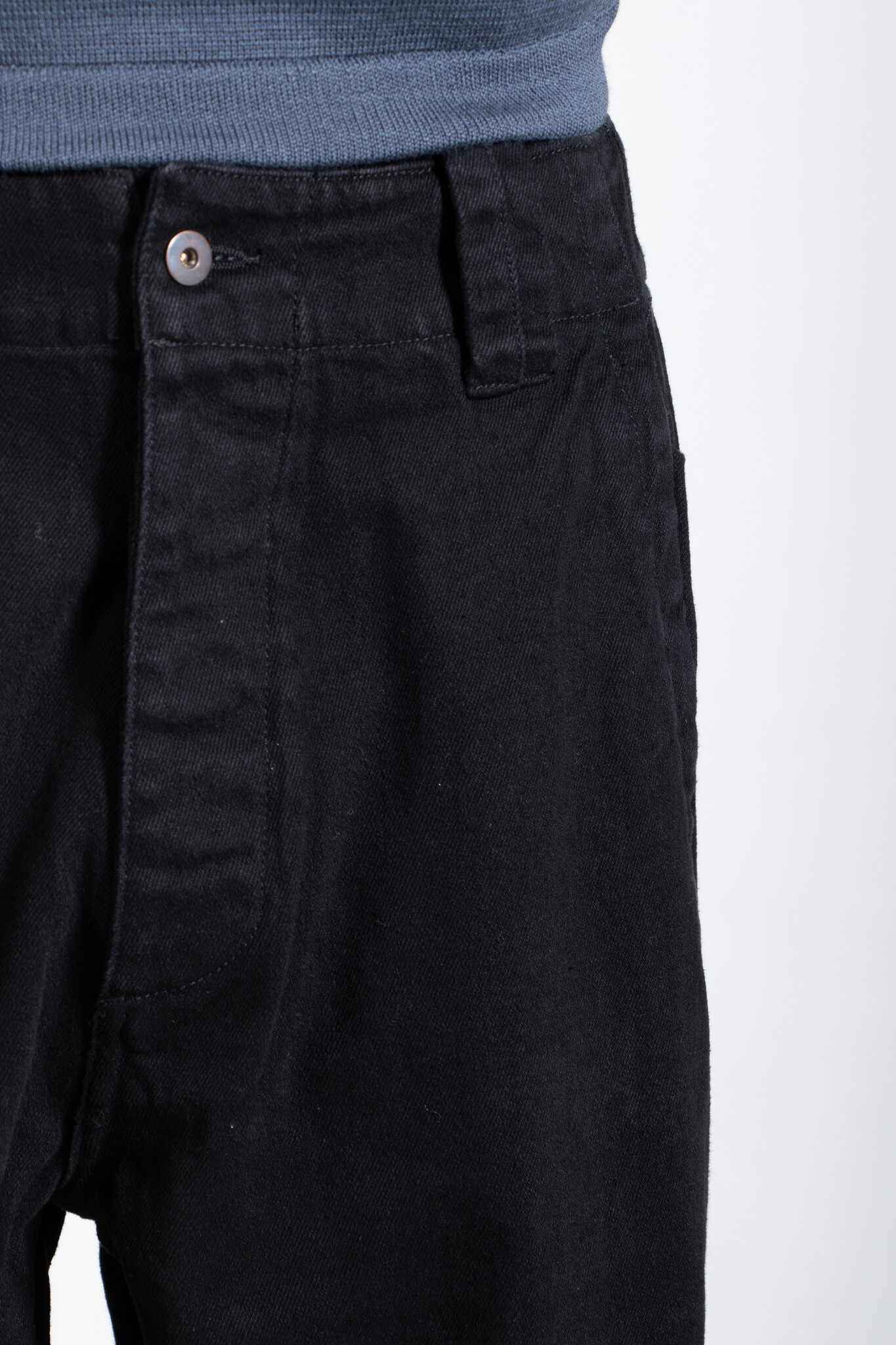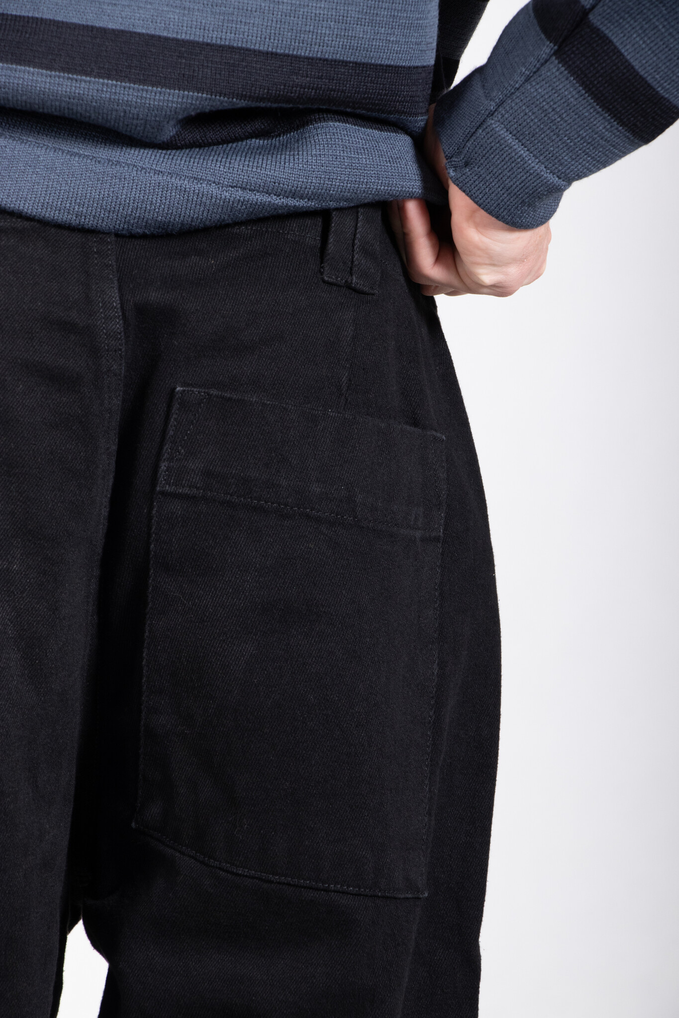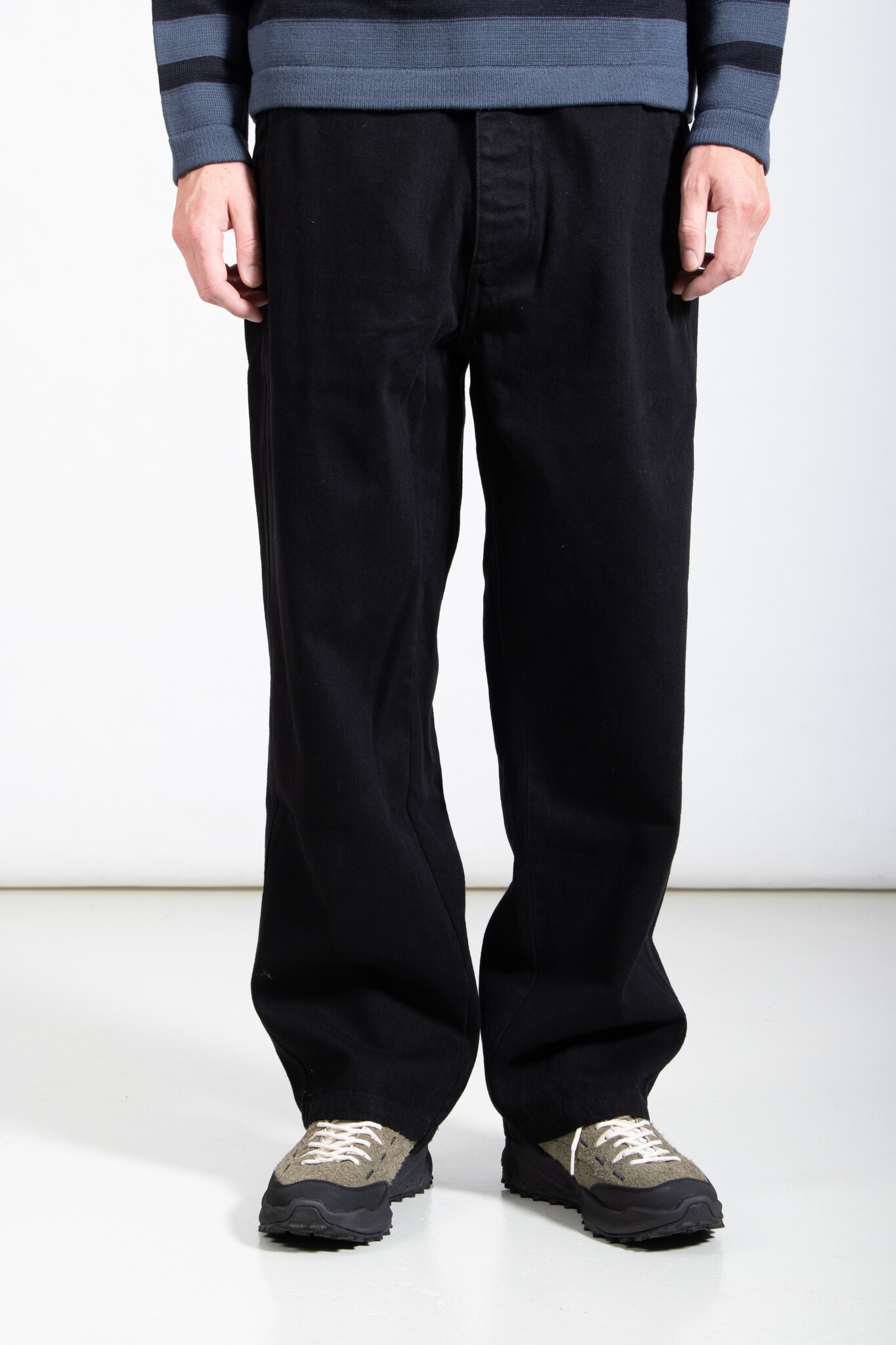 Schwerer Denim von Parages, hergestellt aus Bio-Baumwolle. Das Modell ist recht weit geschnitten und verjüngt sich leicht. Unser Modell ist 189 cm groß und trägt Größe 32. | |
