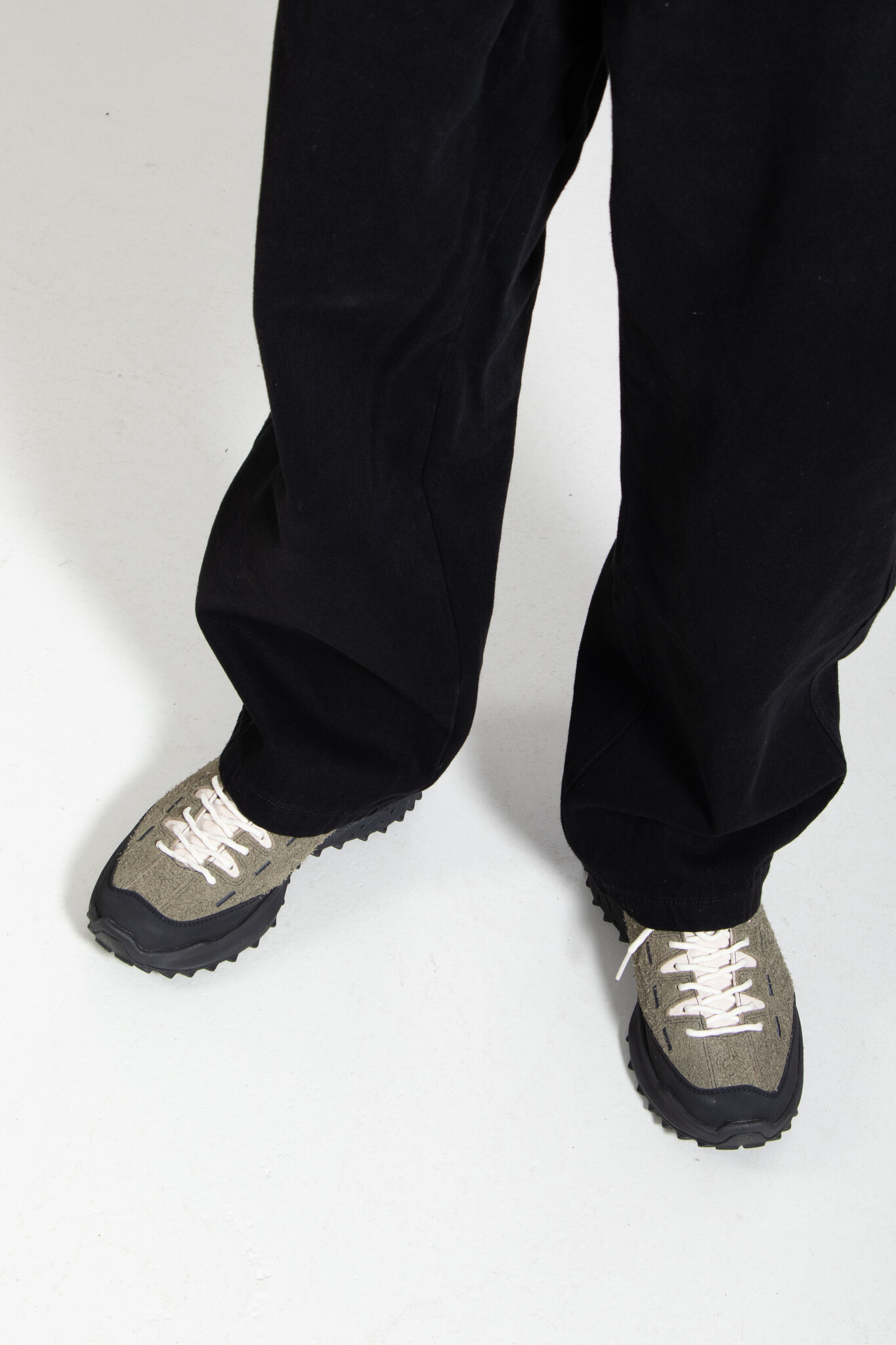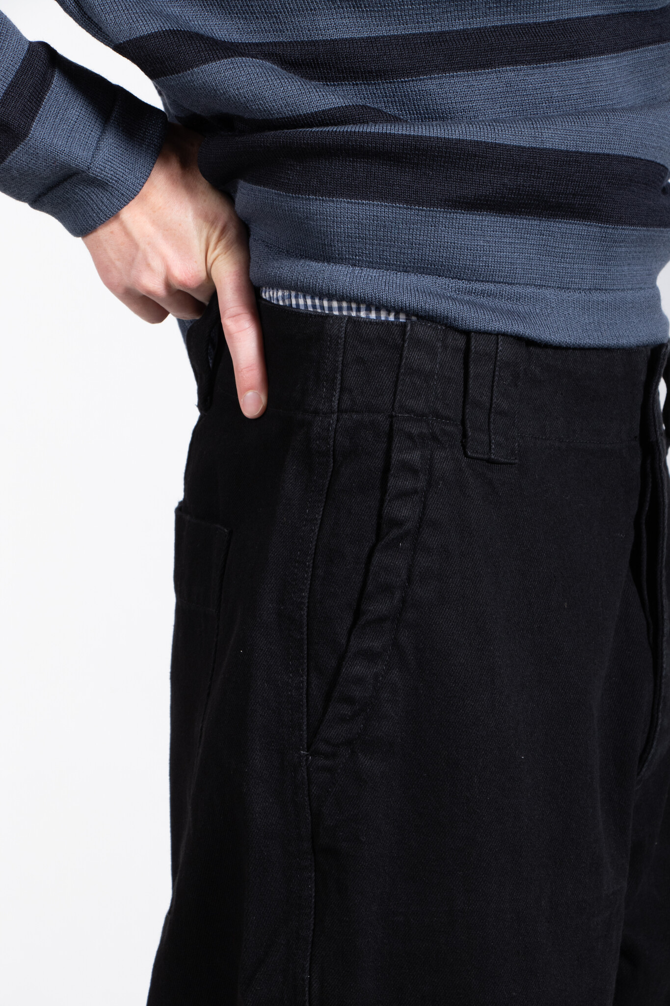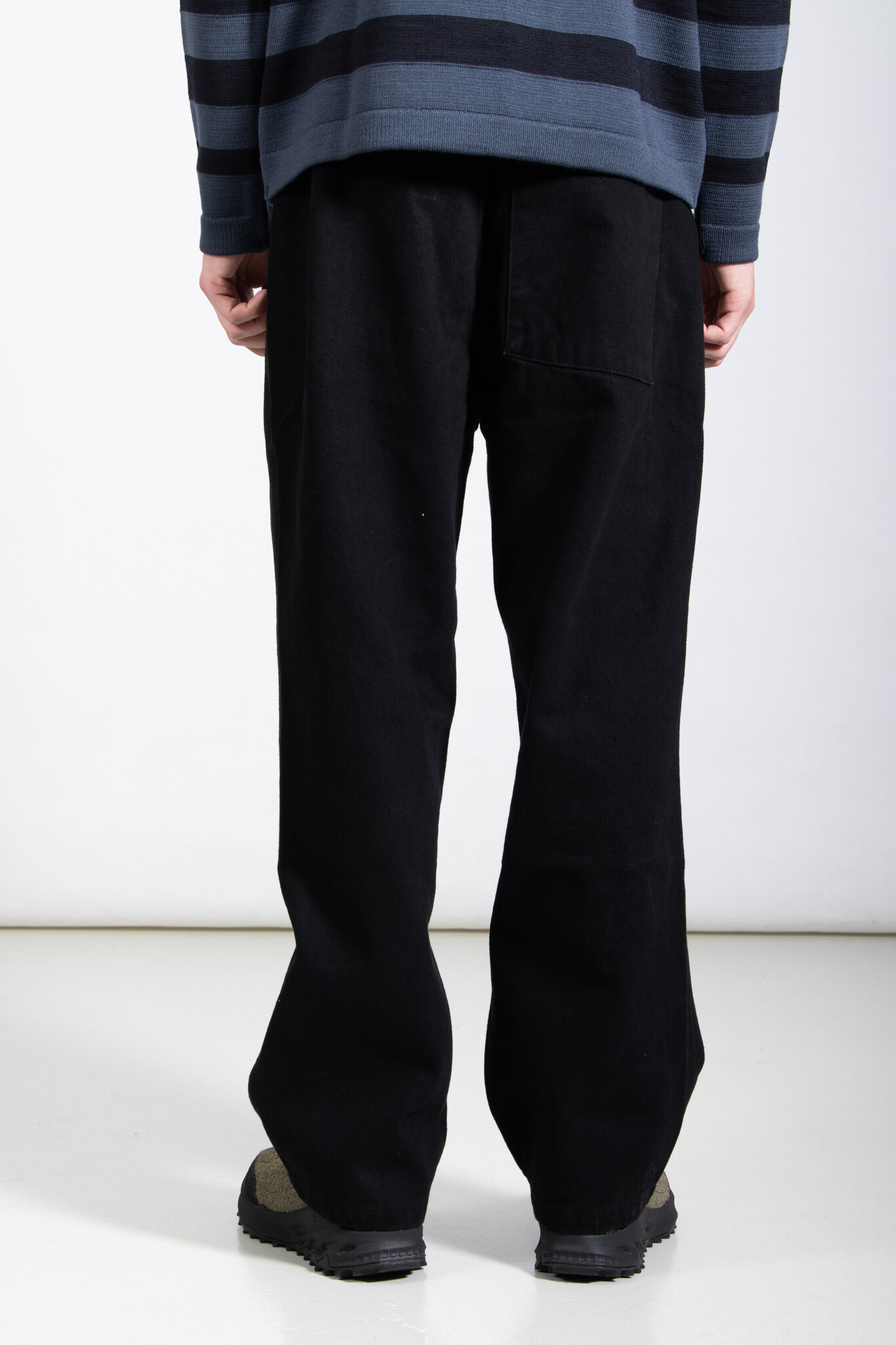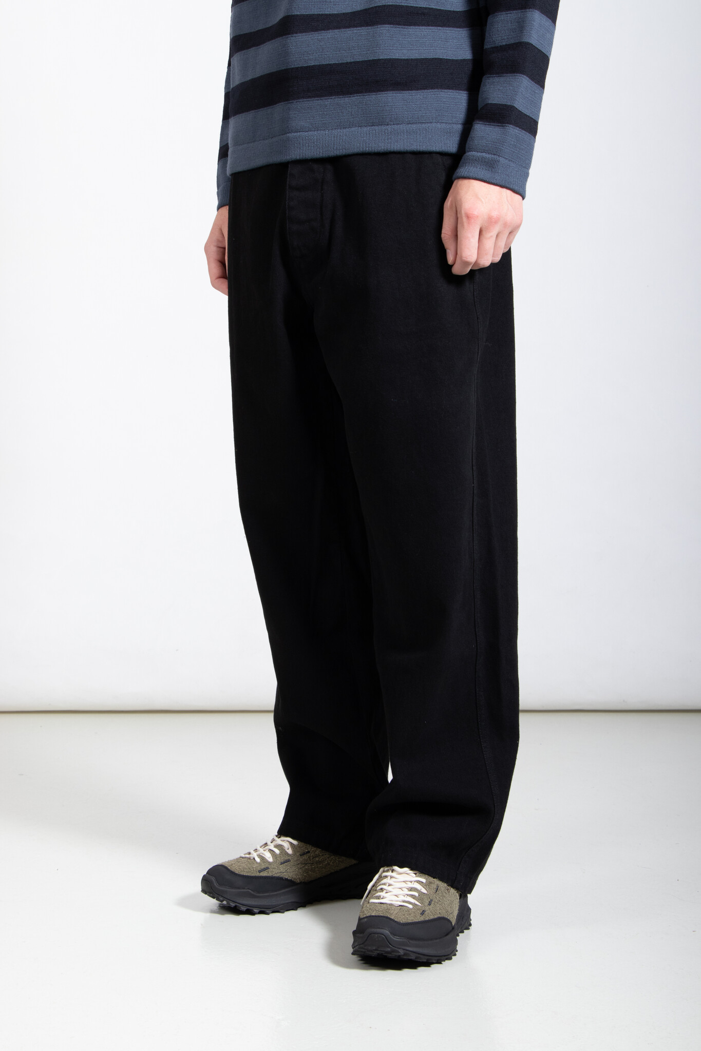 Schwerer Denim von Parages, hergestellt aus Bio-Baumwolle. Das Modell ist recht weit geschnitten und verjüngt sich leicht. Unser Modell ist 189 cm groß und trägt Größe 32. | |