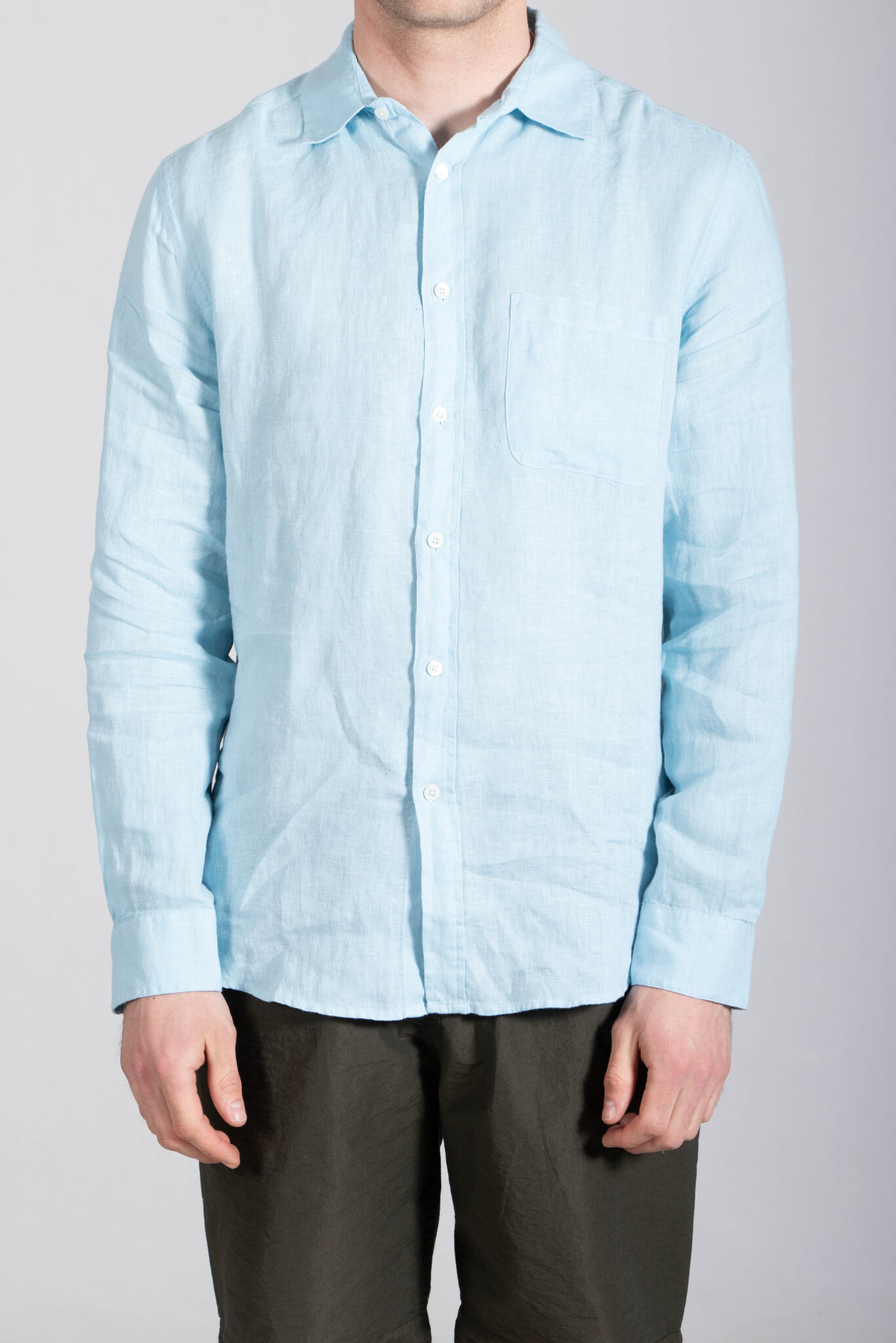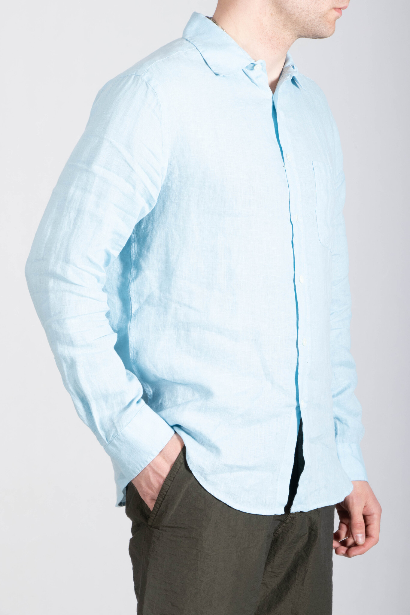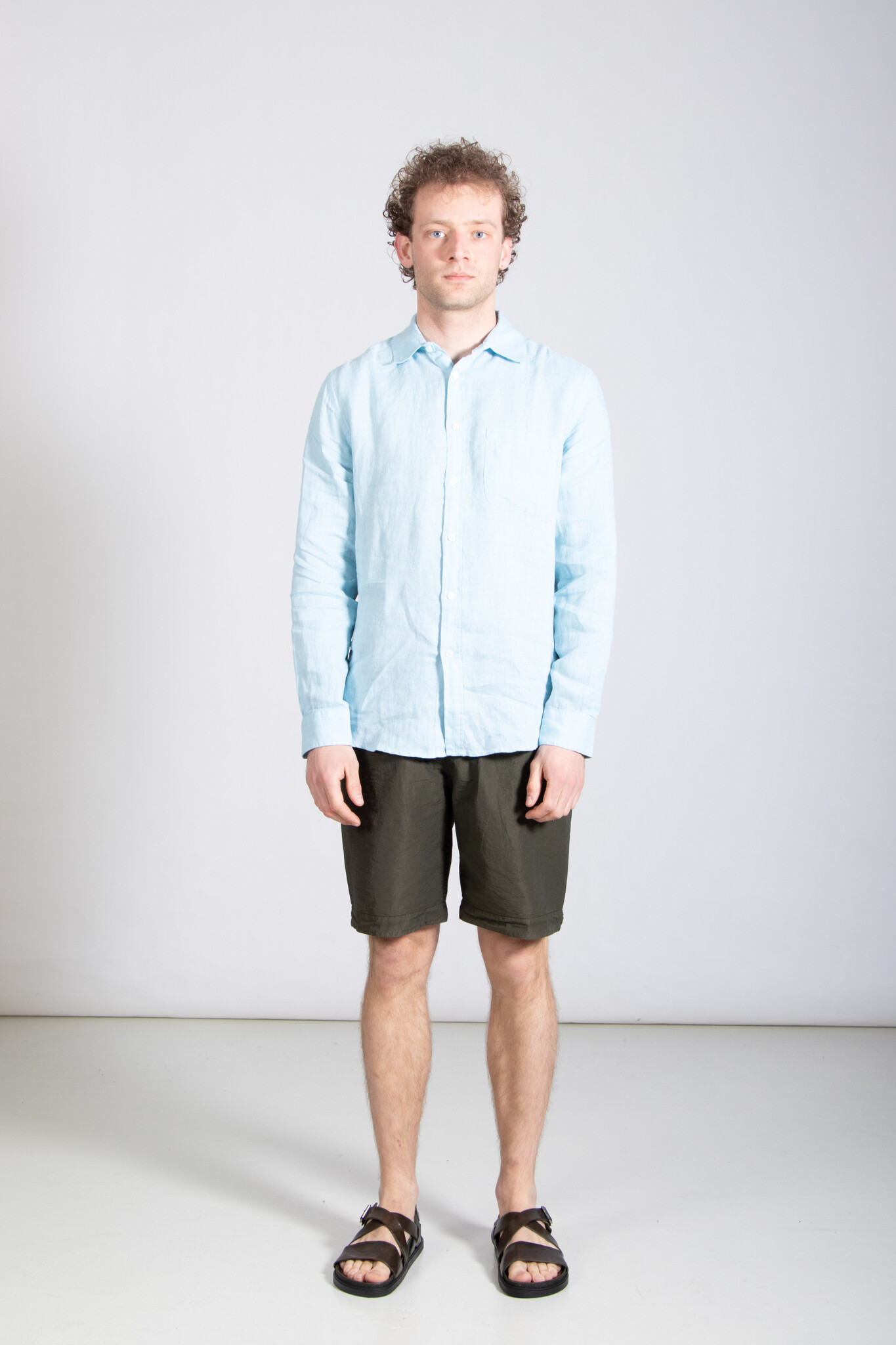 Leinenhemd von Portuguese Flannel mit langen Ärmeln. Hergestellt in Portugal aus einem portugiesischen Stoff. Unser Model ist 189 cm groß und trägt Größe L. Lesen Sie mehr