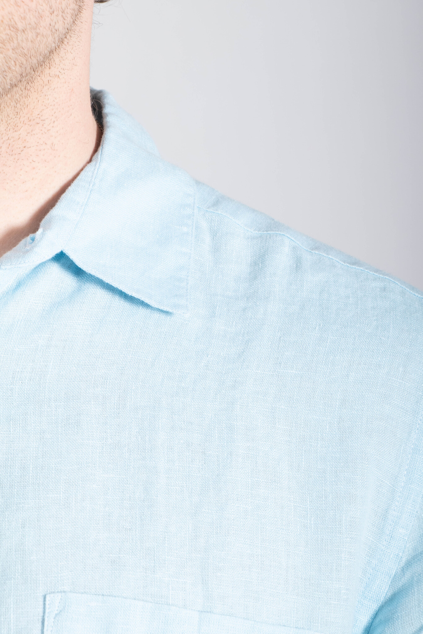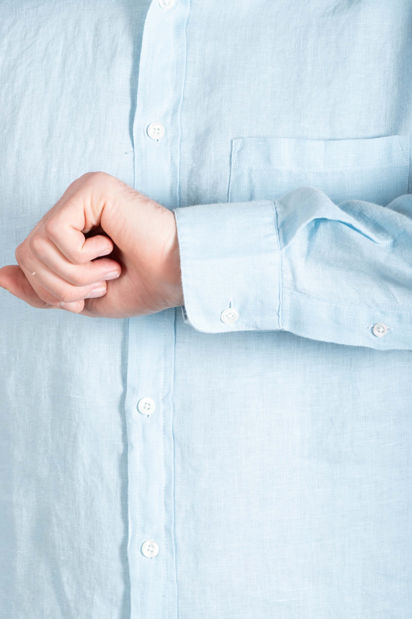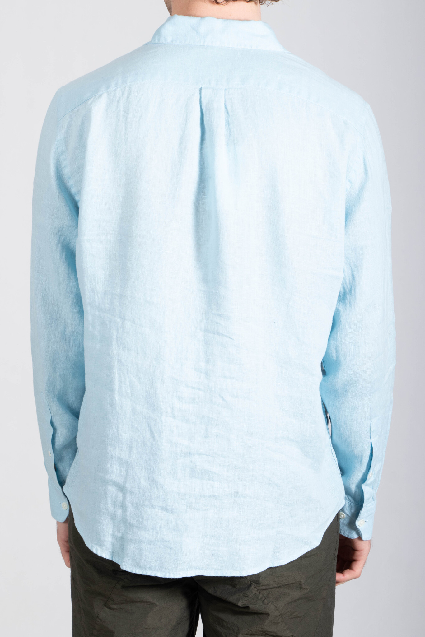 Leinenhemd von Portuguese Flannel mit langen Ärmeln. Hergestellt in Portugal aus einem portugiesischen Stoff. Unser Model ist 189 cm groß und trägt Größe L. Lesen Sie mehr