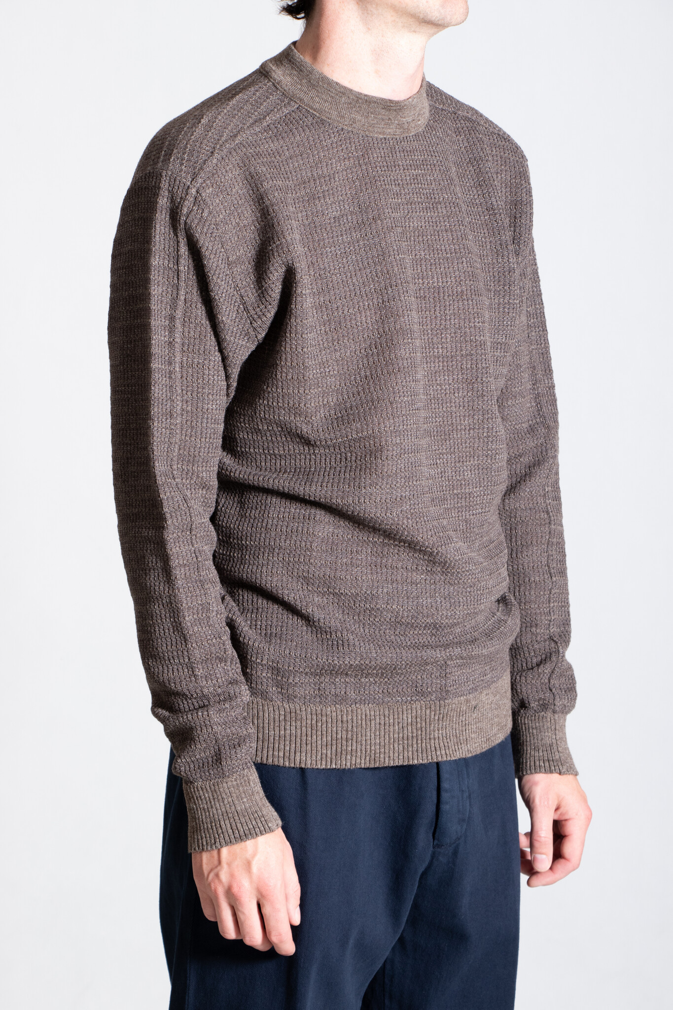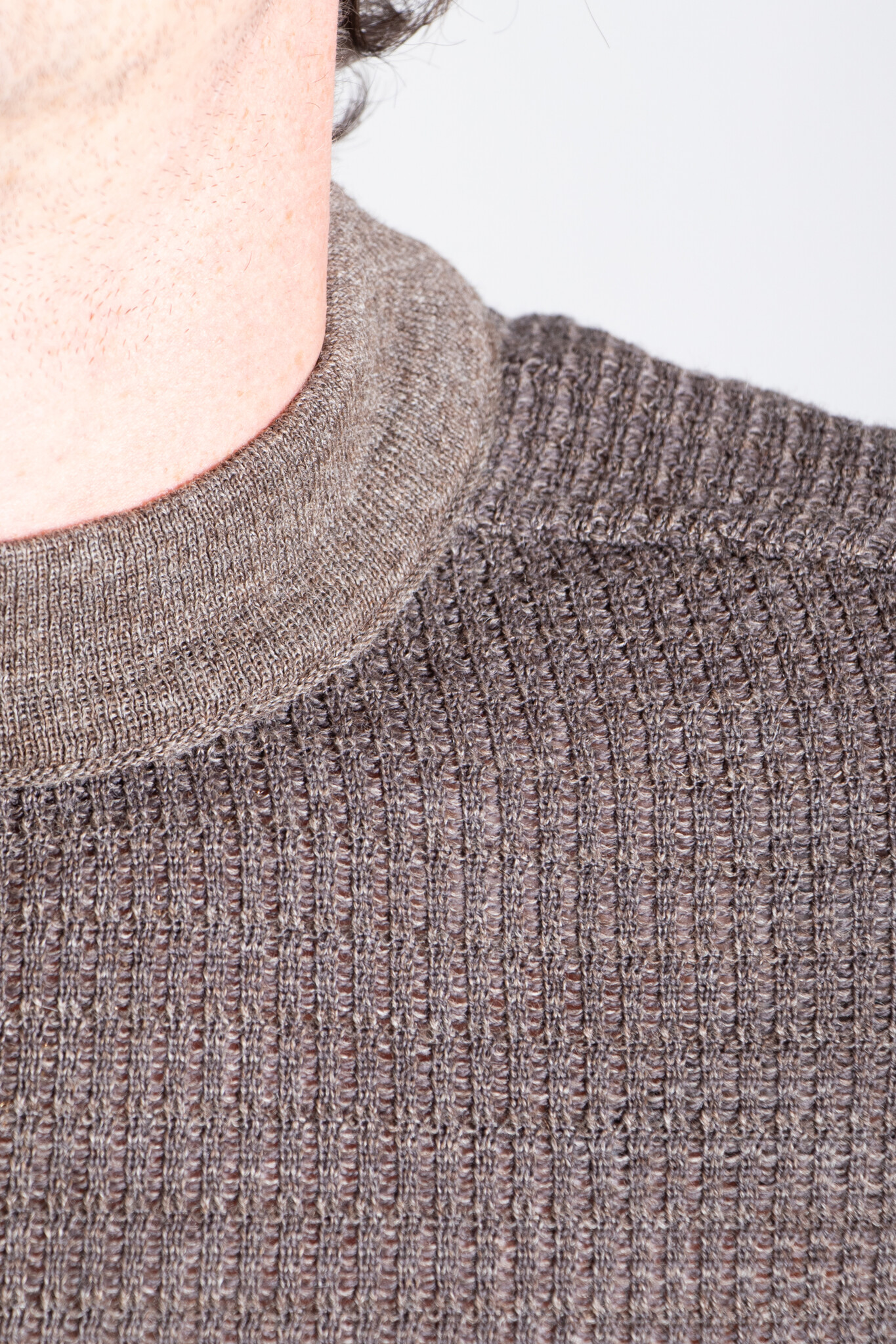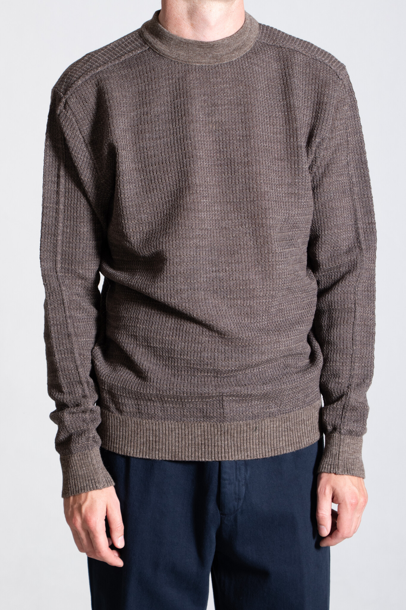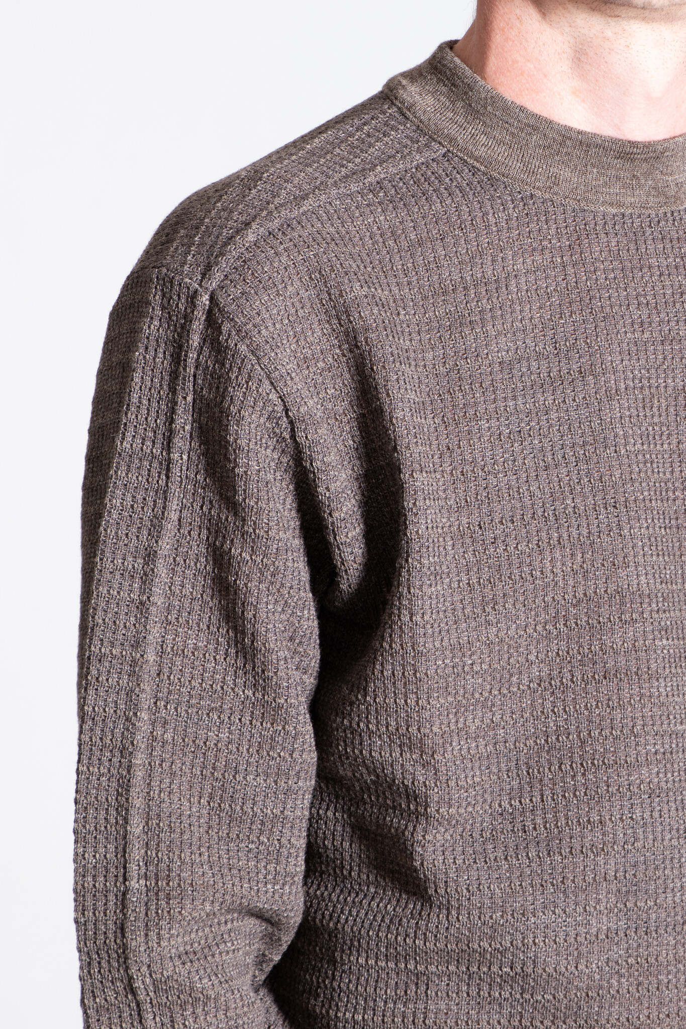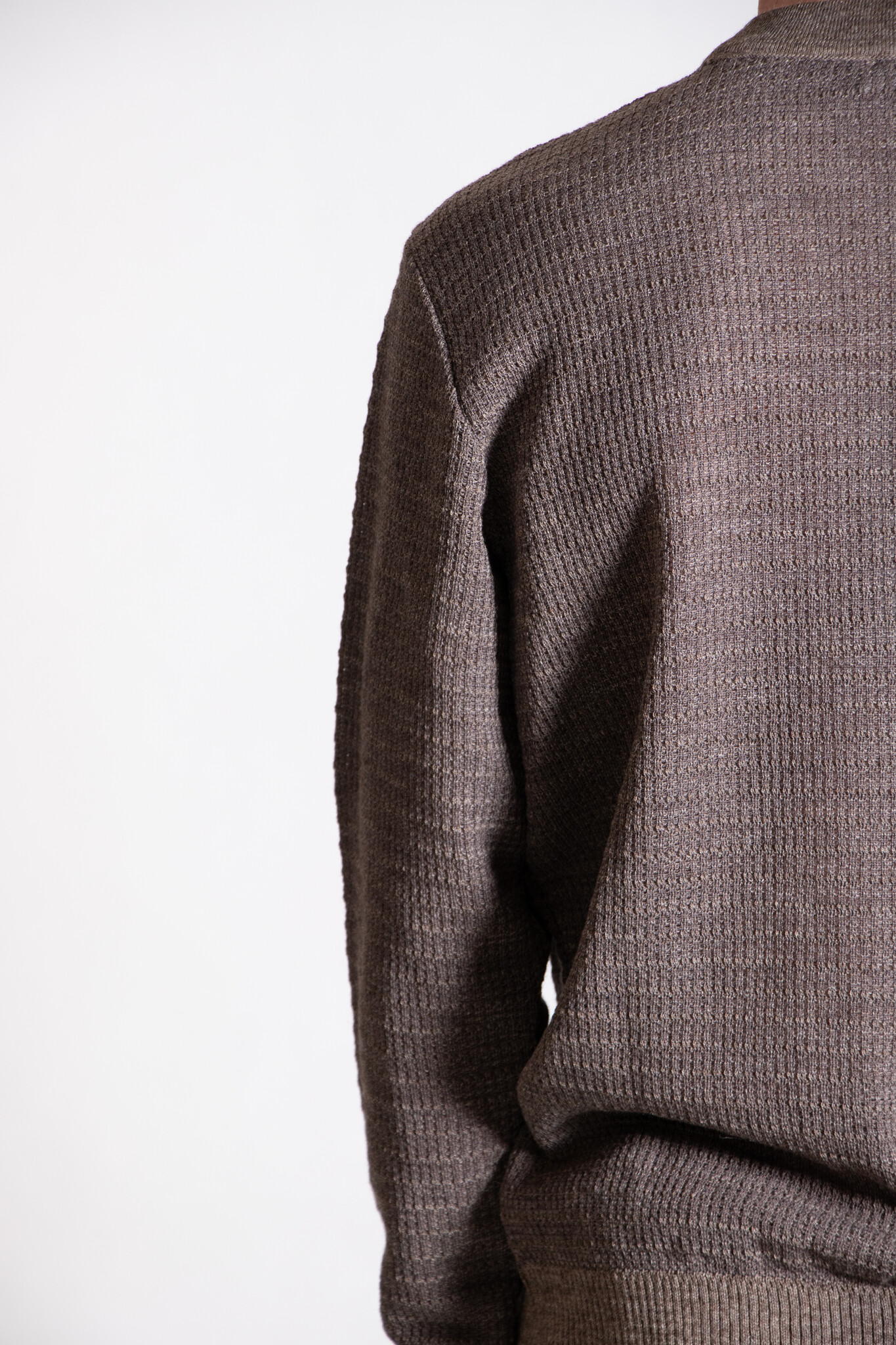 S.N.S. Herning Pullover aus Dänemark. Gestrickt aus Merinowolle mit einem kleinen rechteckigen Muster. Unser Model ist 189 cm groß und trägt Größe L. | |