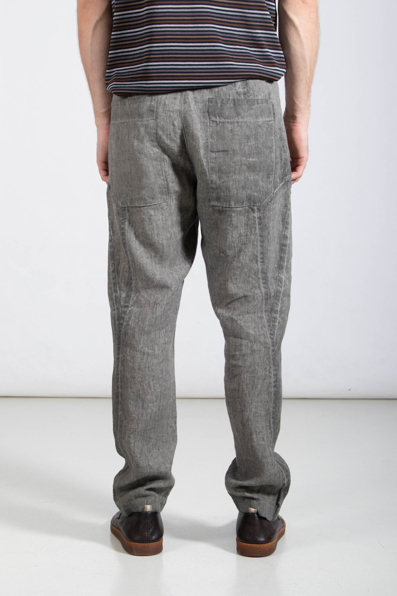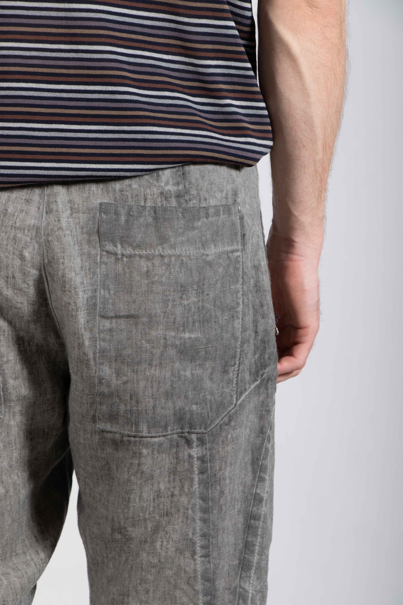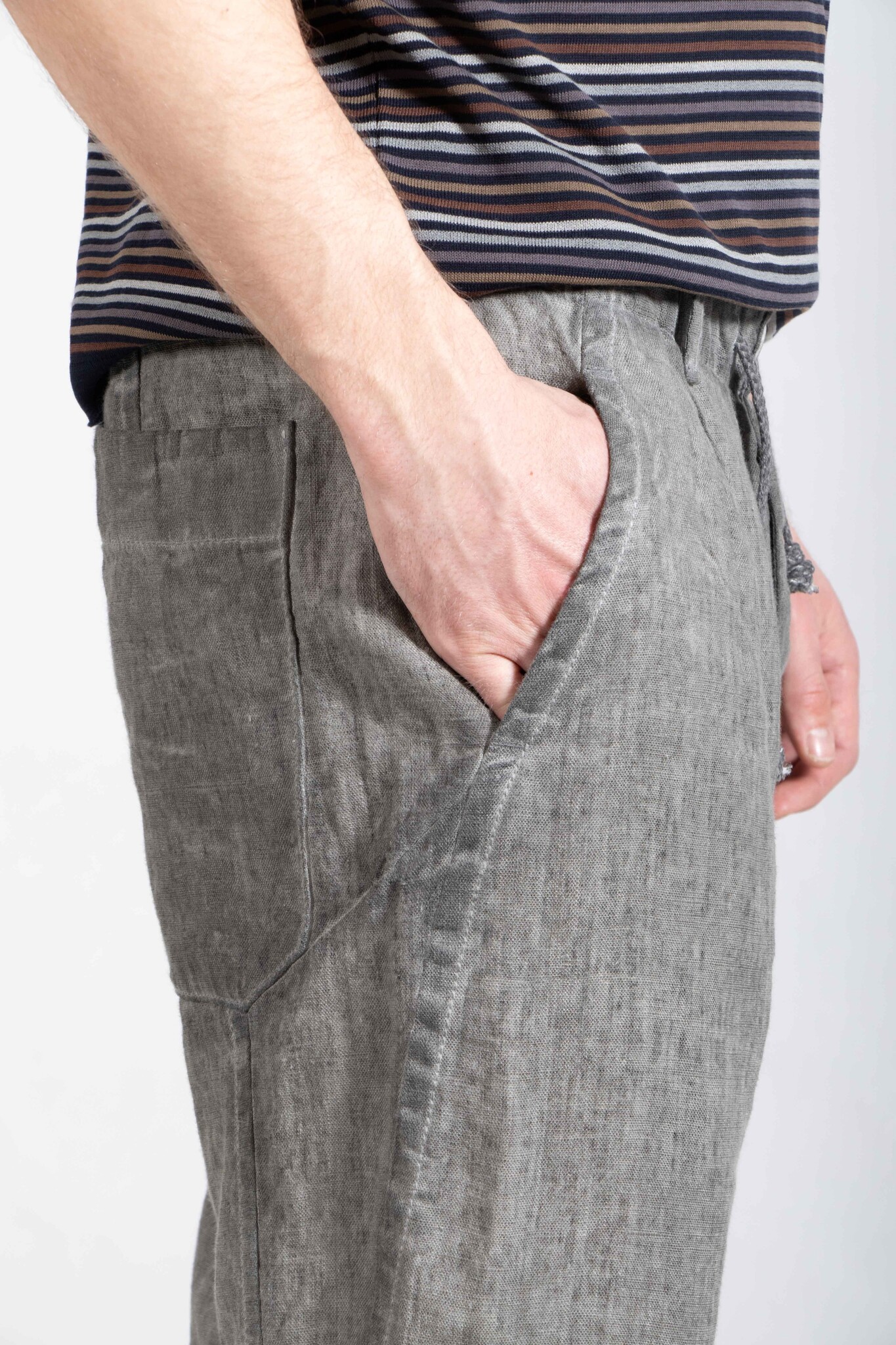 | Hose von Transit, hergestellt in Italien aus schwerem, kaltgefärbtem Leinen-Canvas. Ausgestattet mit einem natürlichen Leinenschnürzug. Unser Model ist 189 cm groß und trägt Größe M. | |