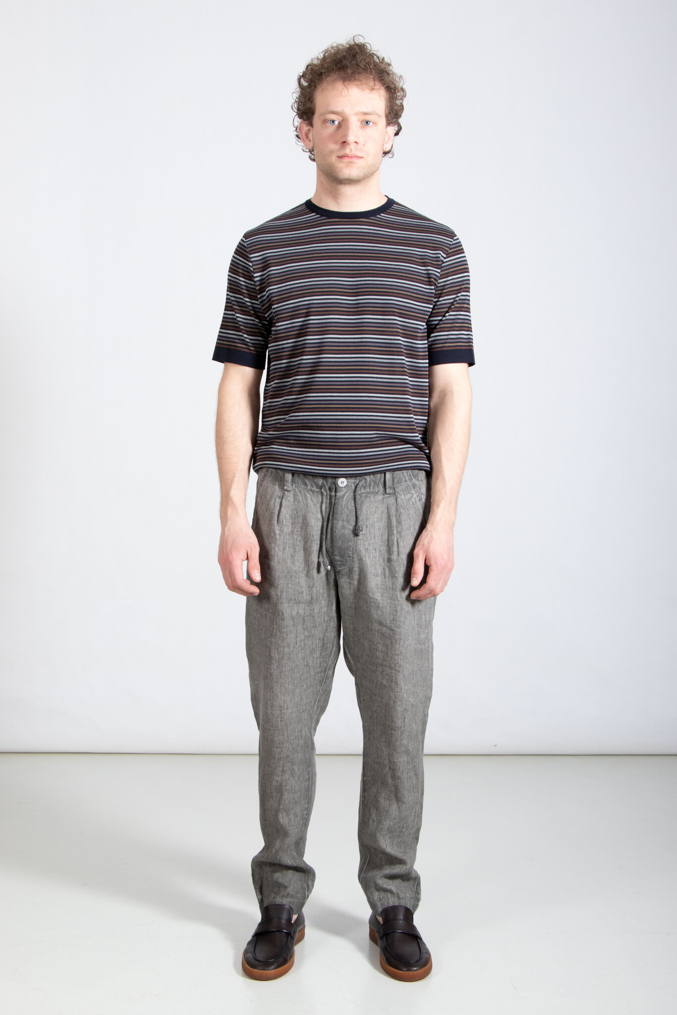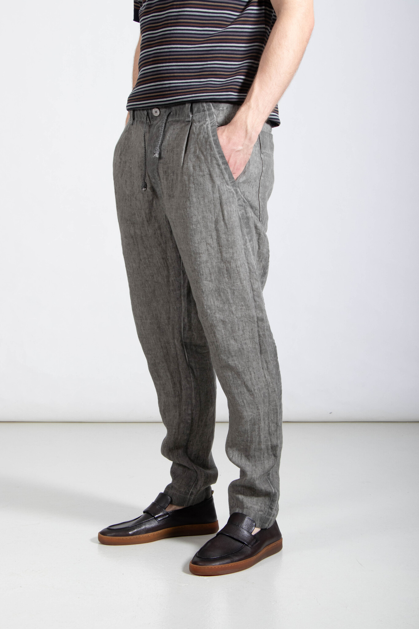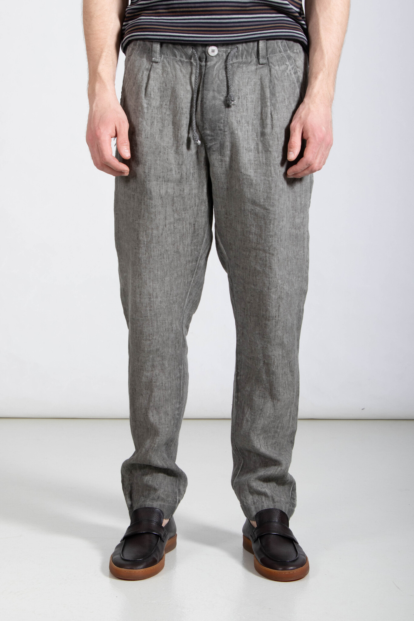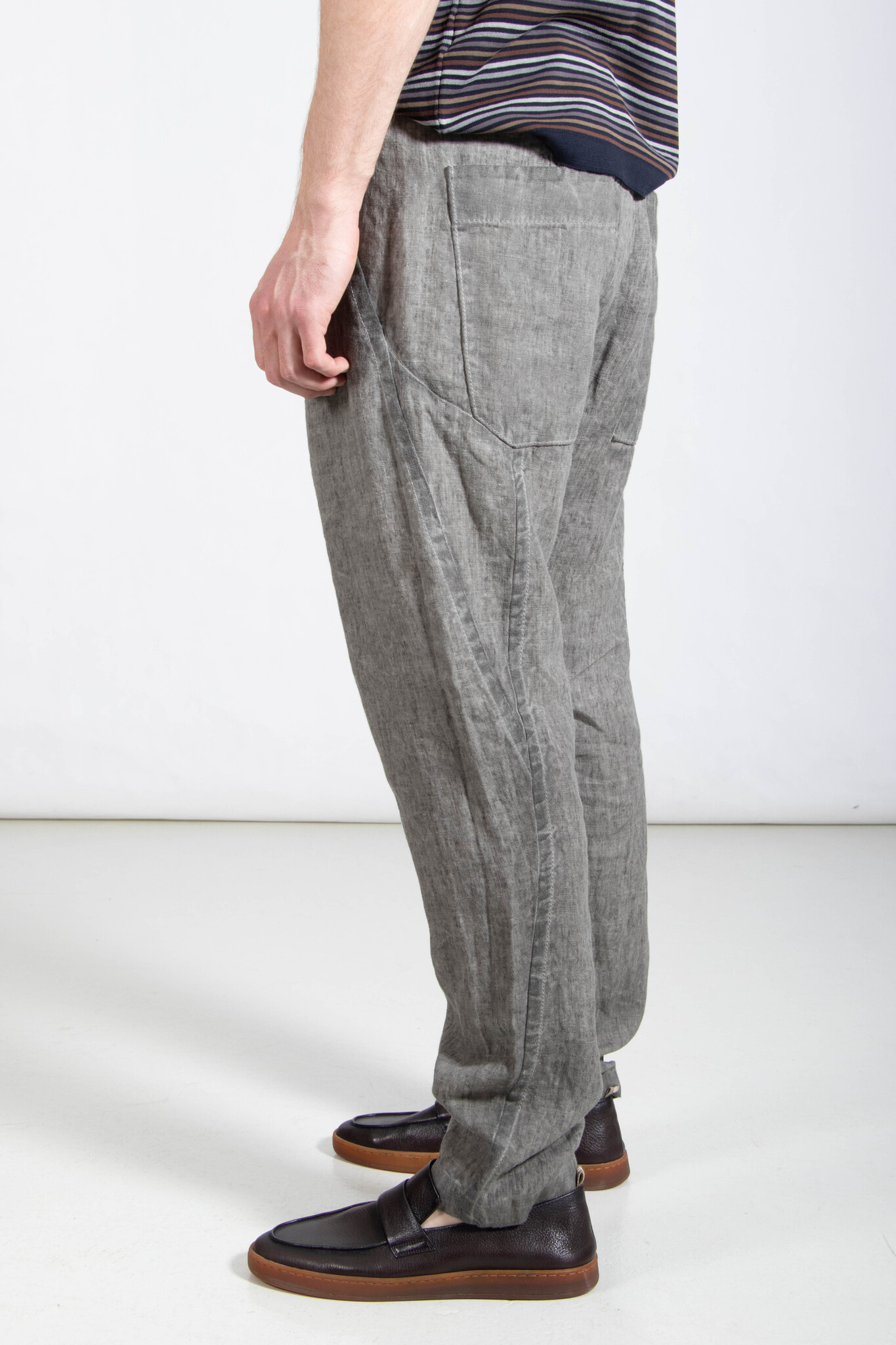| Hose von Transit, hergestellt in Italien aus schwerem, kaltgefärbtem Leinen-Canvas. Ausgestattet mit einem natürlichen Leinenschnürzug. Unser Model ist 189 cm groß und trägt Größe M. | |