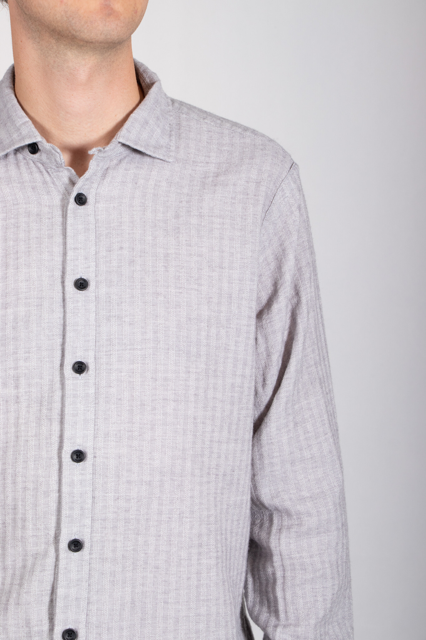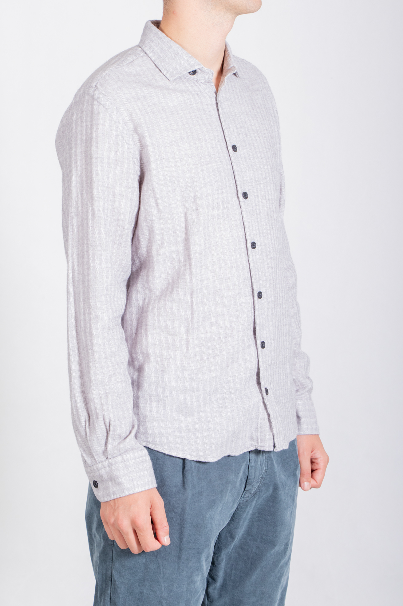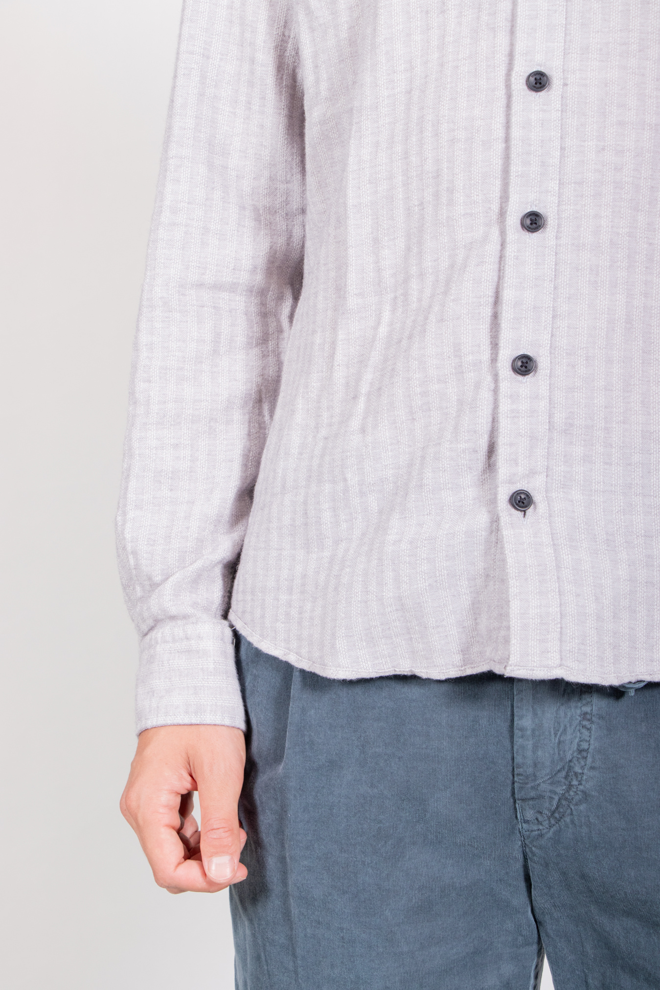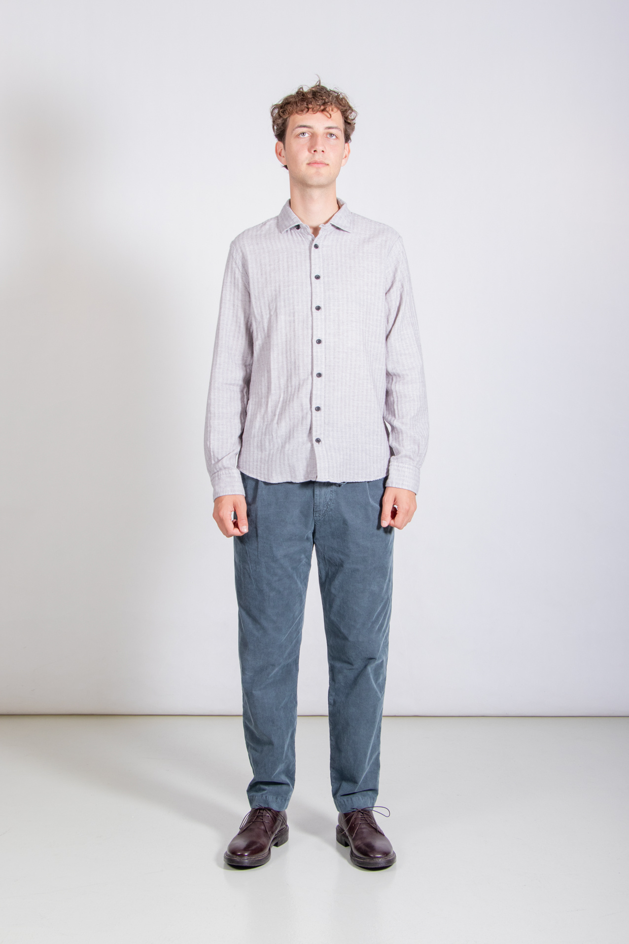 Soft shirt by Hannes Roether, made of cotton and wool. The fabric has a subtle stripe pattern. Our model is 192 cm tall and wears size L. Read more