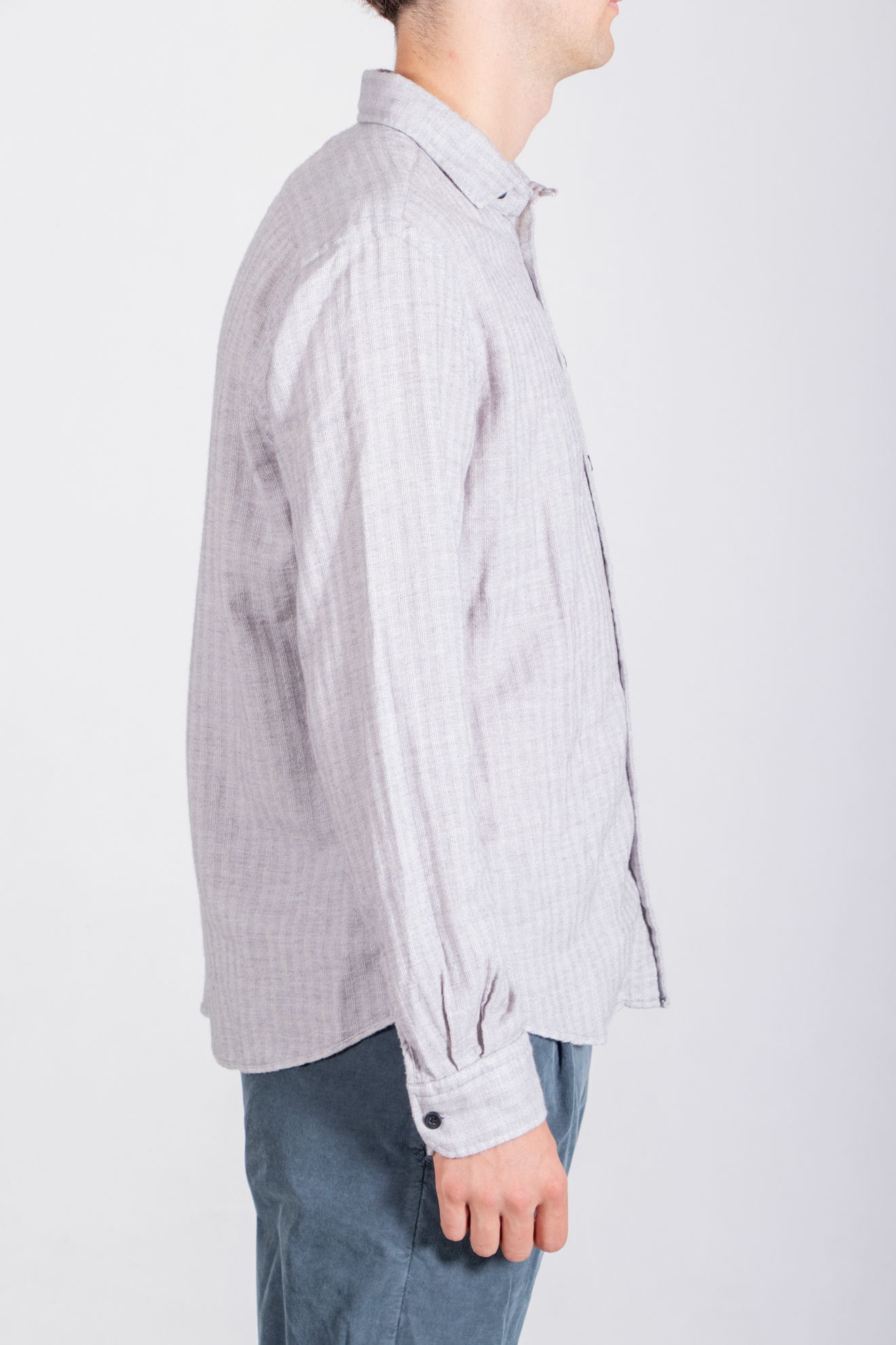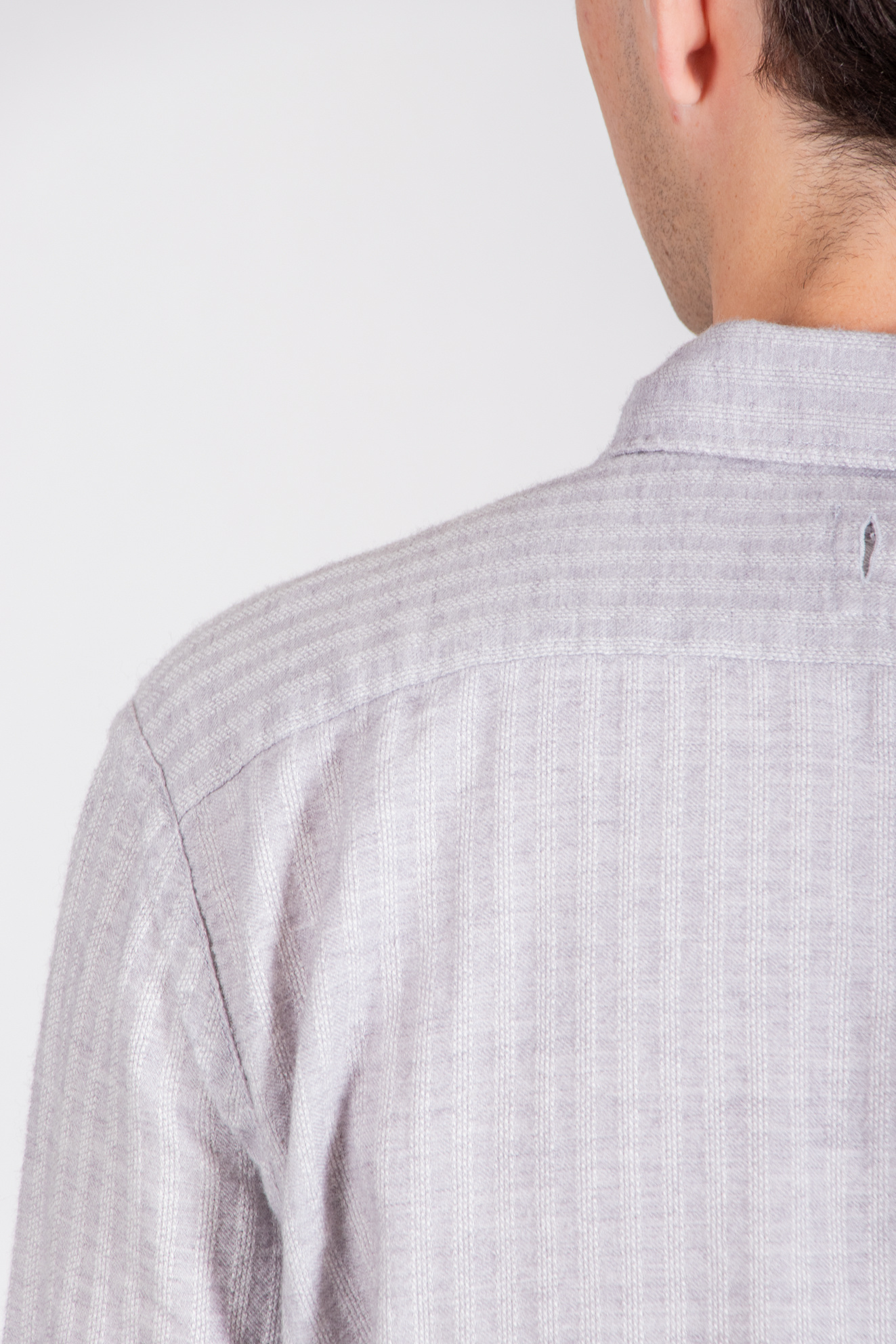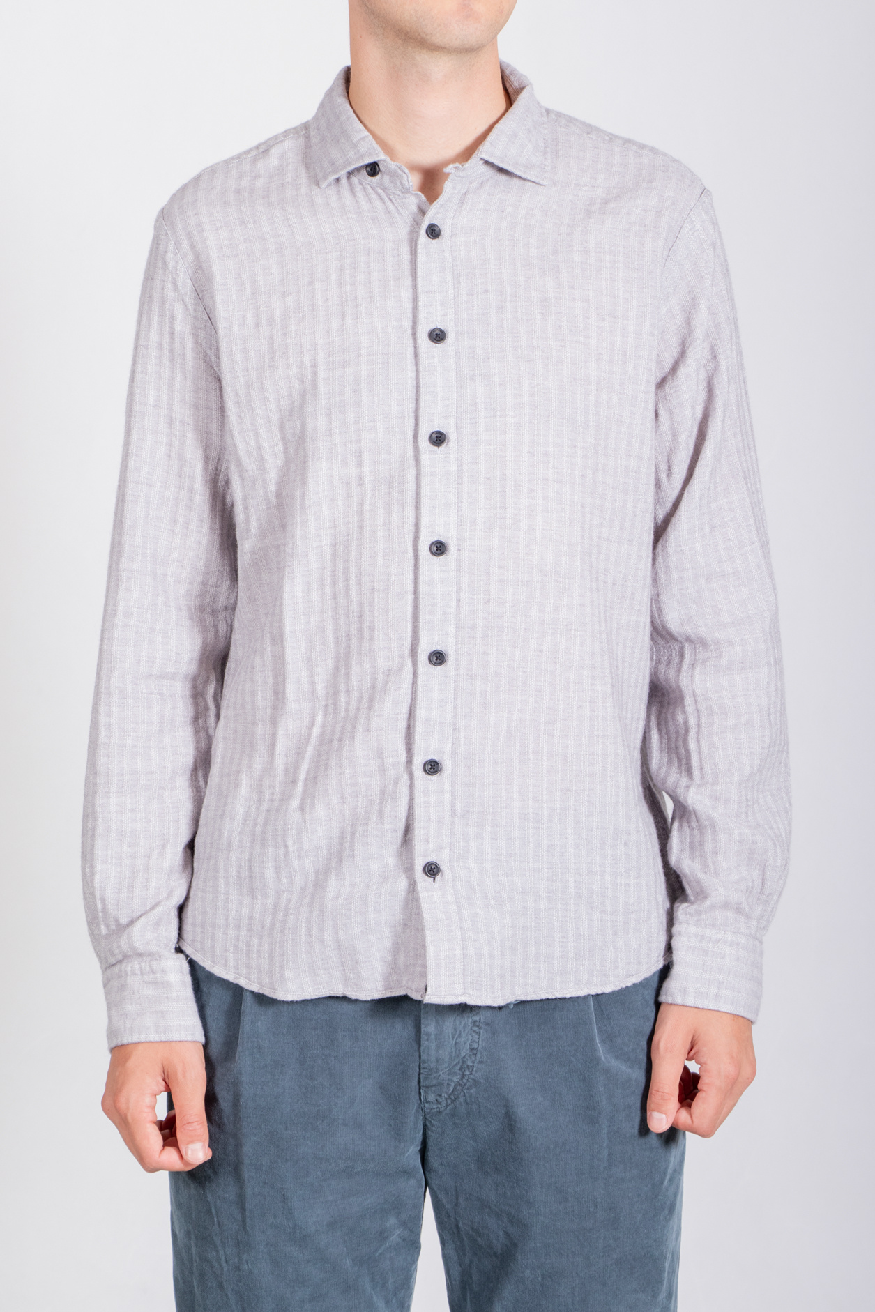 Soft shirt by Hannes Roether, made of cotton and wool. The fabric has a subtle stripe pattern. Our model is 192 cm tall and wears size L. Read more