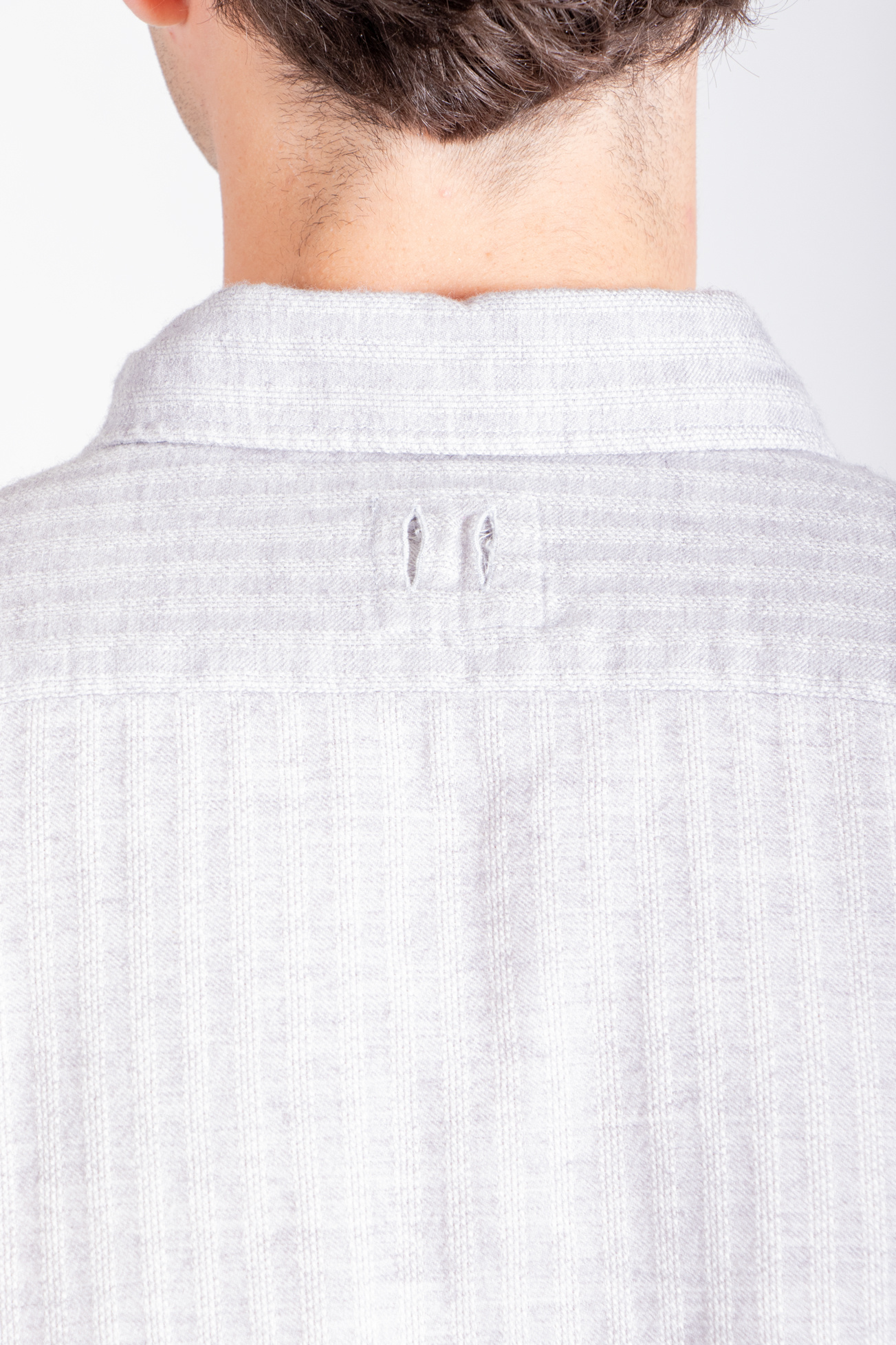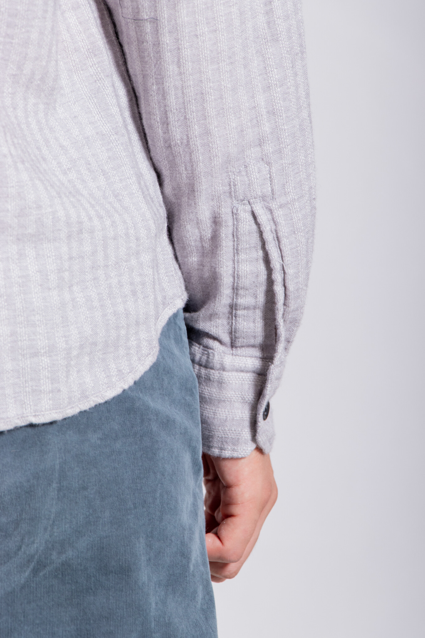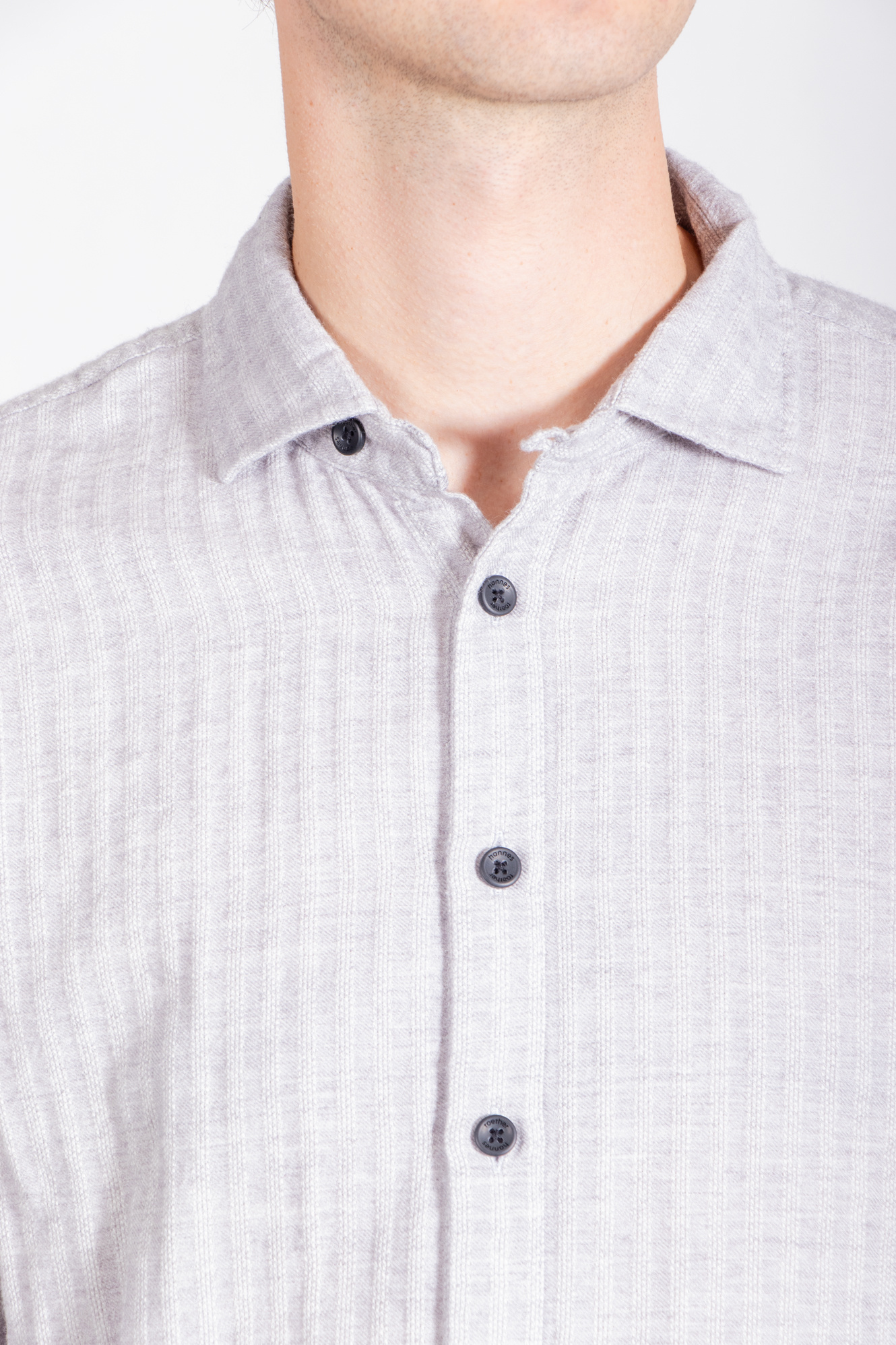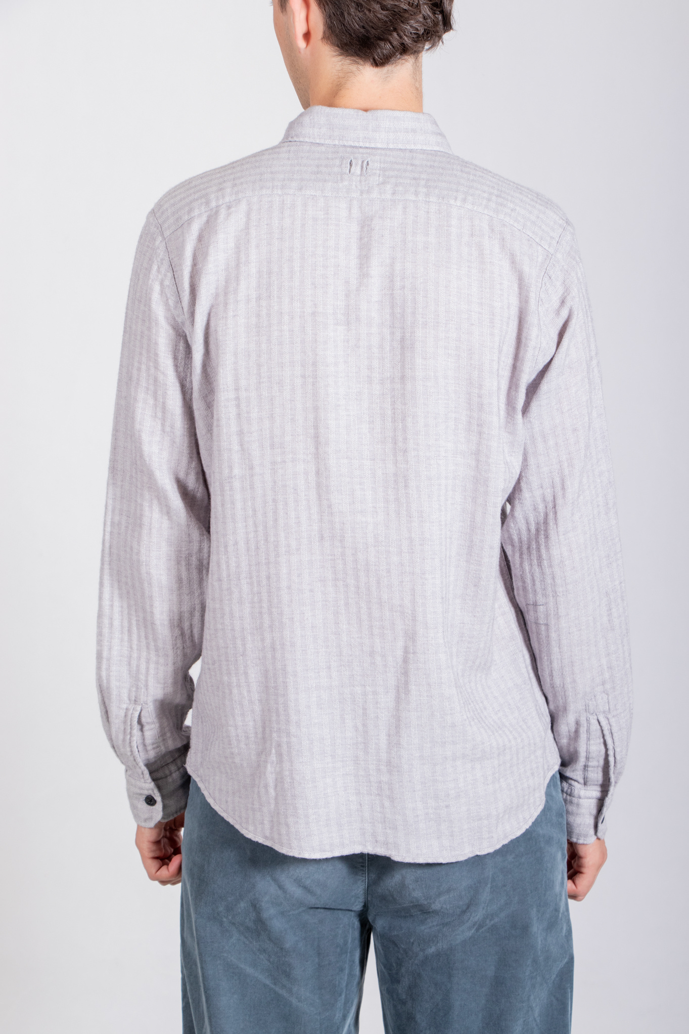 Soft shirt by Hannes Roether, made of cotton and wool. The fabric has a subtle stripe pattern. Our model is 192 cm tall and wears size L. Read more