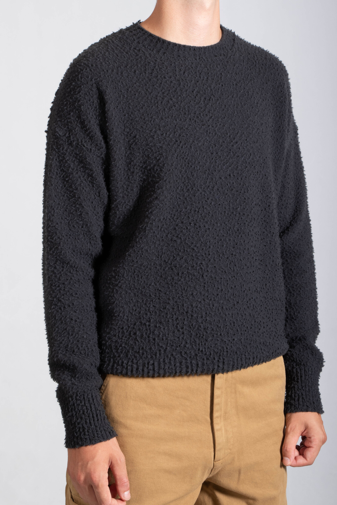 | Wool sweater by Roberto Collina. Strong and soft, made using the so-called “Casentino” treatment, which gives it a sturdy, fluffy texture. Our model is 192 cm tall and wears size 50. | |
