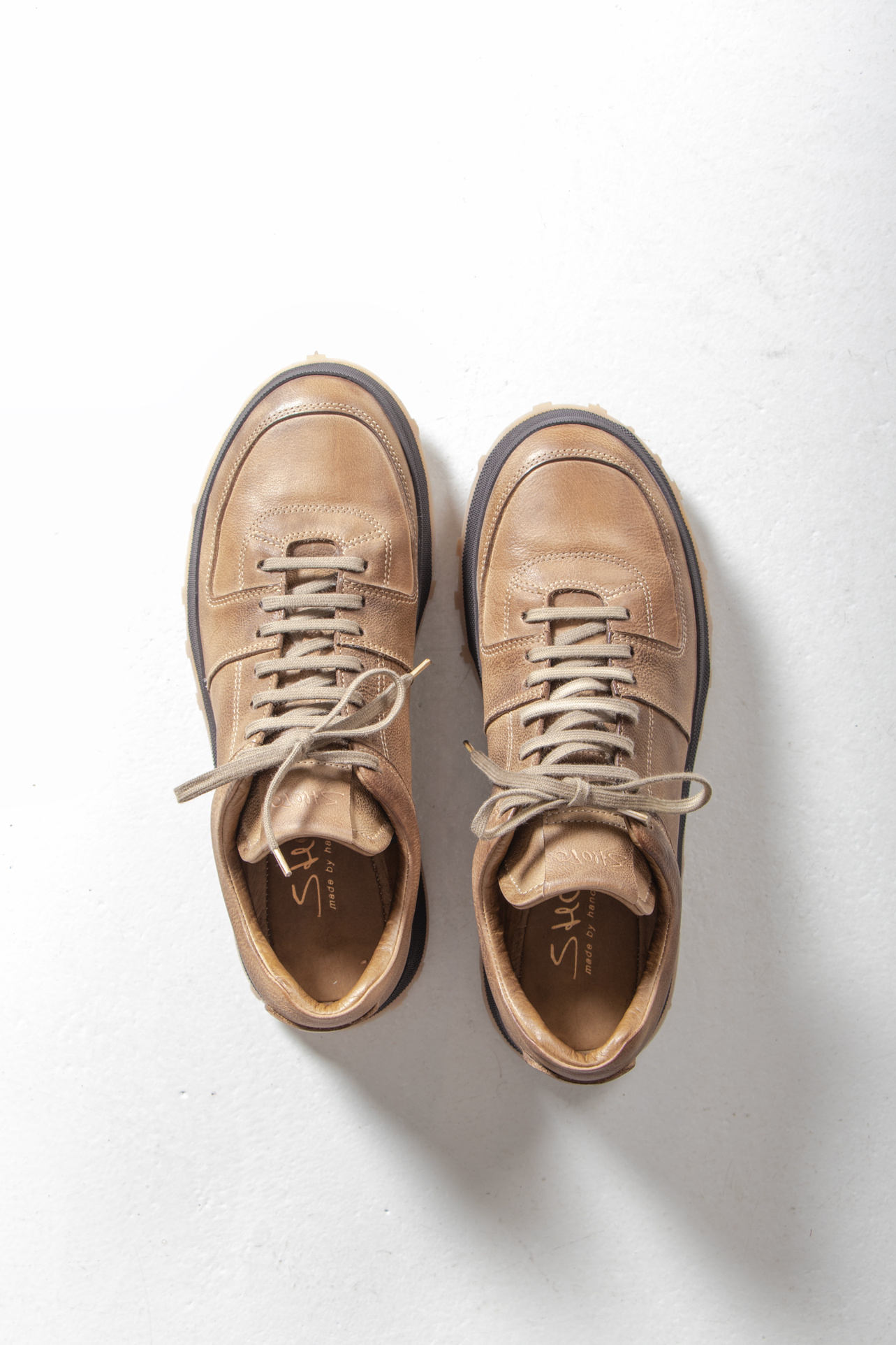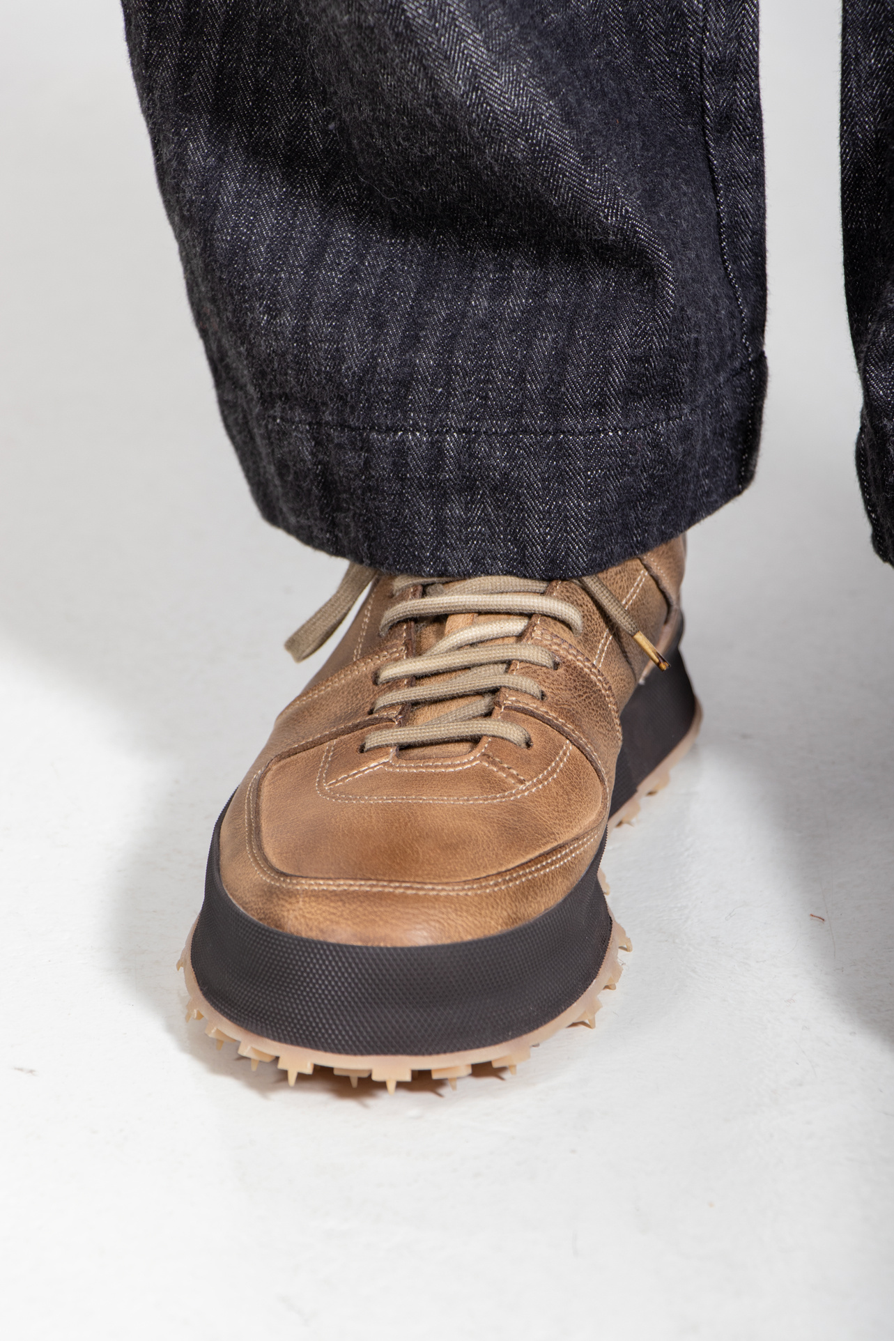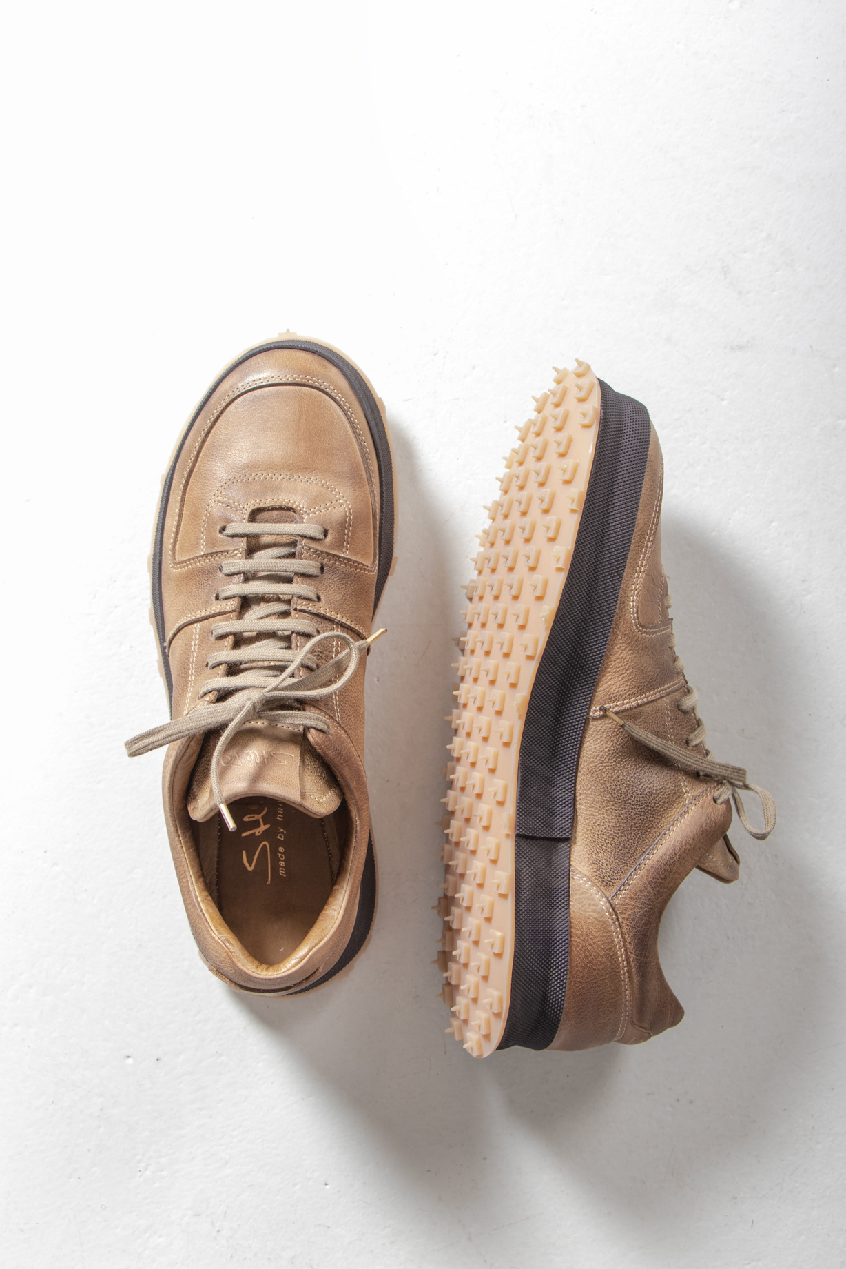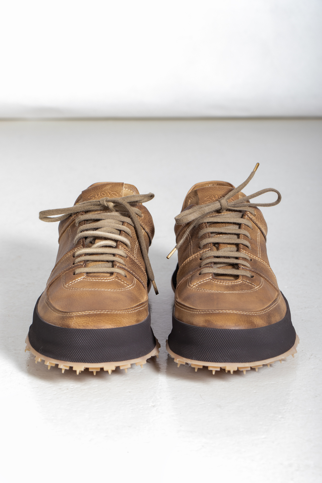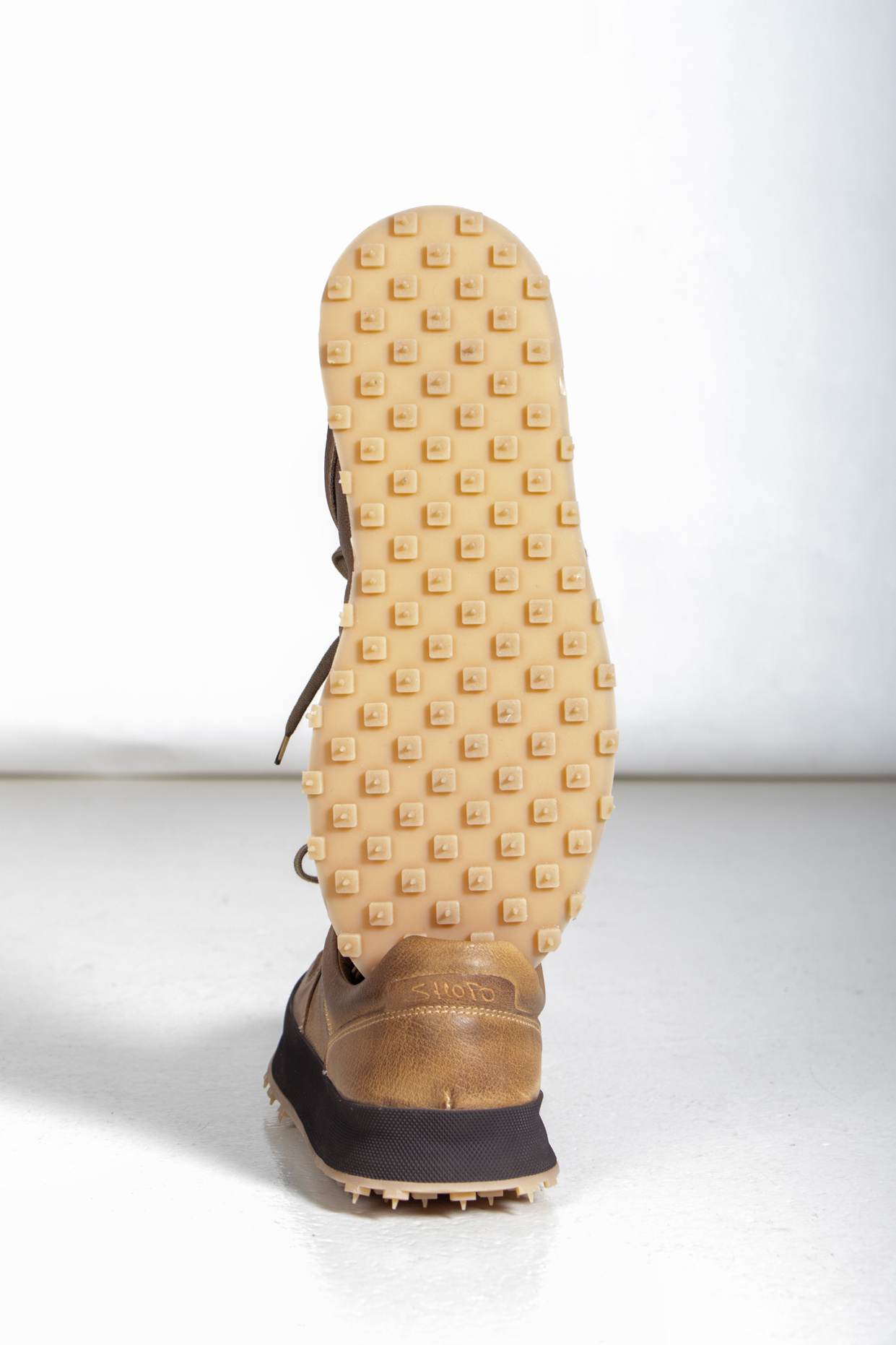 The Italian brand Shoto produces with classic leather in Italy and gives their shoes a unique twist. Multiple layers of leather and a studded sole create a product that sits between a sneaker and a shoe. | |