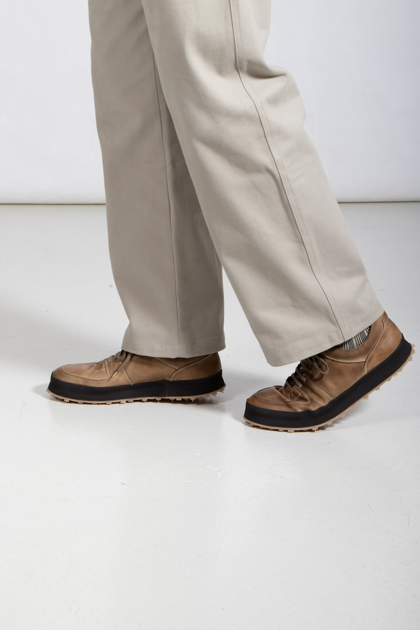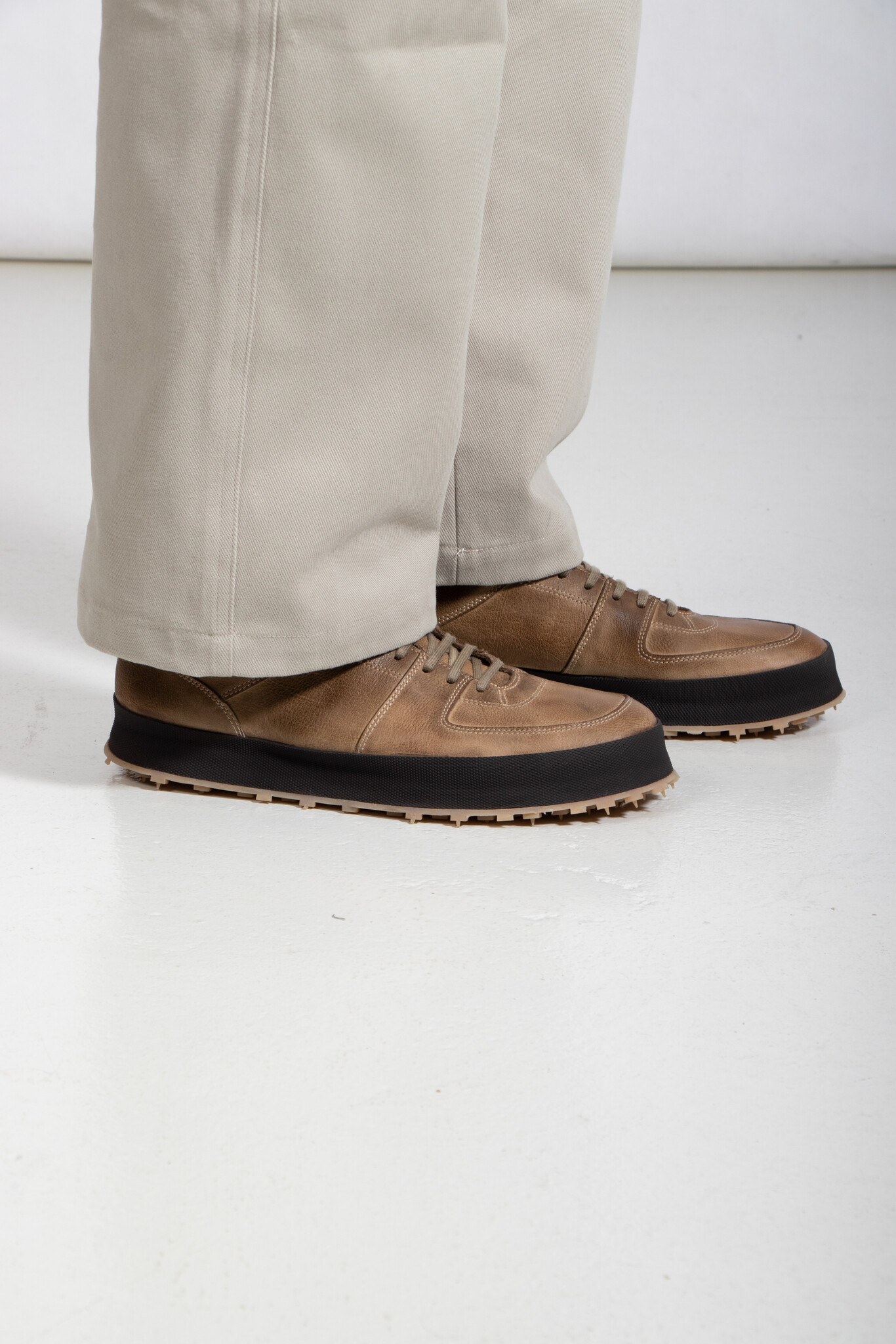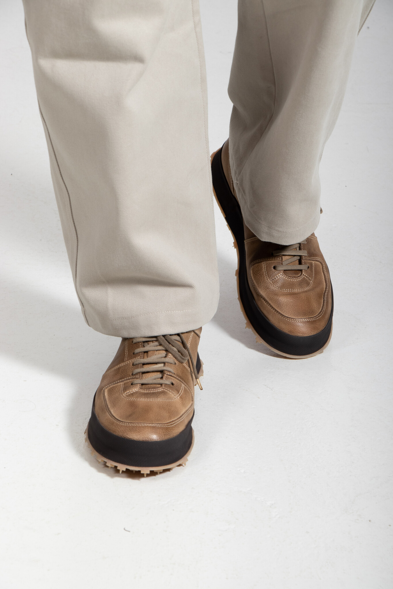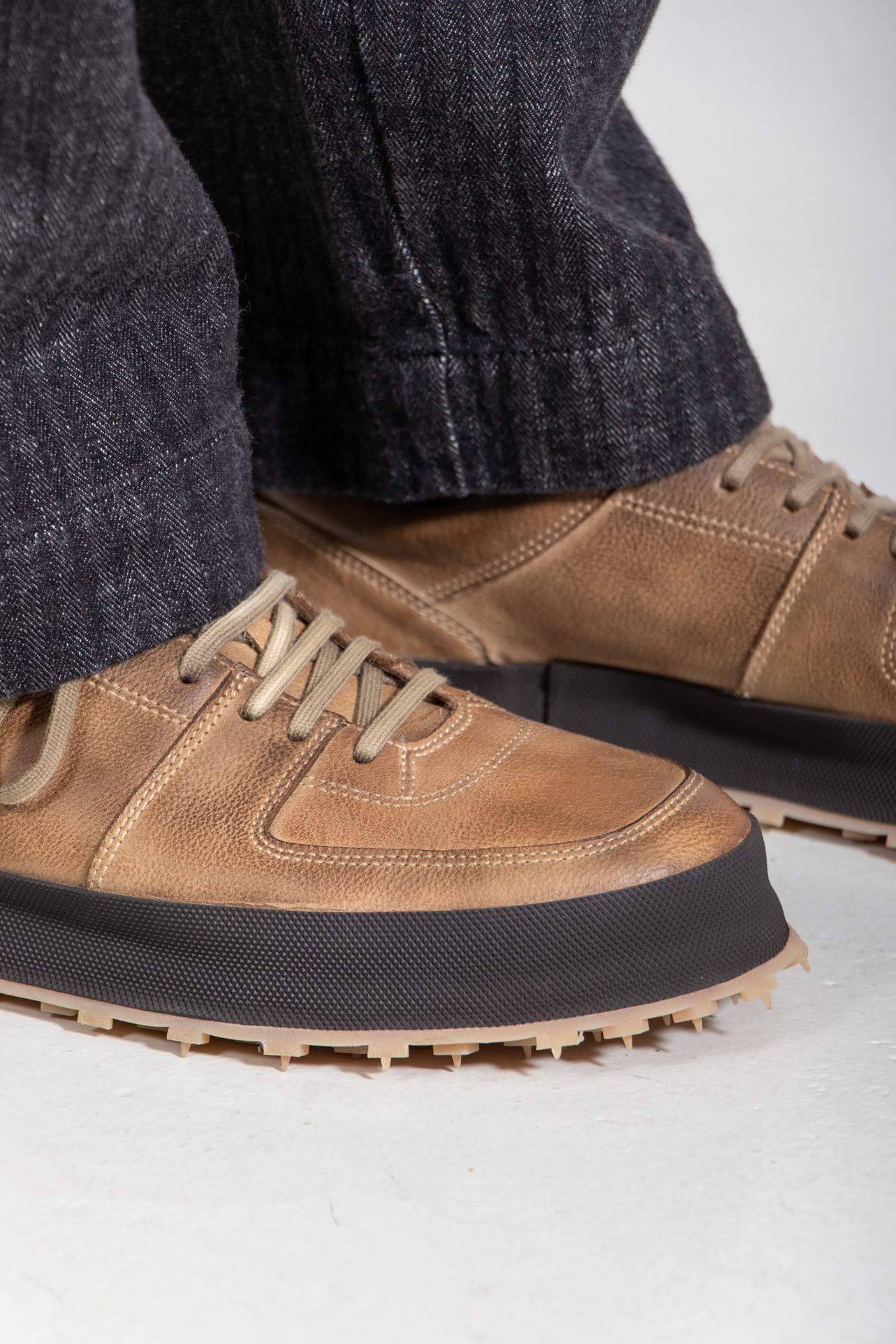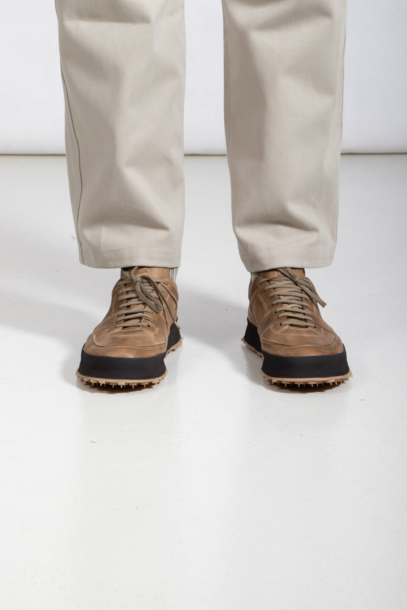 The Italian brand Shoto produces with classic leather in Italy and gives their shoes a unique twist. Multiple layers of leather and a studded sole create a product that sits between a sneaker and a shoe. | |