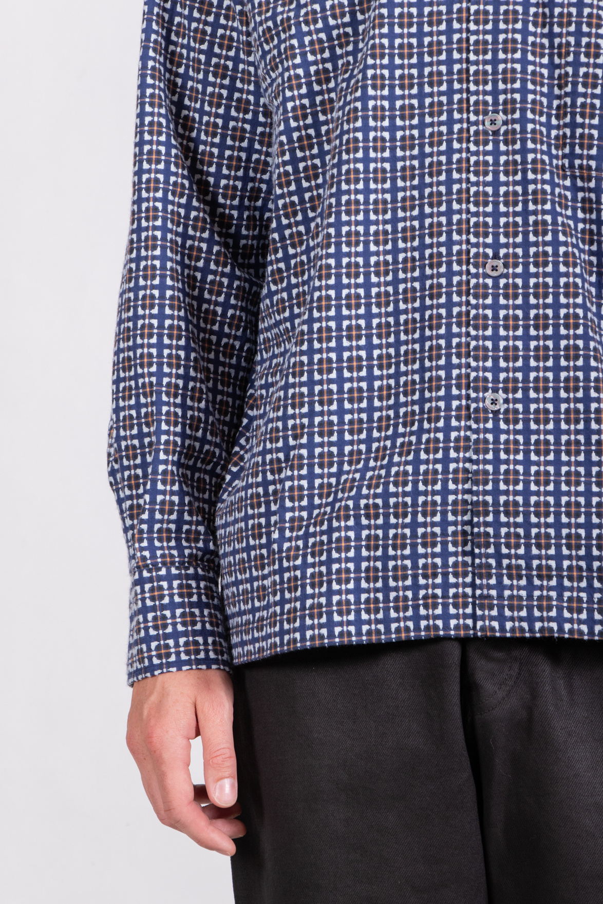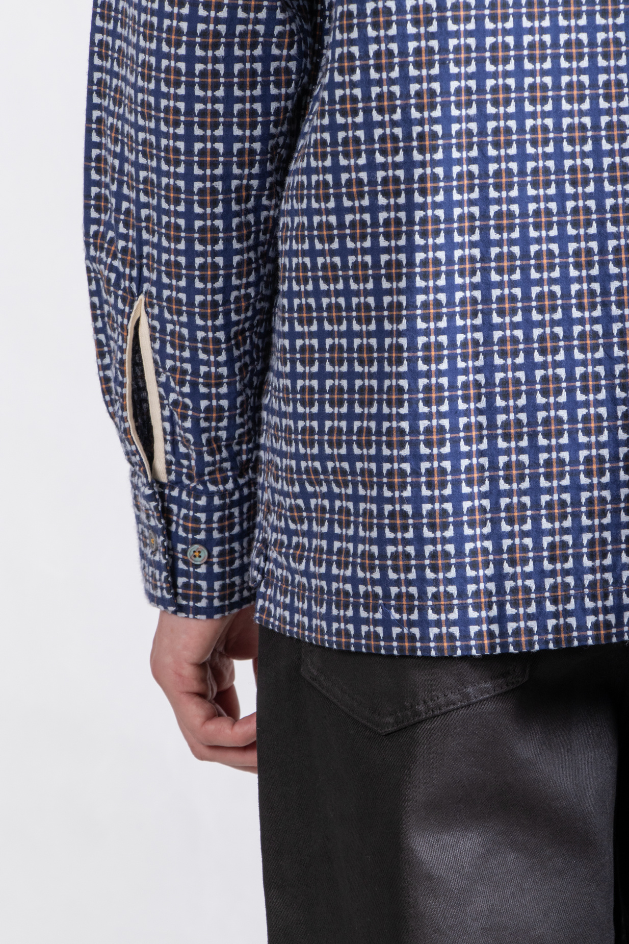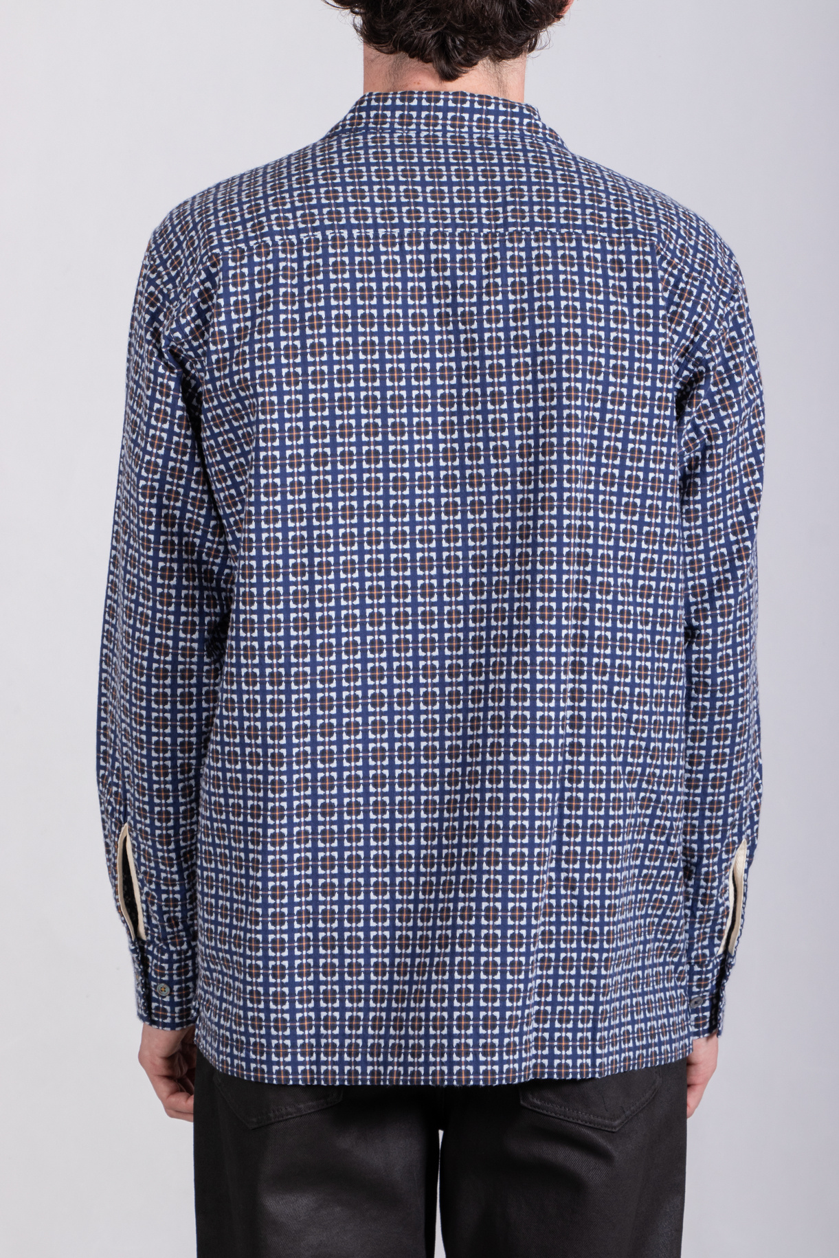 Shirt from Universal Works. Made from a slightly heavier cotton fabric with a woven-in pattern. Our model is 189 cm tall and wears size L. Read more