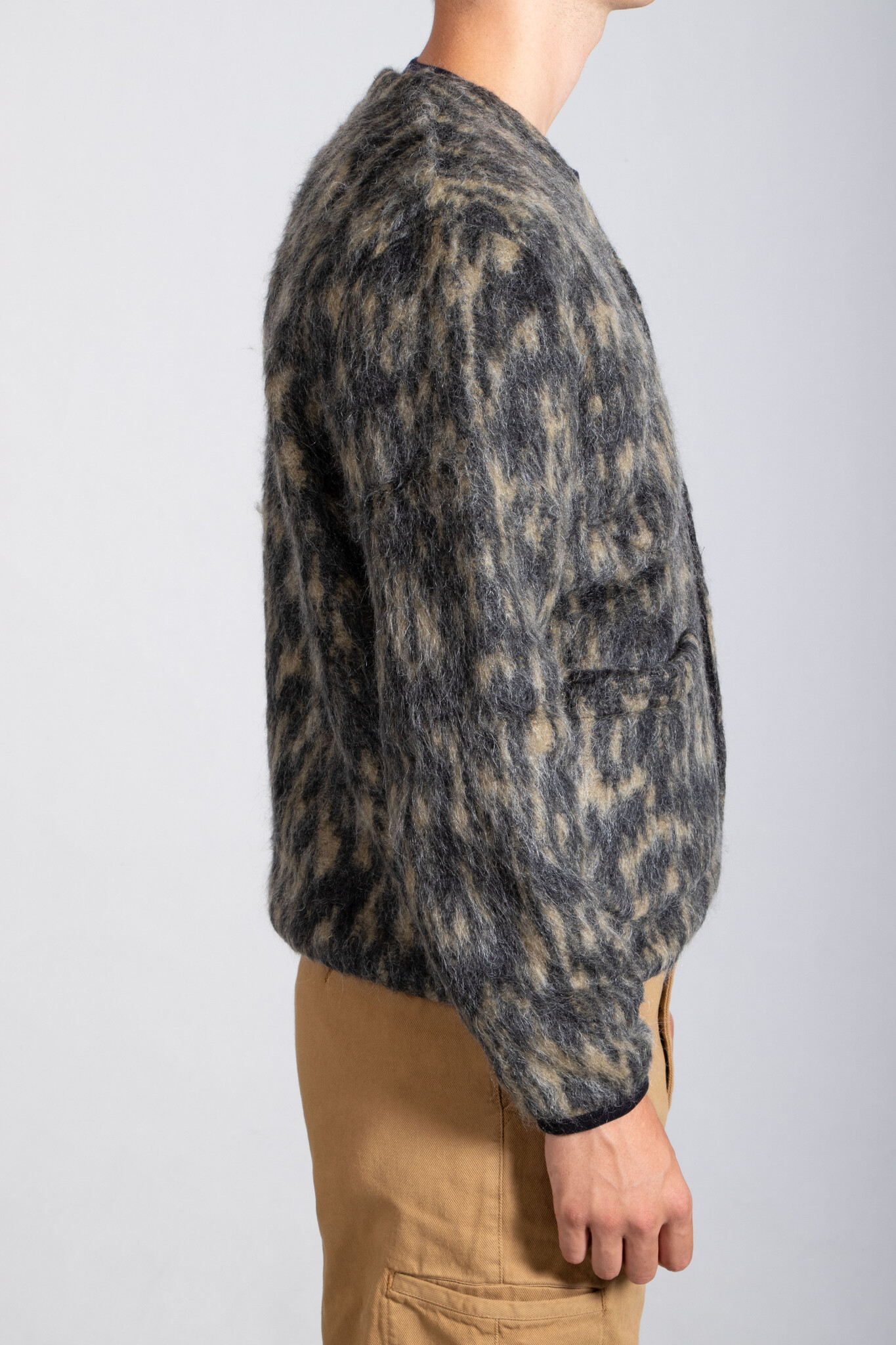 Cardigan by Universal Works with a spotted pattern. The fabric is made from a mohair blend. Our model is 192 cm tall and wears size L. Read more