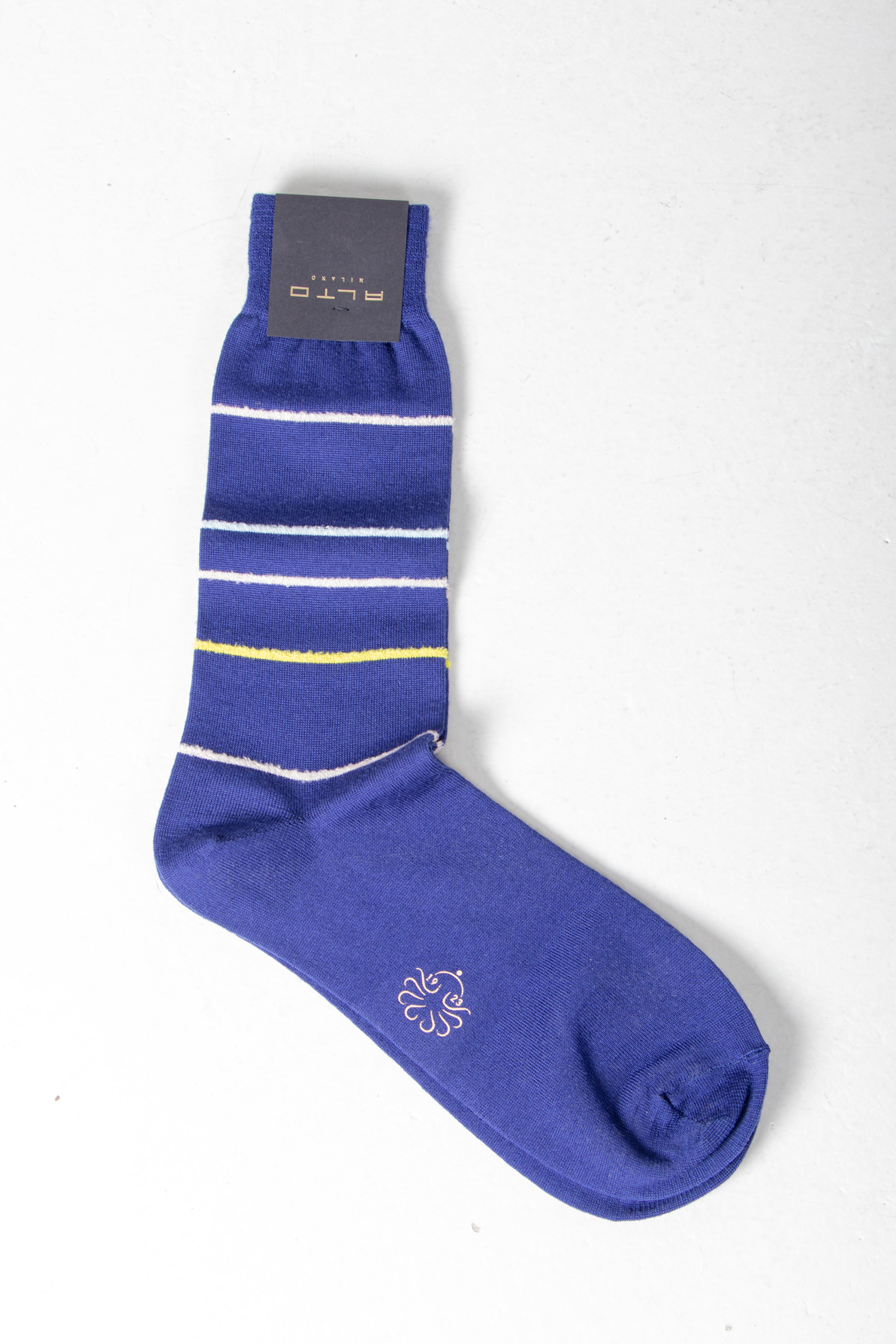 | Blauwe sok met streep van Alto Milano uit Italië, gemaakt van een wol-viscose mix met een beetje polyamide voor extra stevigheid. | |