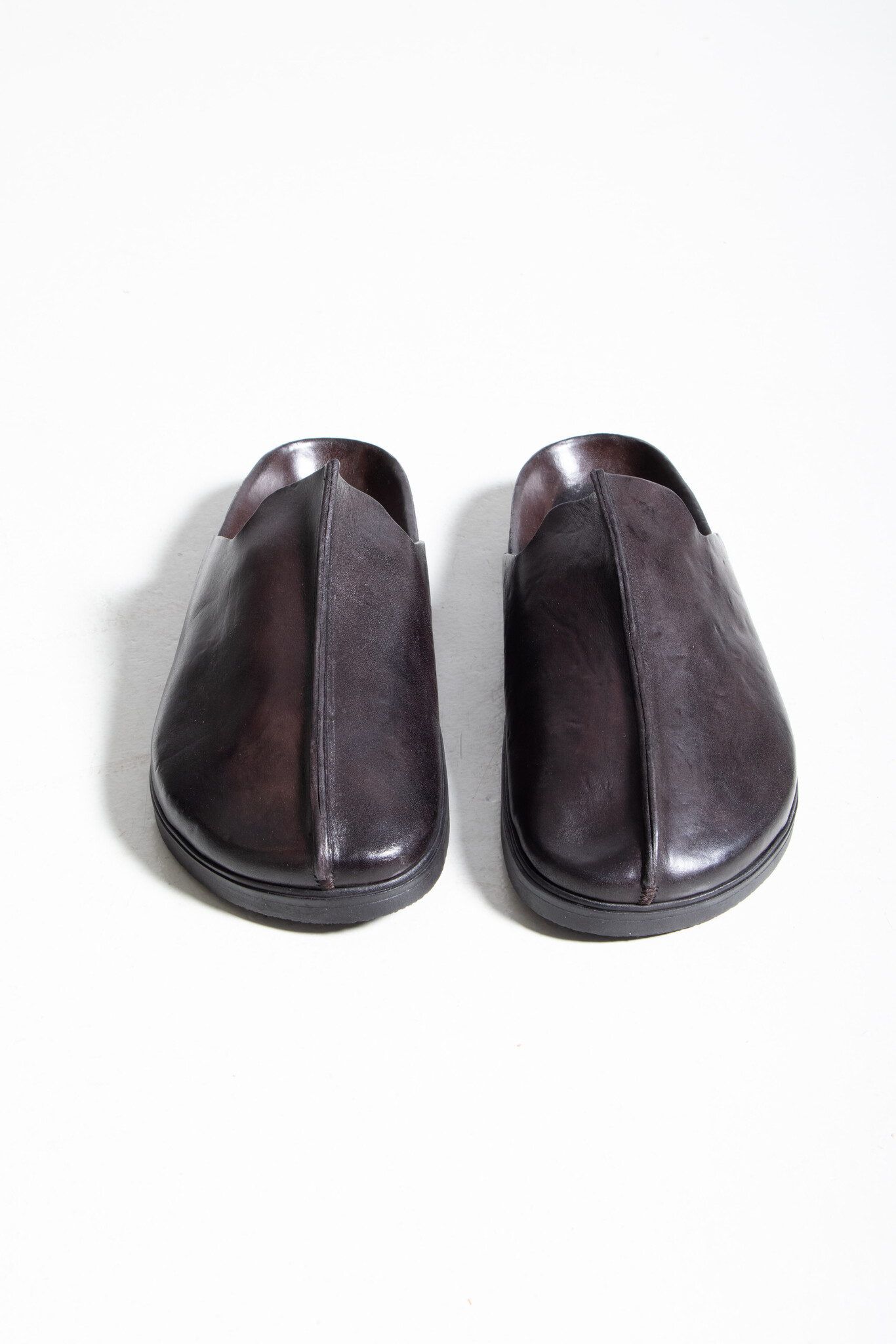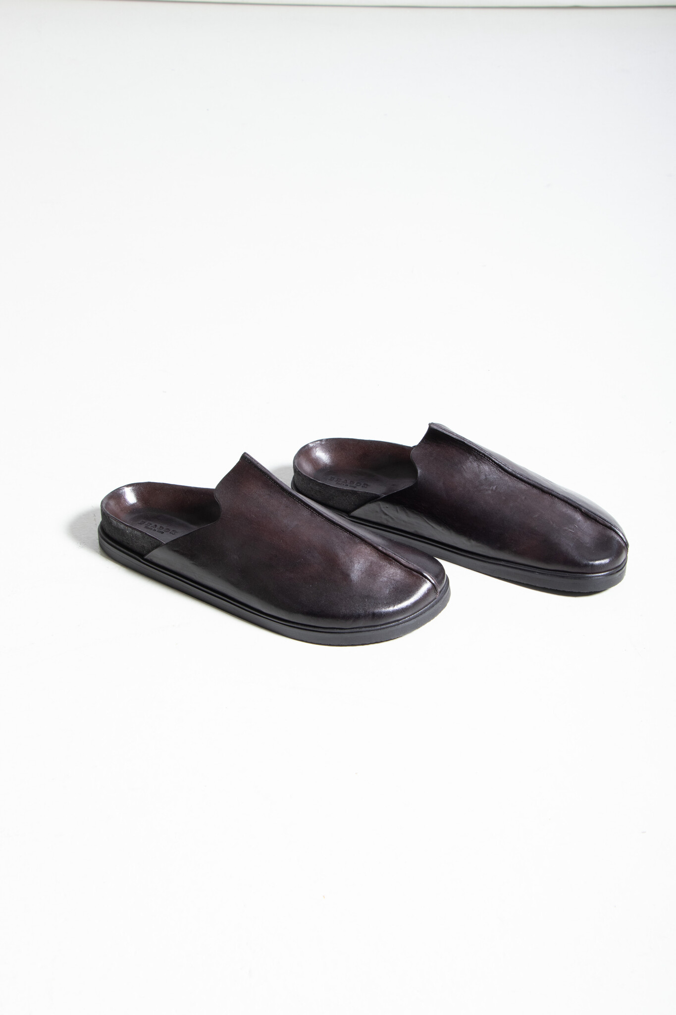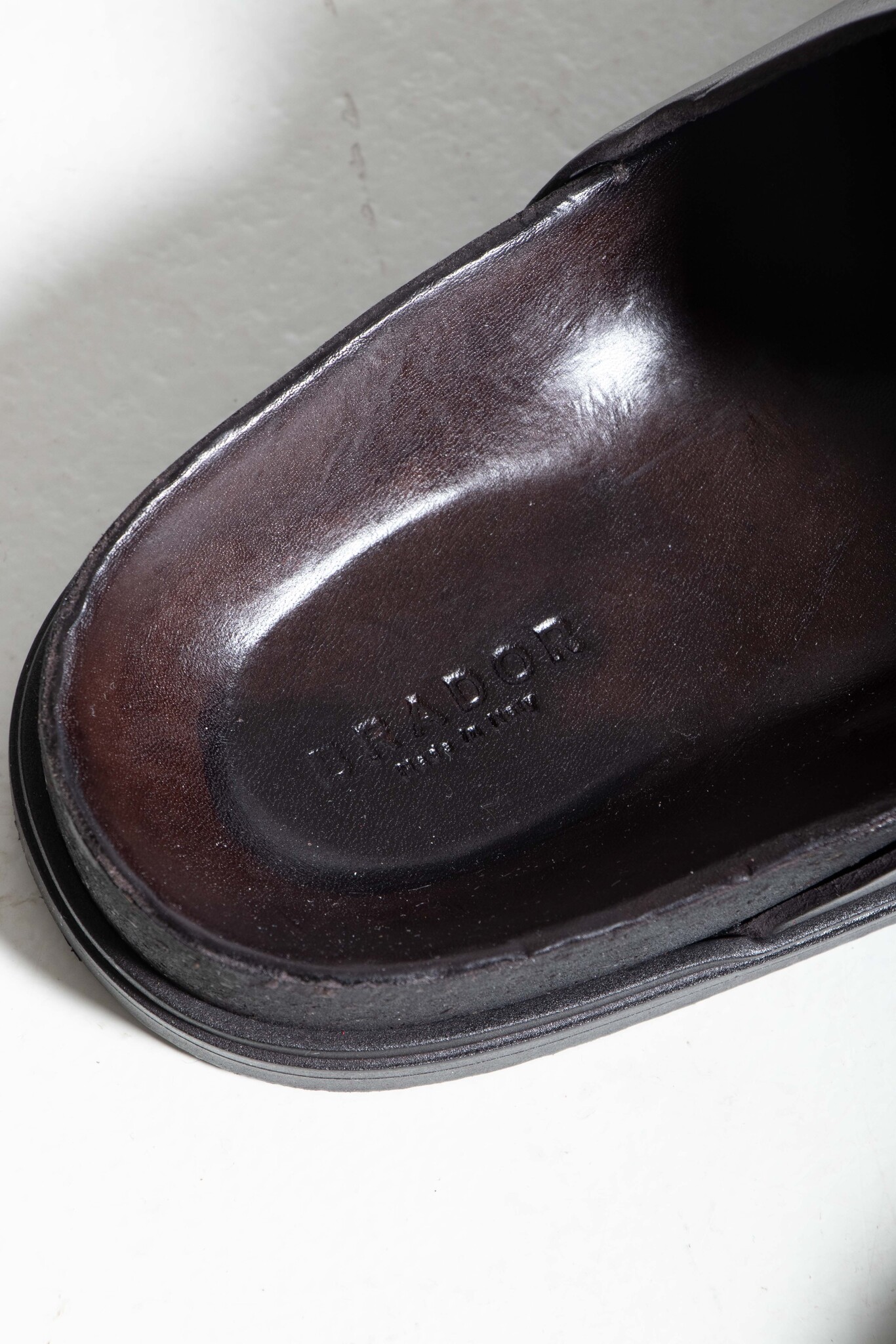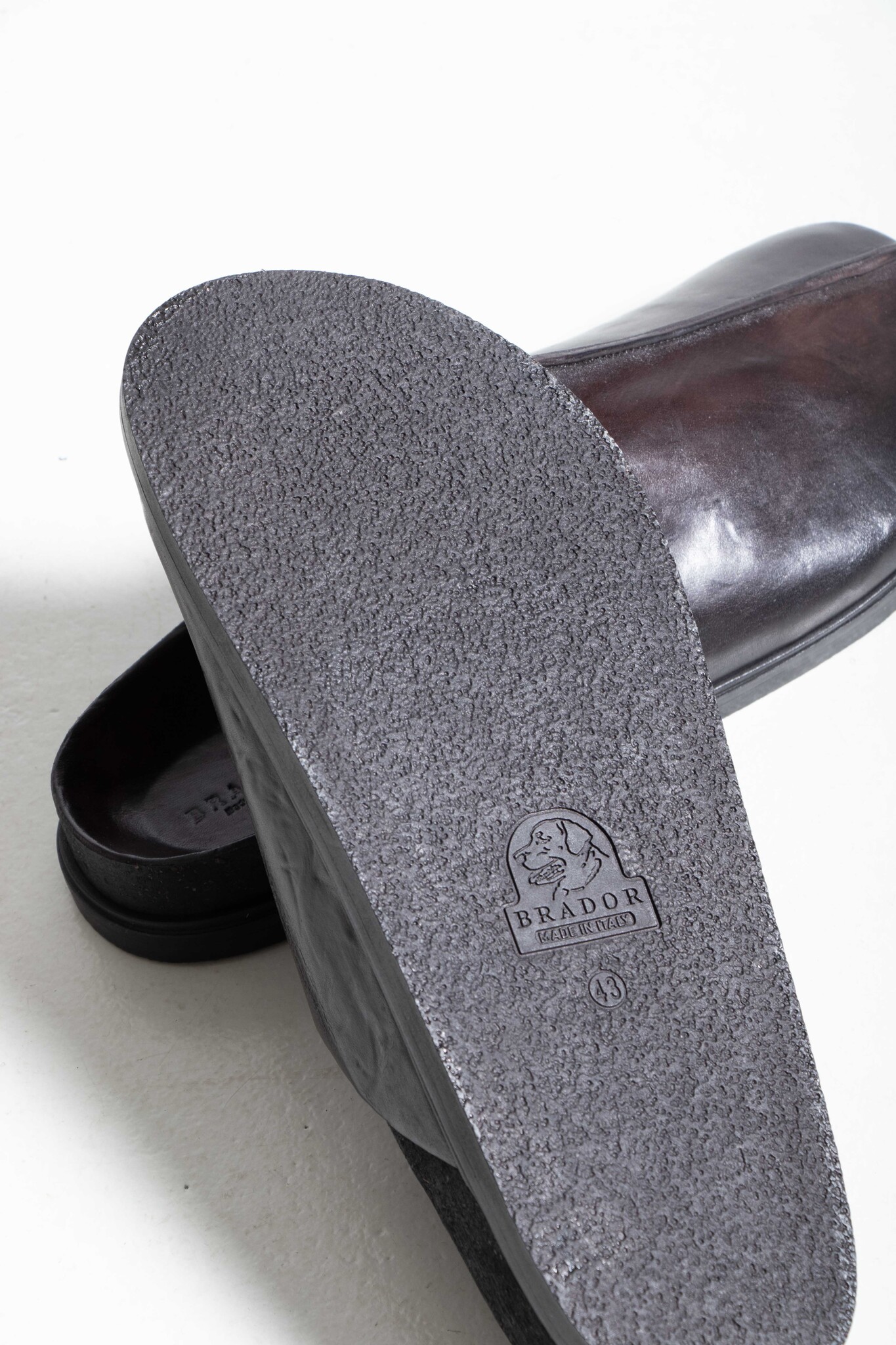 | Leren muiltjes van Brador met een stevige naad op de neus. Ze worden gemaakt in Italië van stevig kalfsleer en een zool van rubber, leer en kurk. | |