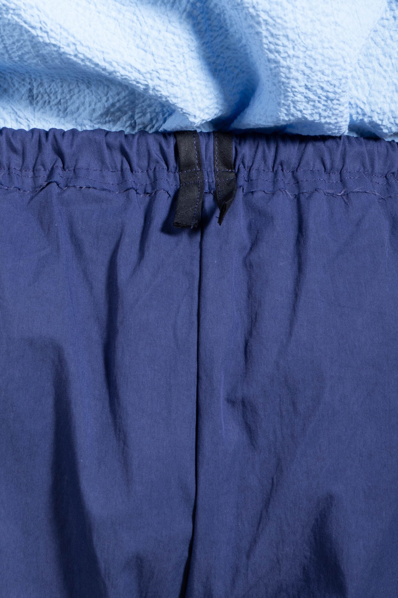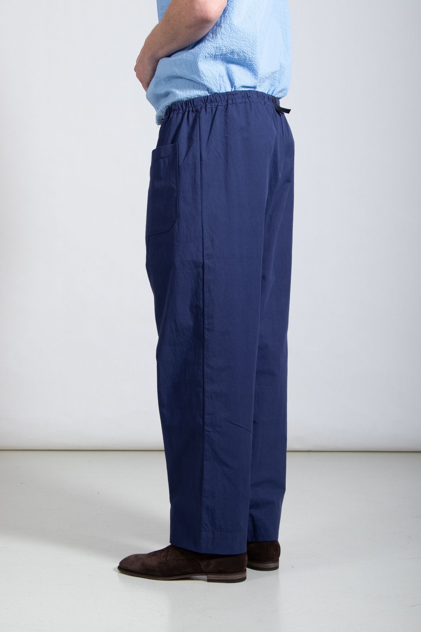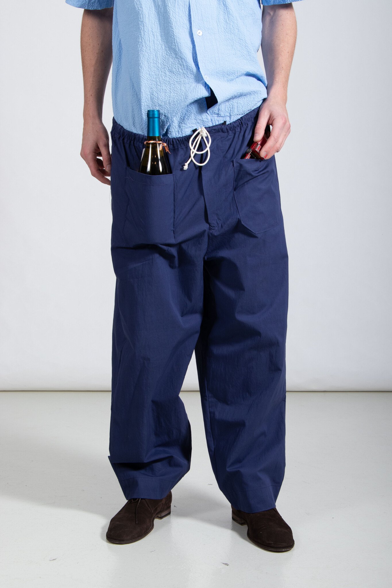 | Recht en iets losjes vallend model broek van Camiel Fortgens. Gemaakt van nylon met een elastiek in de middel. Twee vierkante zakken op de voorkant. Omhoog te houden met een touwtje. Ons model is 189 cm lang en draagt een maat M. | |