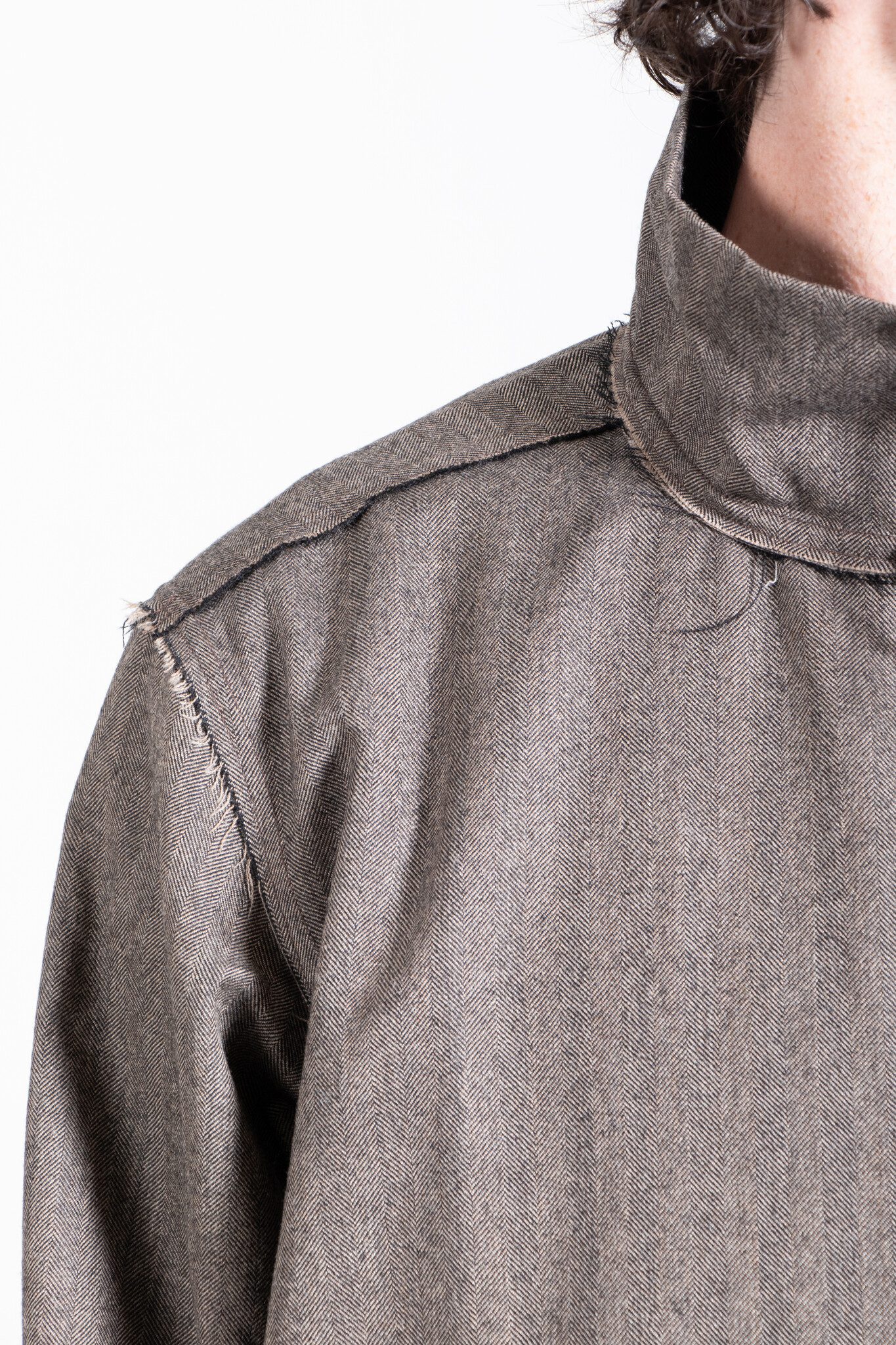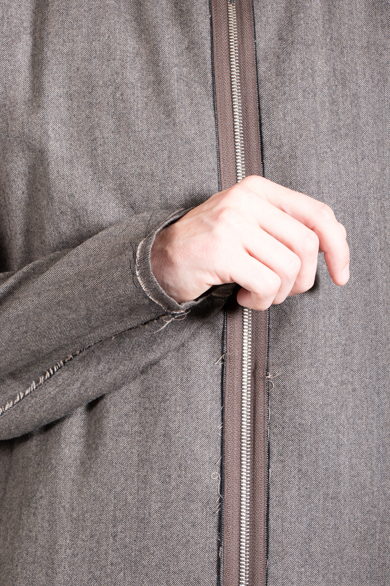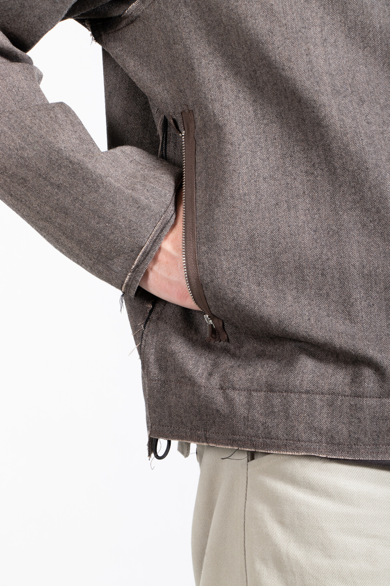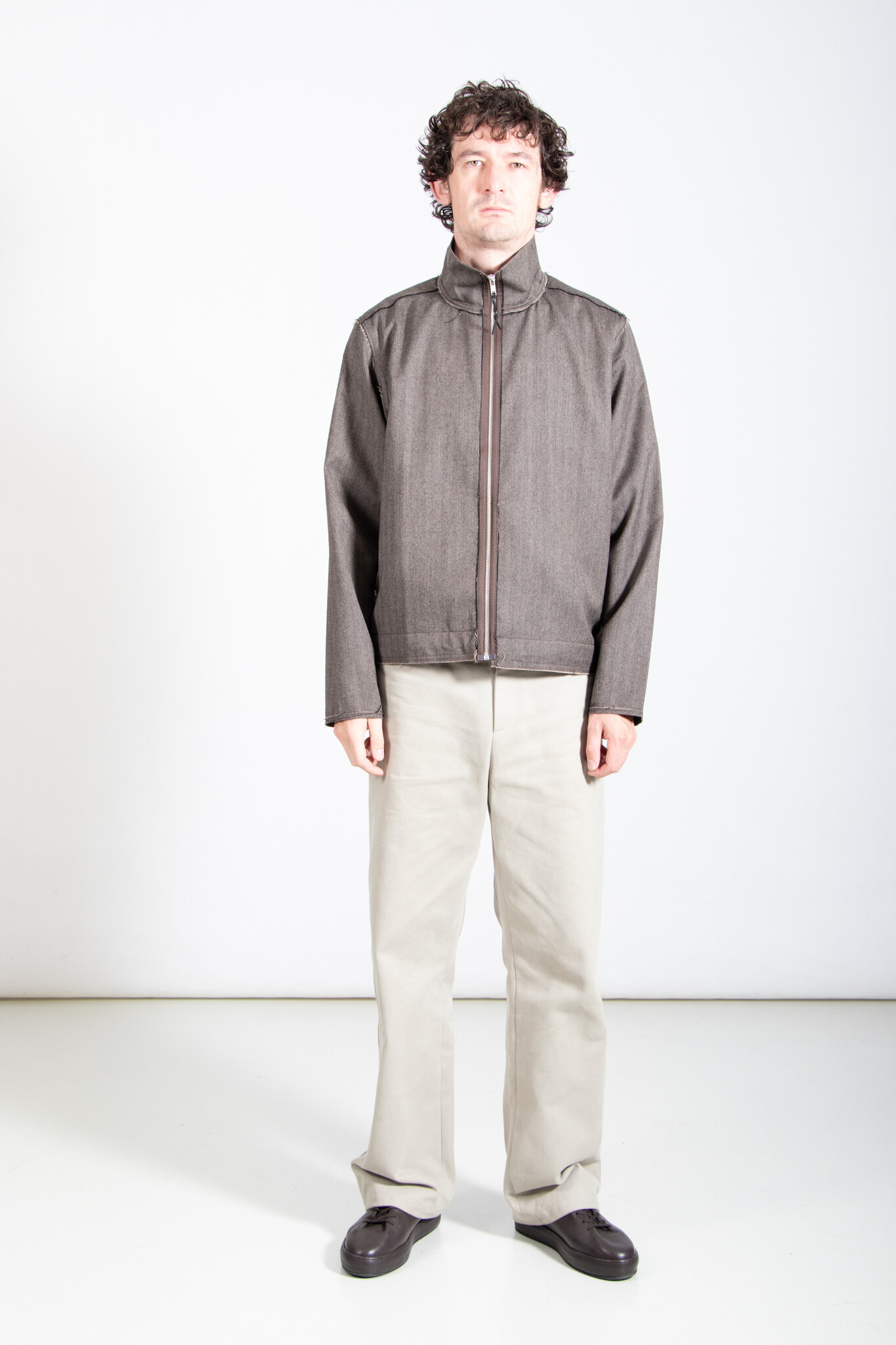 Een trainingsjack met een twist: de dunne wollen stof is in herringbone geweven. Afgewerkt zoals we dat van Camiel Fortgens kennen, met grove stiksels en ‘binnenstebuiten’ naden. Model is 189 cm en draagt maat M. | |