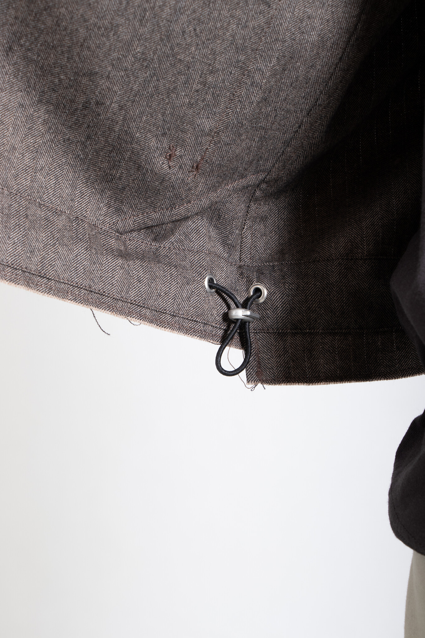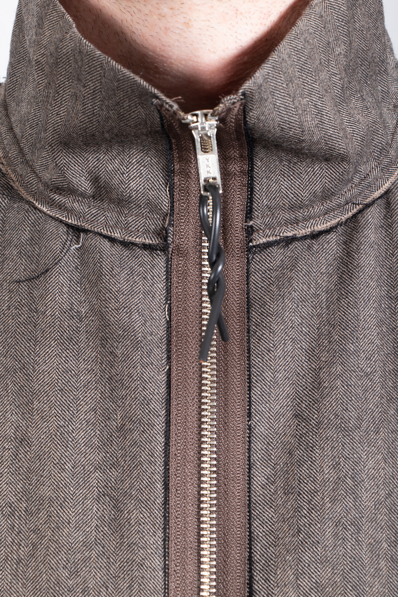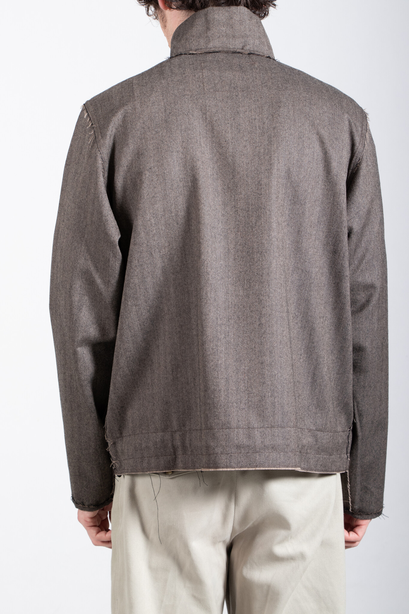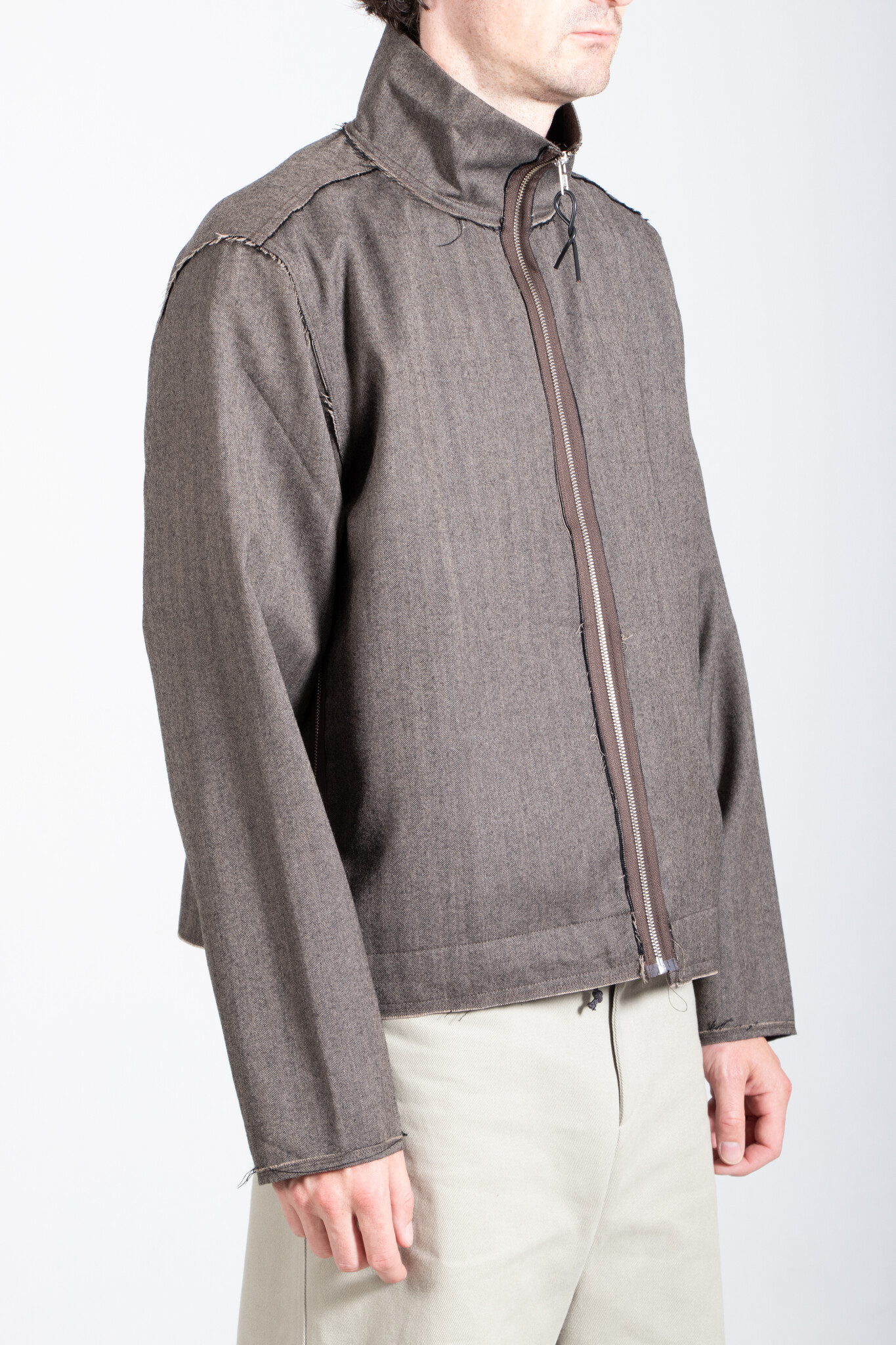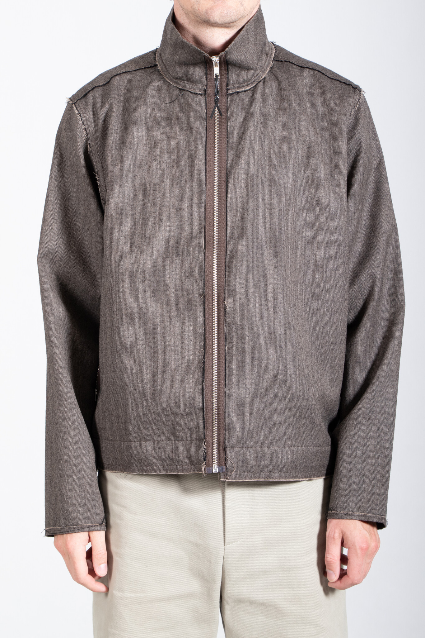 Een trainingsjack met een twist: de dunne wollen stof is in herringbone geweven. Afgewerkt zoals we dat van Camiel Fortgens kennen, met grove stiksels en ‘binnenstebuiten’ naden. Model is 189 cm en draagt maat M. | |