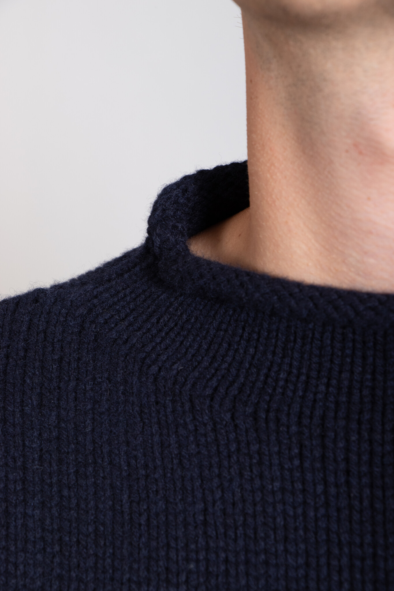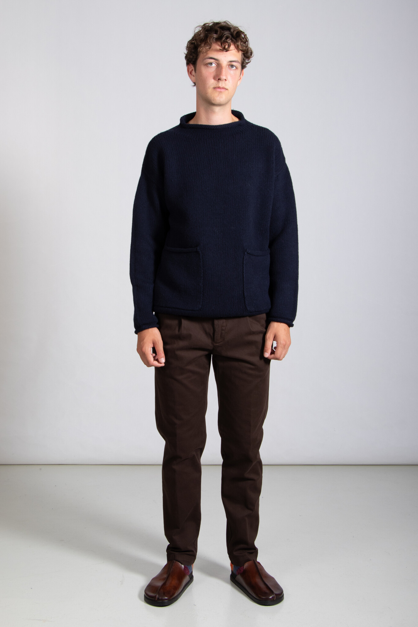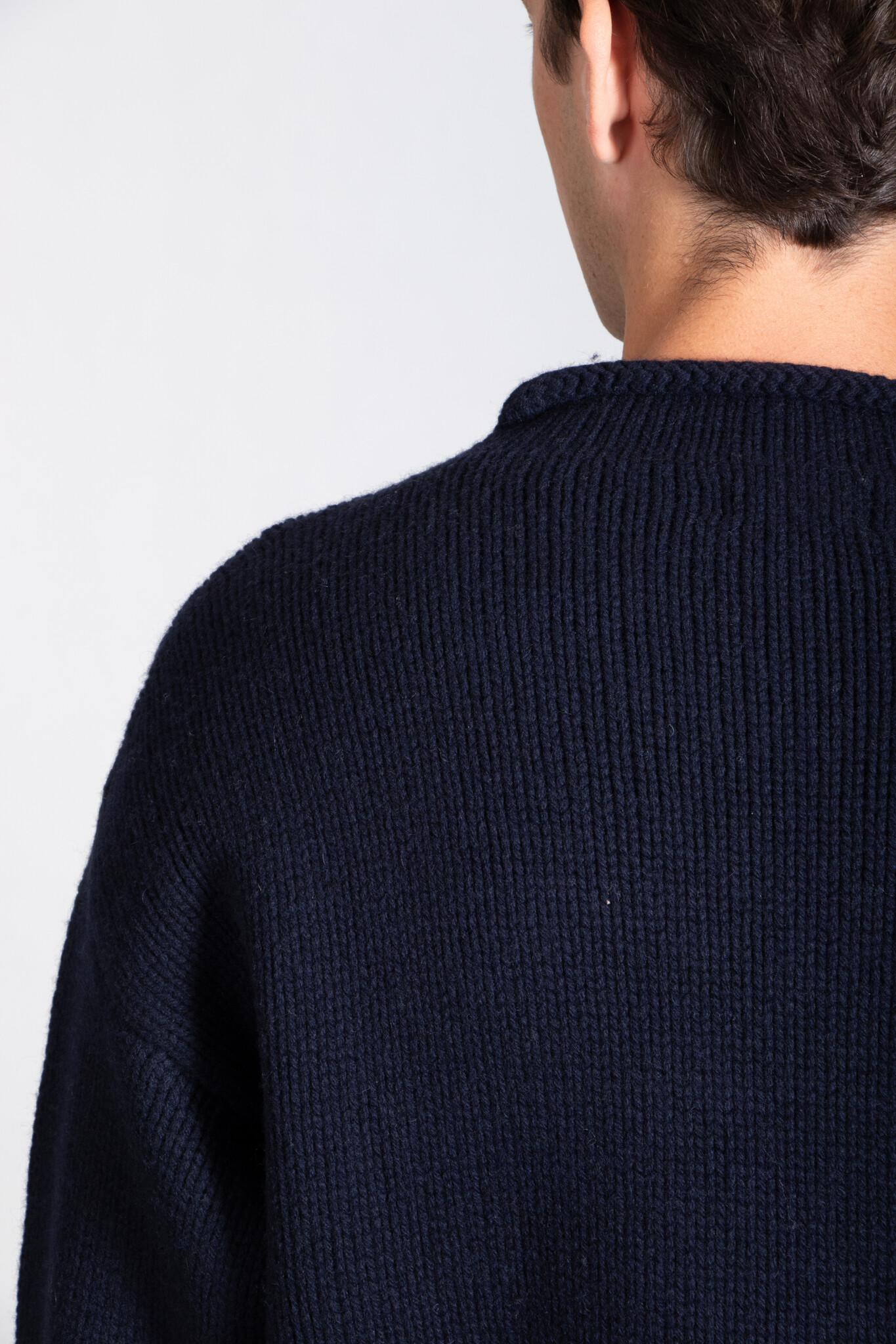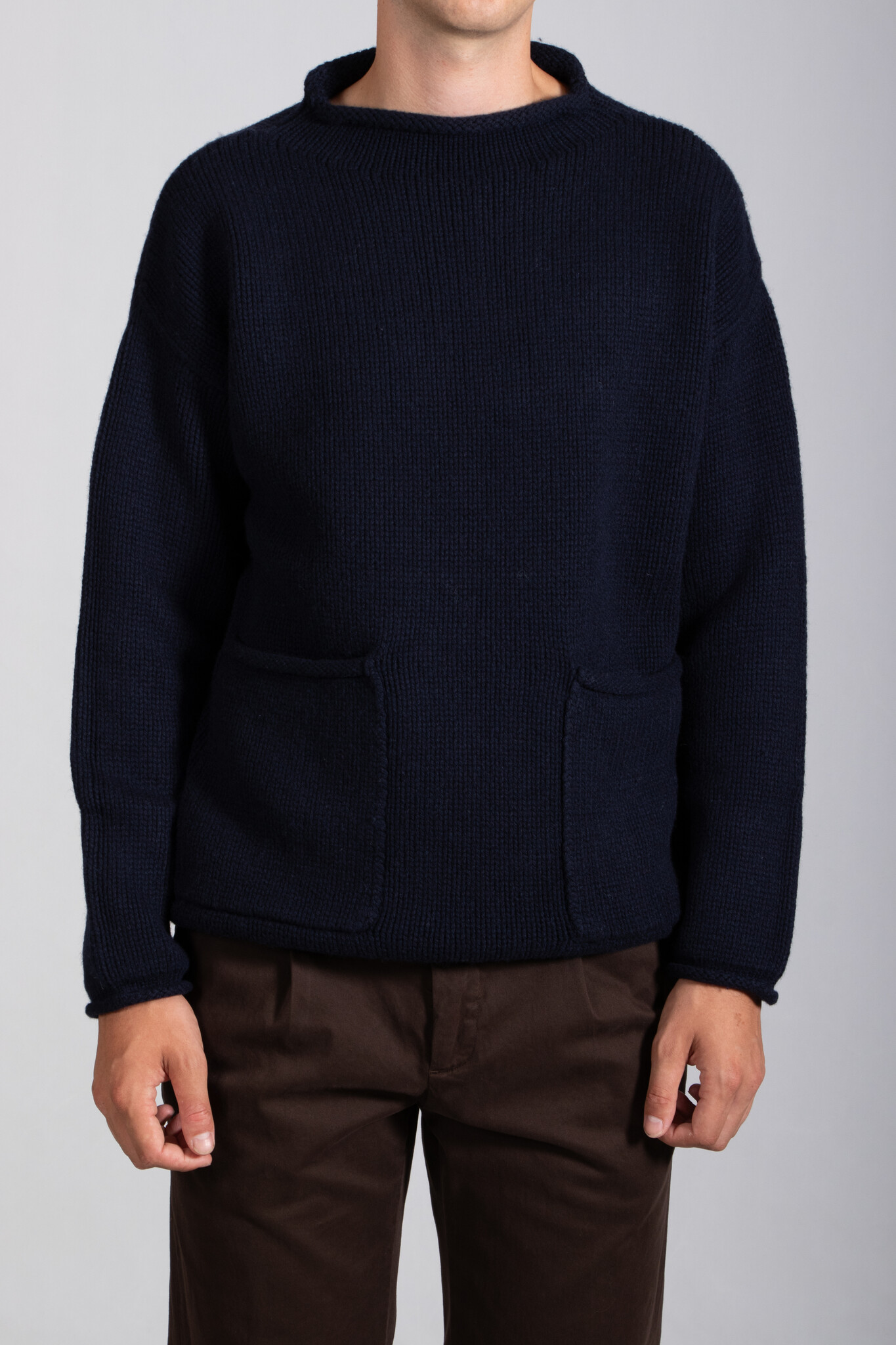 Gebreide trui van het Italiaanse breimerk Casa Isaac. Deze boxy trui heeft een ietwat hoge roll neck en twee zakken. Ons model is 192 cm lang en draagt een maat L. Lees meer