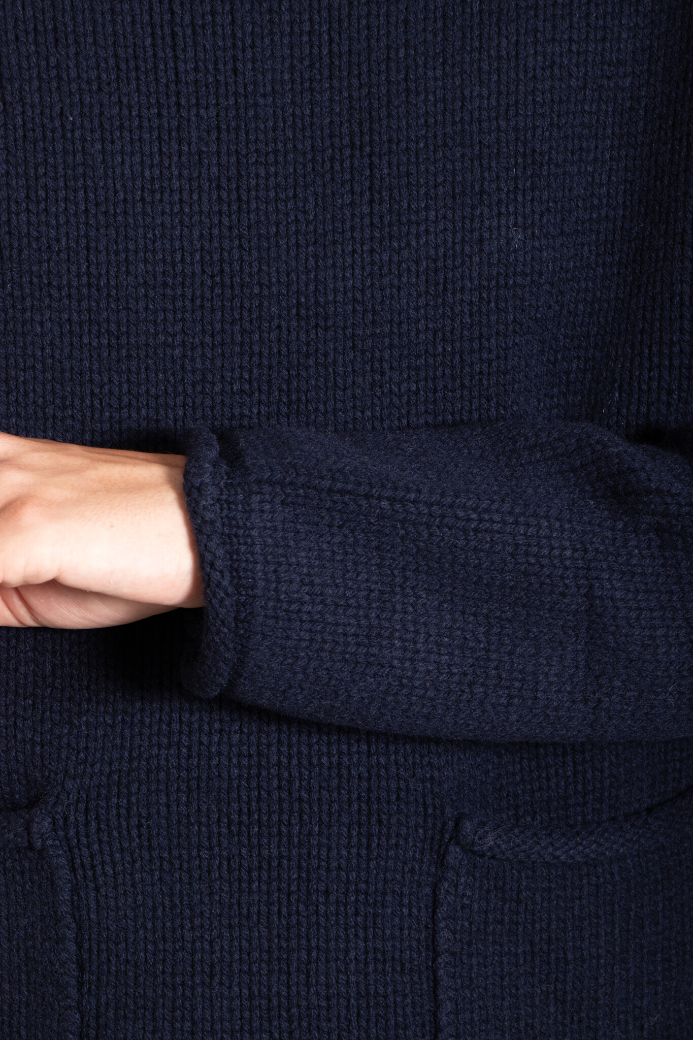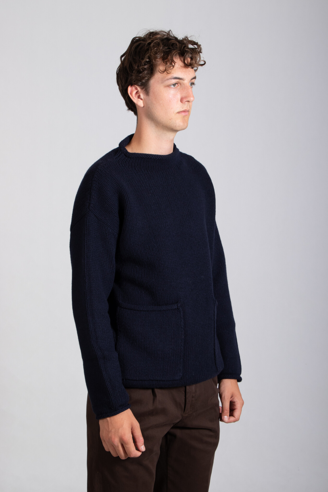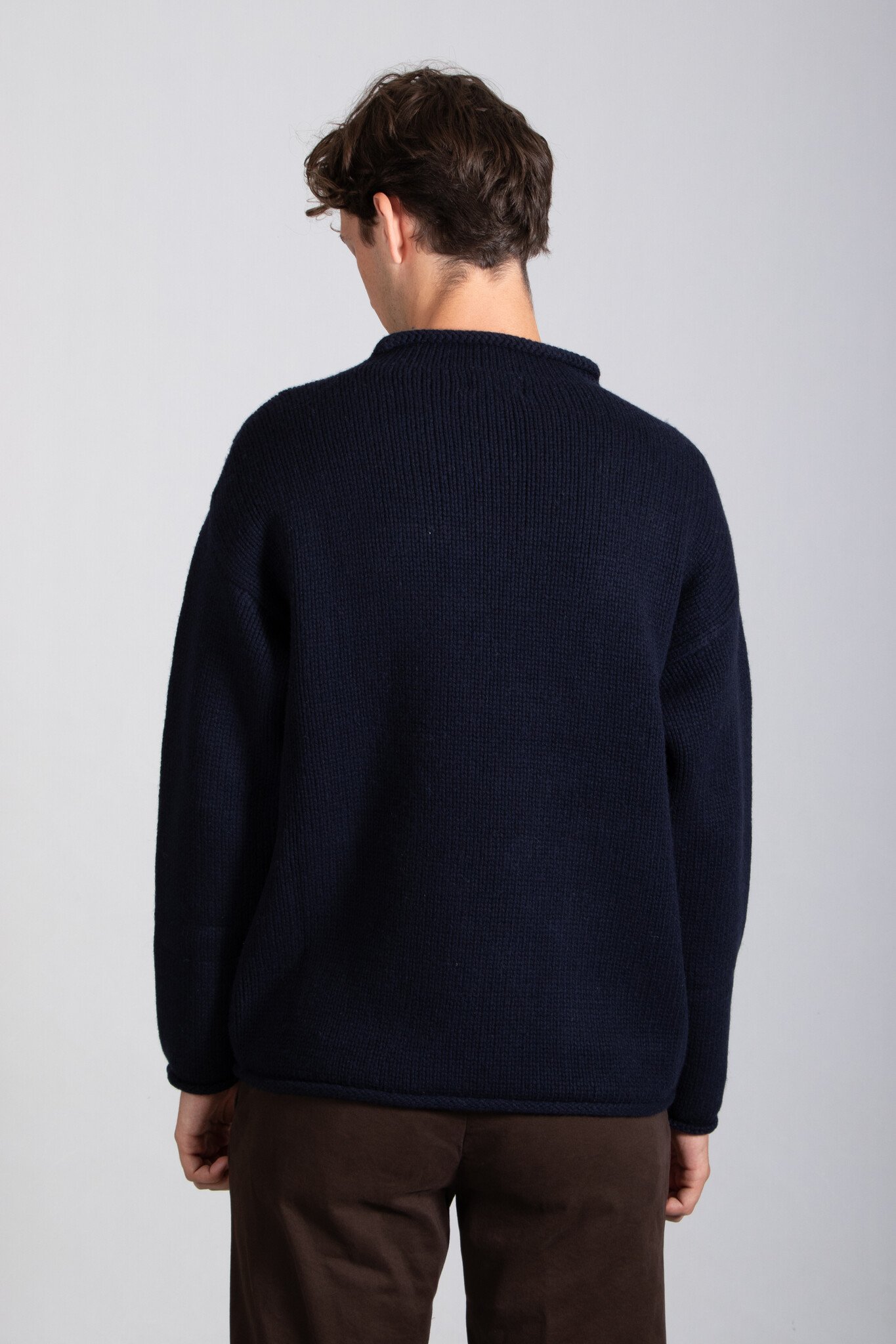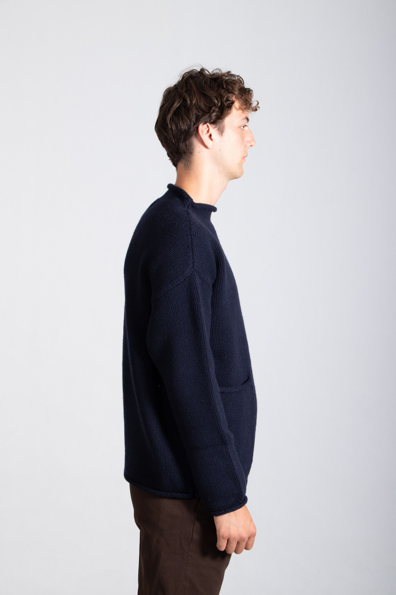 Gebreide trui van het Italiaanse breimerk Casa Isaac. Deze boxy trui heeft een ietwat hoge roll neck en twee zakken. Ons model is 192 cm lang en draagt een maat L. Lees meer