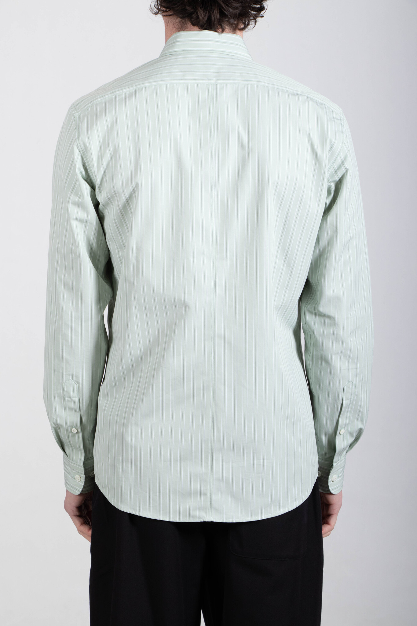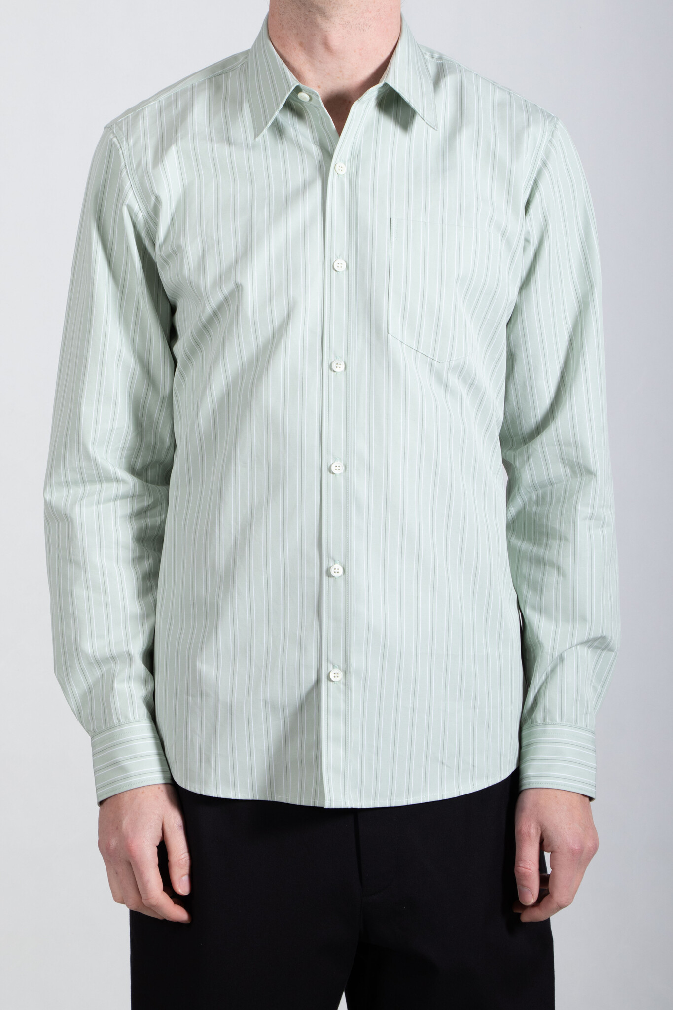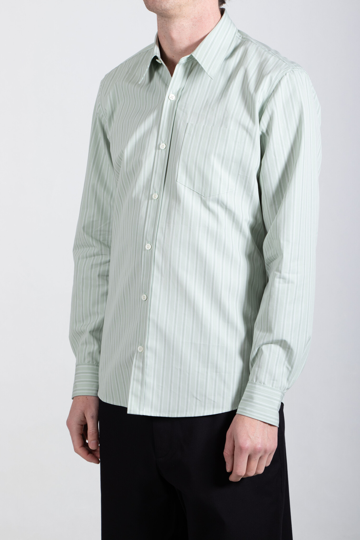 Stevig katoenen overhemd van Dries van Noten, met een wit-groen streeppatroon. Ons model is 189 cm lang en draagt een maat 50. Lees meer