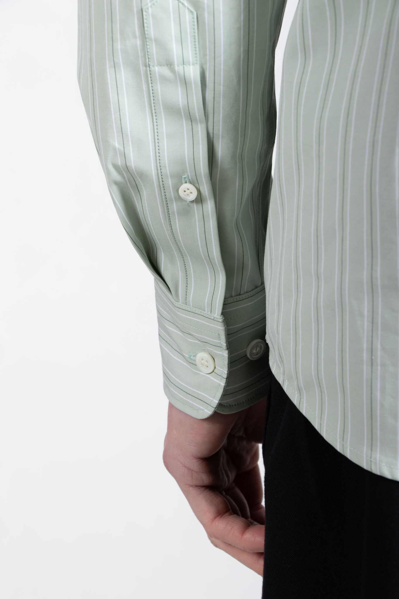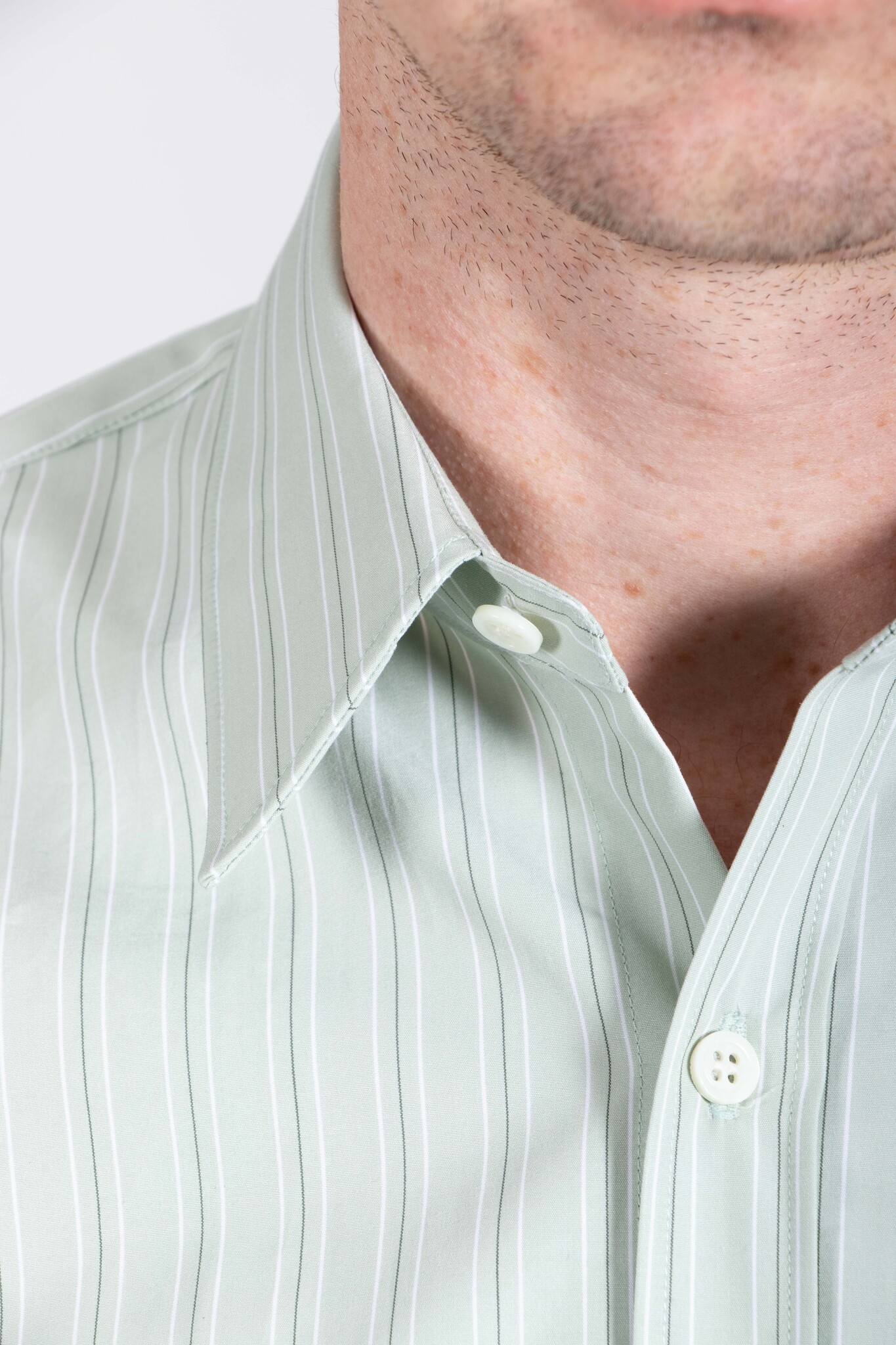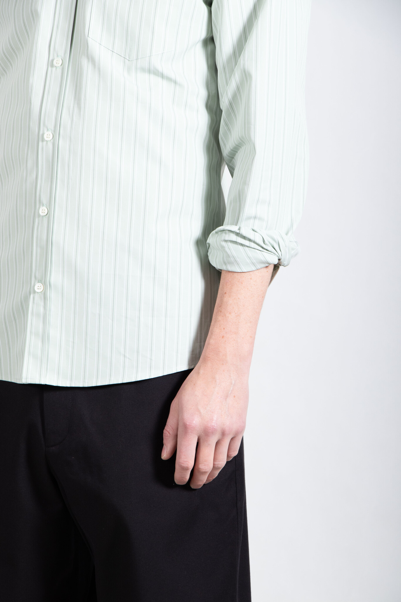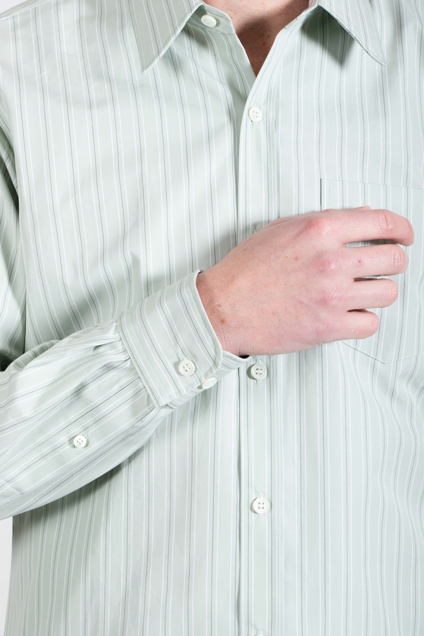 Stevig katoenen overhemd van Dries van Noten, met een wit-groen streeppatroon. Ons model is 189 cm lang en draagt een maat 50. Lees meer