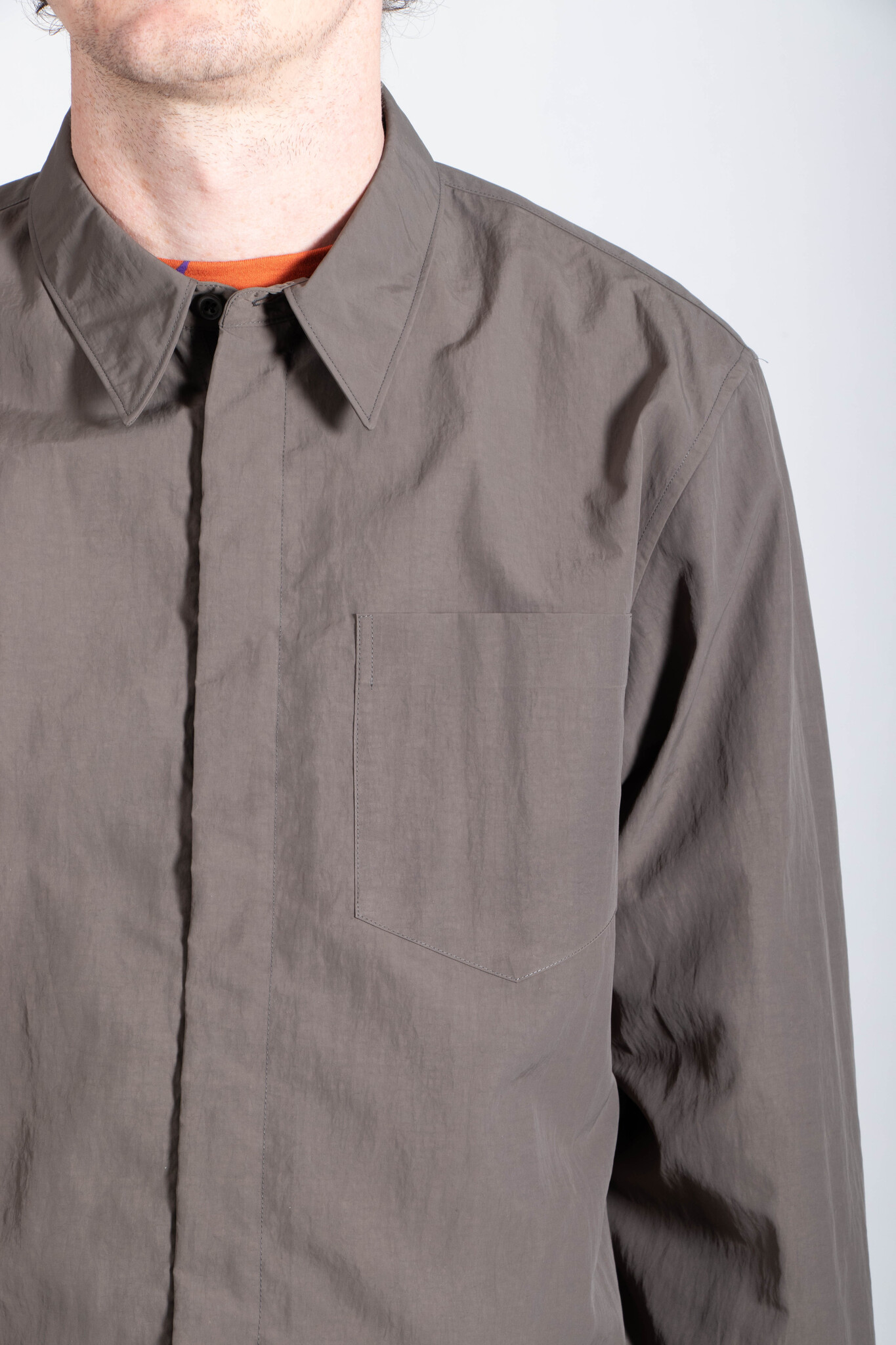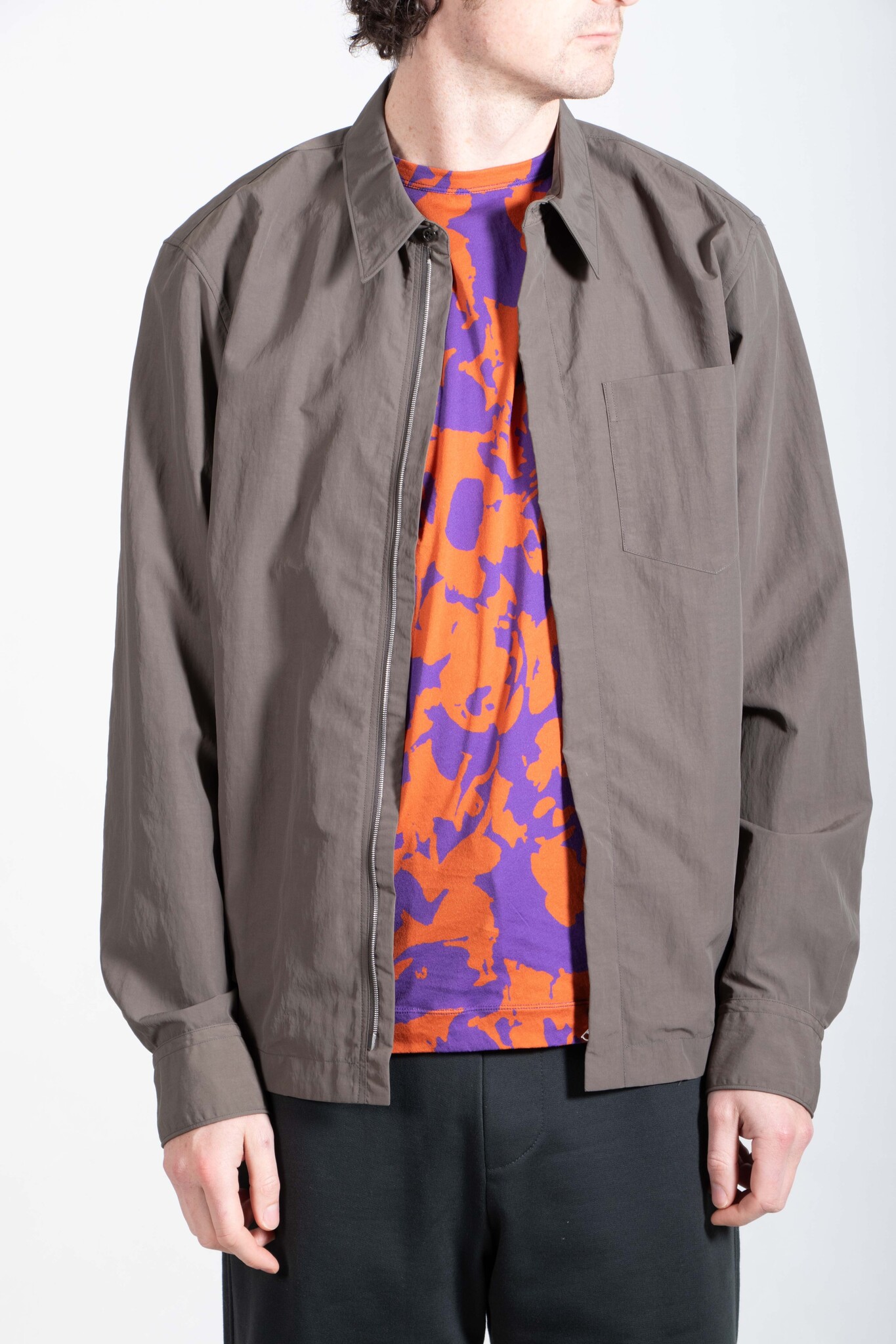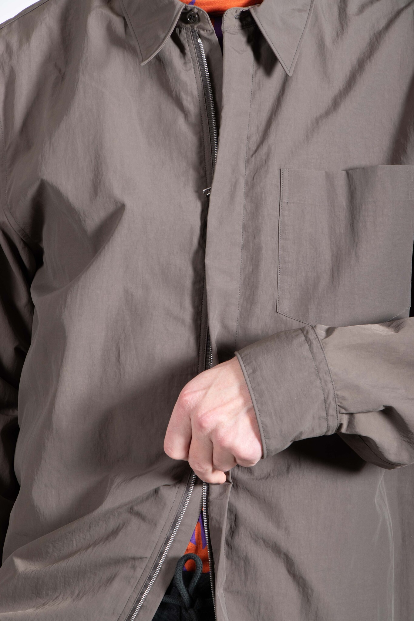 Overhemd met verborgen ritssluiting van Dries van Noten. Het overhemd is uitgevoerd in een zachte khaki-groene nylon. Er is een broek in dezelfde stof, waardoor je het als pak kan dragen. Ons model is 189 cm lang en draagt maat L. Lees meer