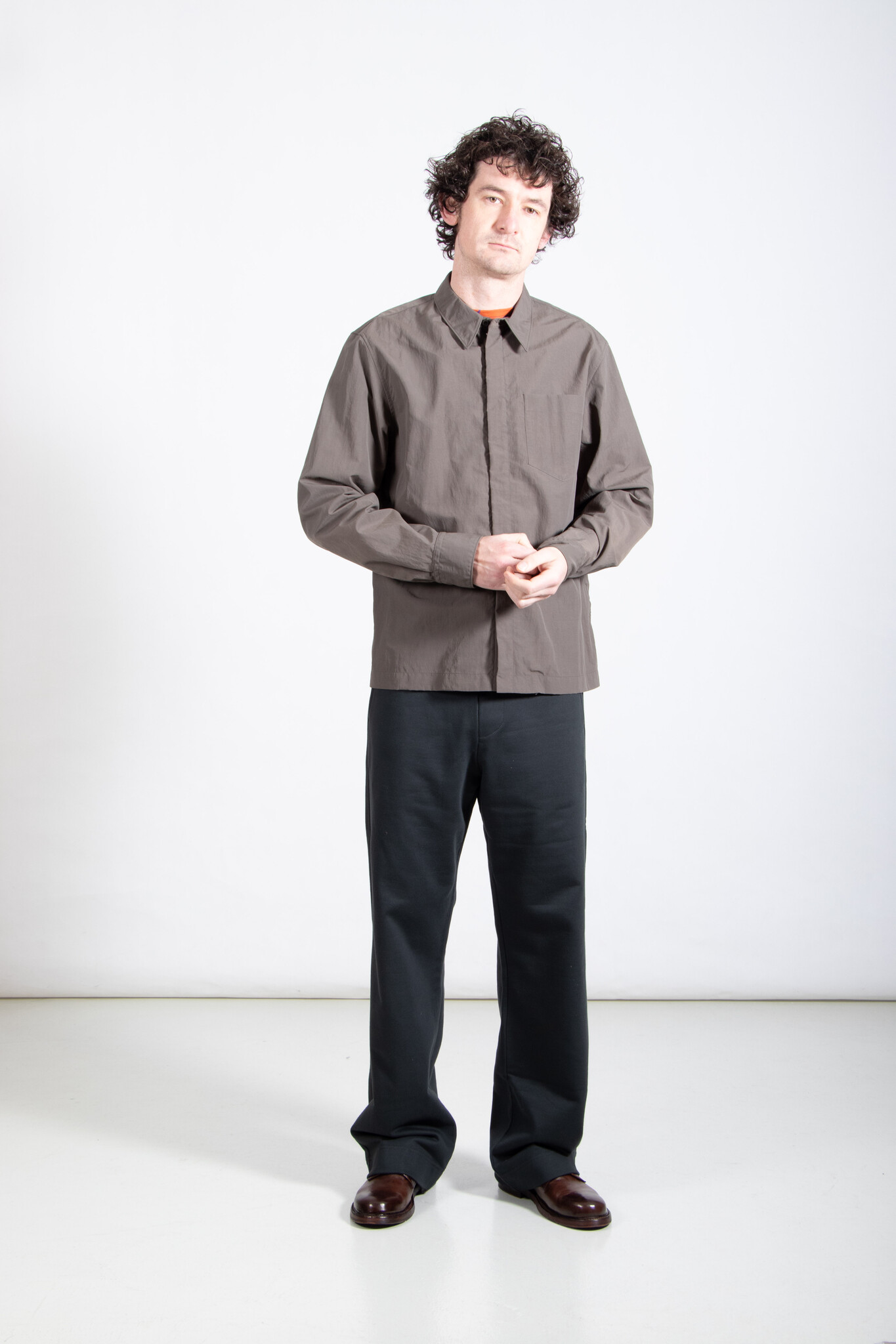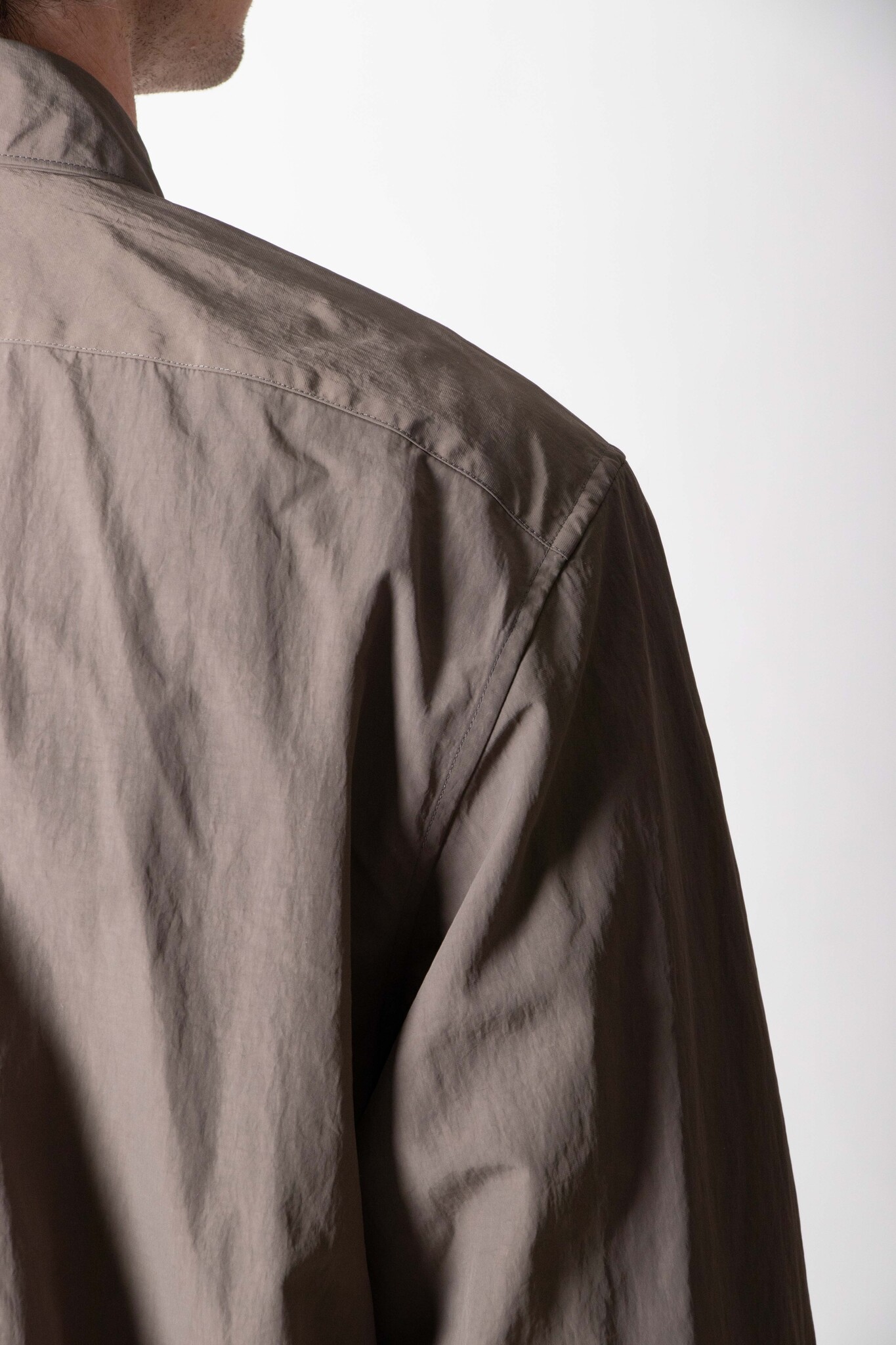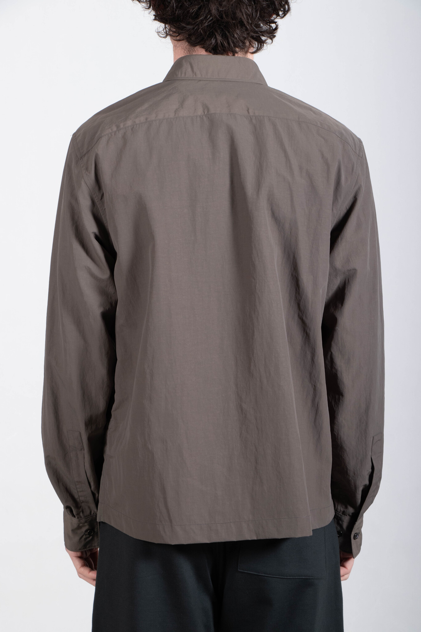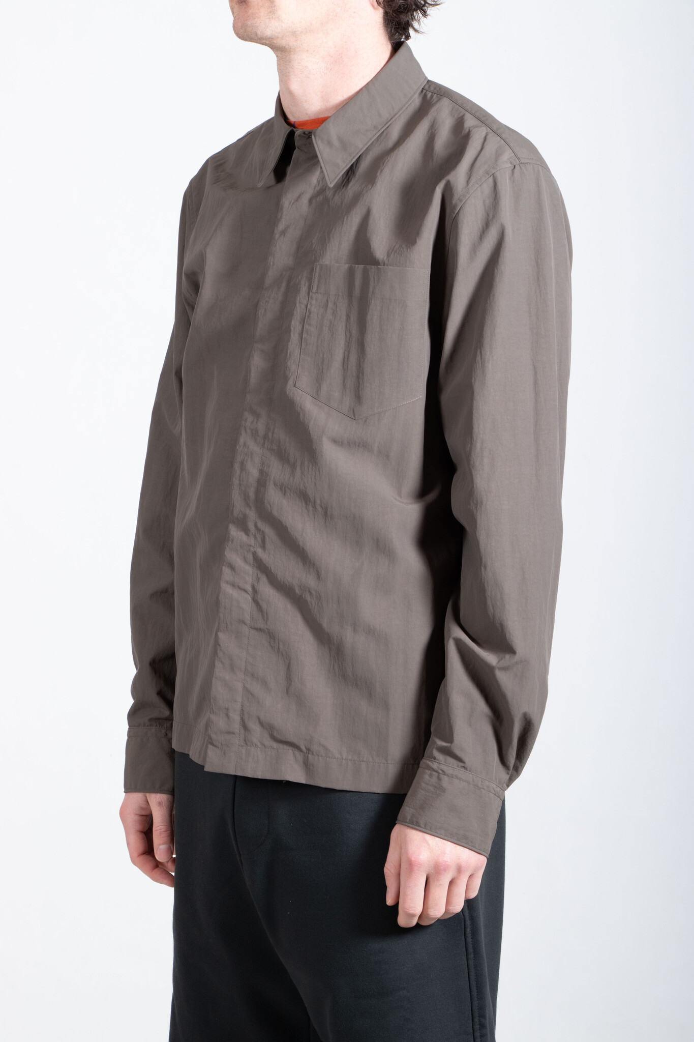 Overhemd met verborgen ritssluiting van Dries van Noten. Het overhemd is uitgevoerd in een zachte khaki-groene nylon. Er is een broek in dezelfde stof, waardoor je het als pak kan dragen. Ons model is 189 cm lang en draagt maat L. Lees meer
