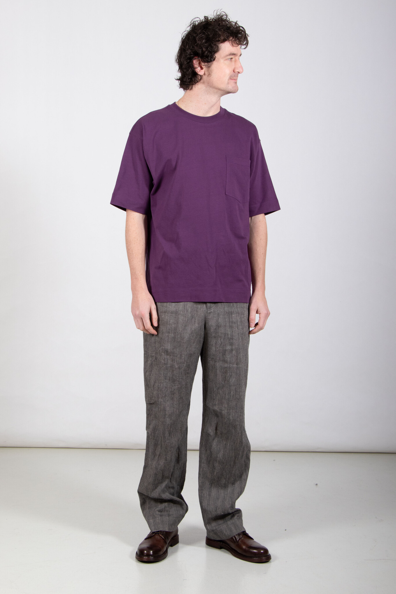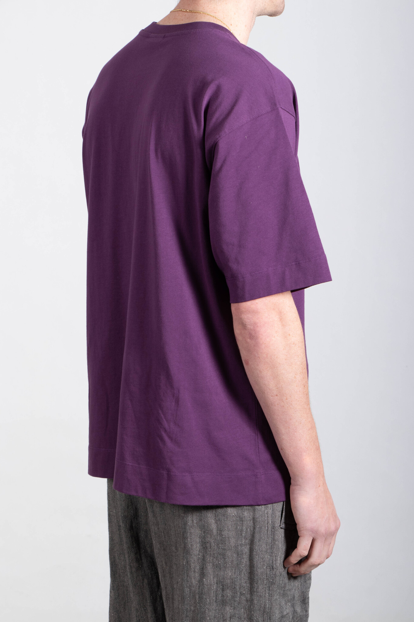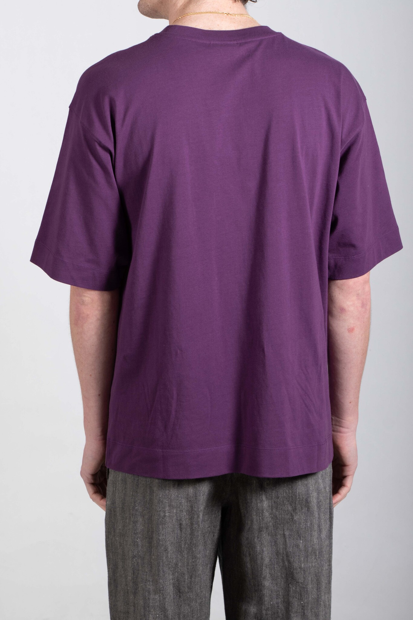 | Katoenen t-shirt van Dries van Noten. Het T-shirt valt wat ruimer, en heeft iets langere mouwen en een borstzak. Ons model is 189 cm lang en draagt maat L. | |