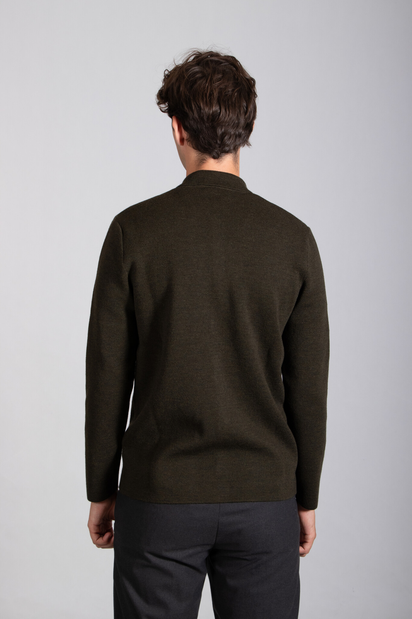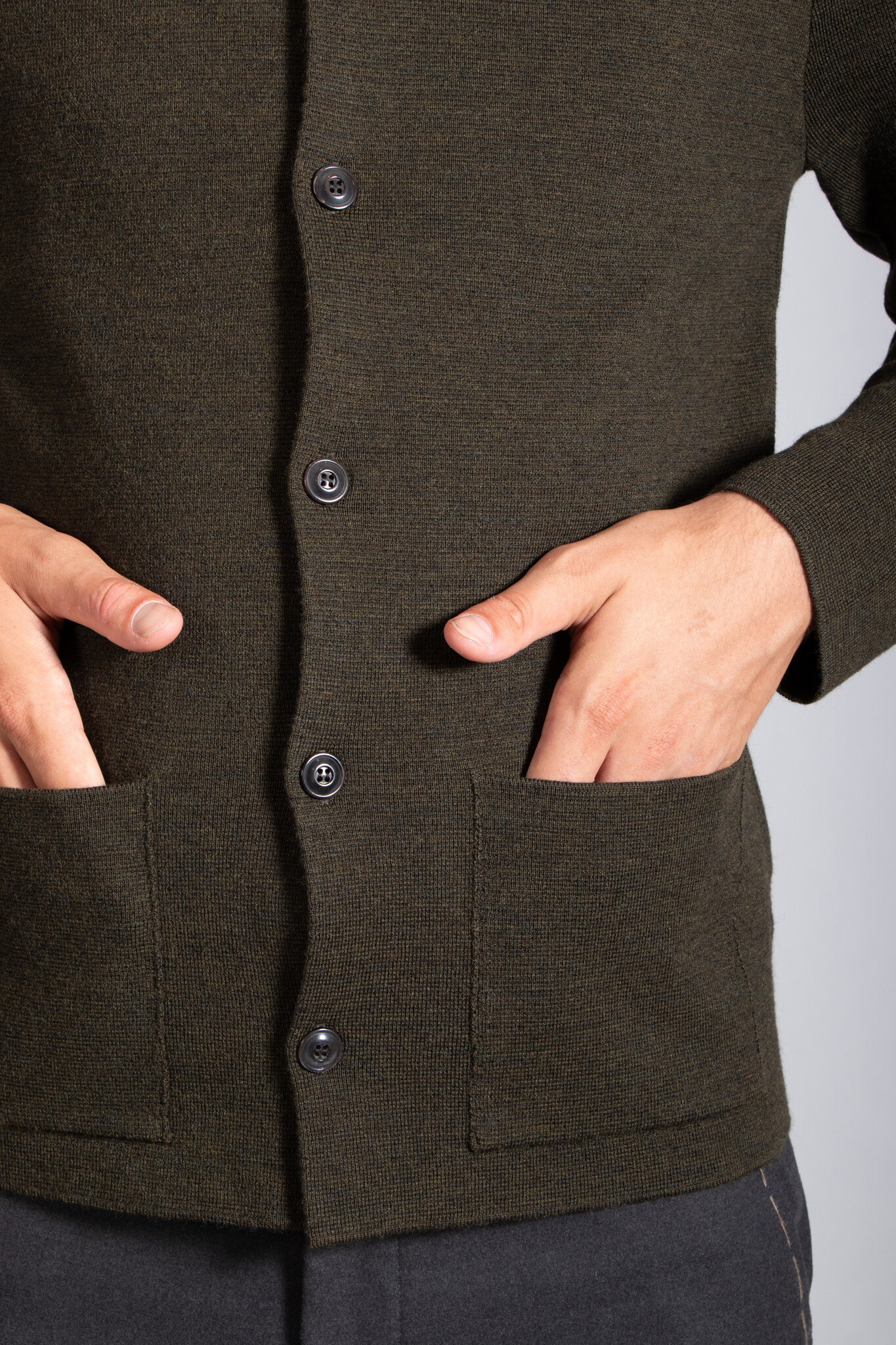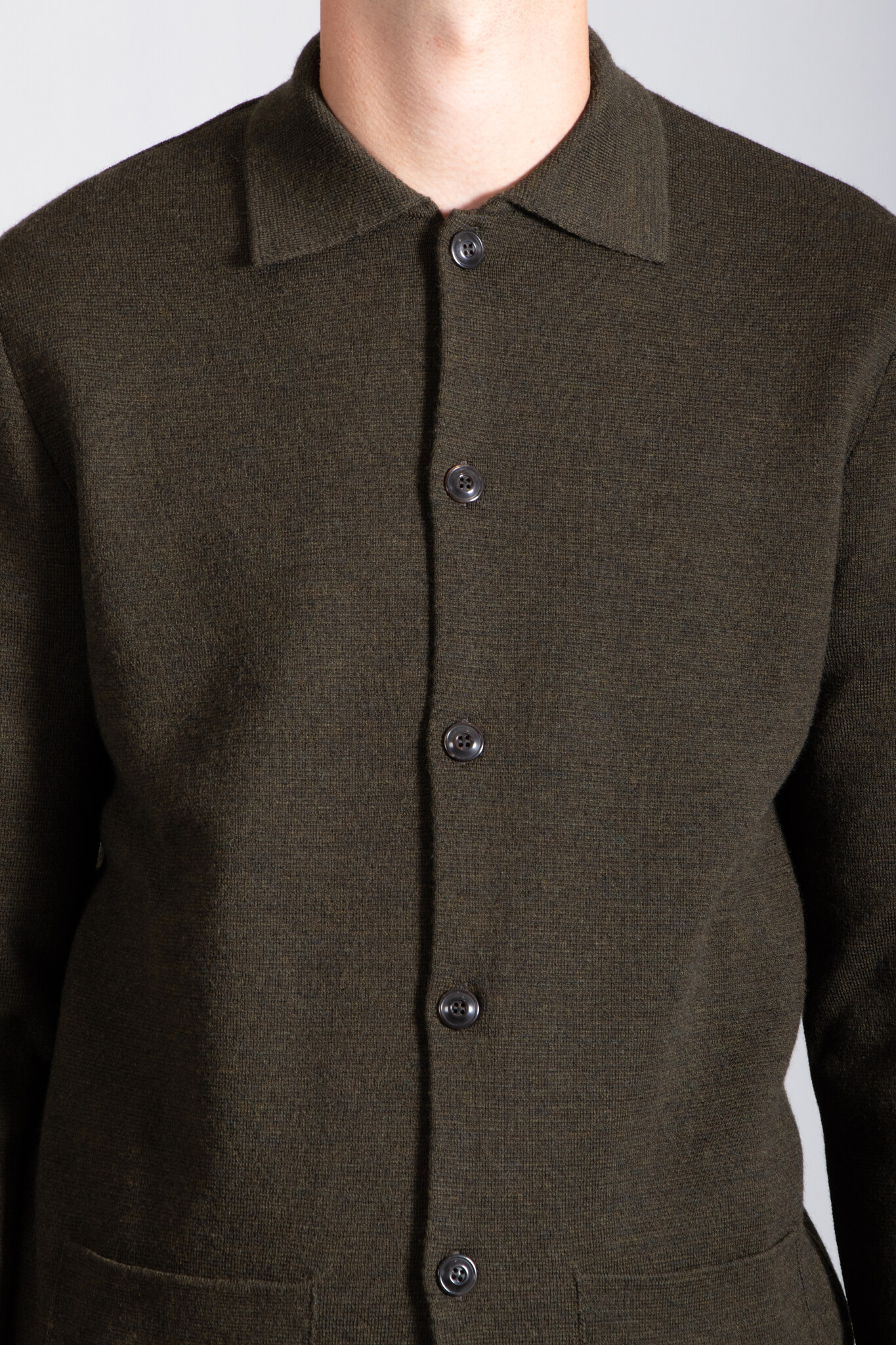 Vest van het Italiaanse breimerk G.R.P. in een gemêleerde grijze kleur. De stof is een stugge, dichtgebreide merinowol. Het vest is voorzien van knopen. Ons model is 192 cm lang en draagt maat XL. | |