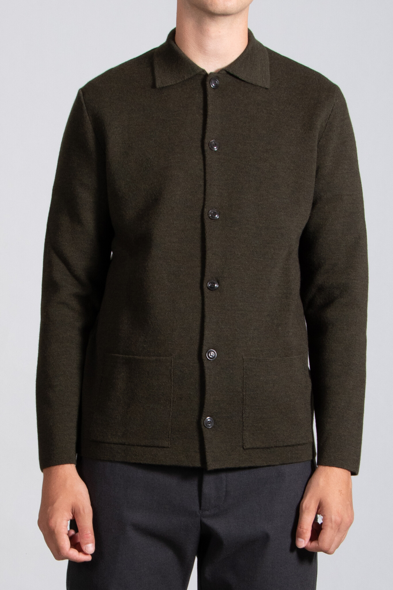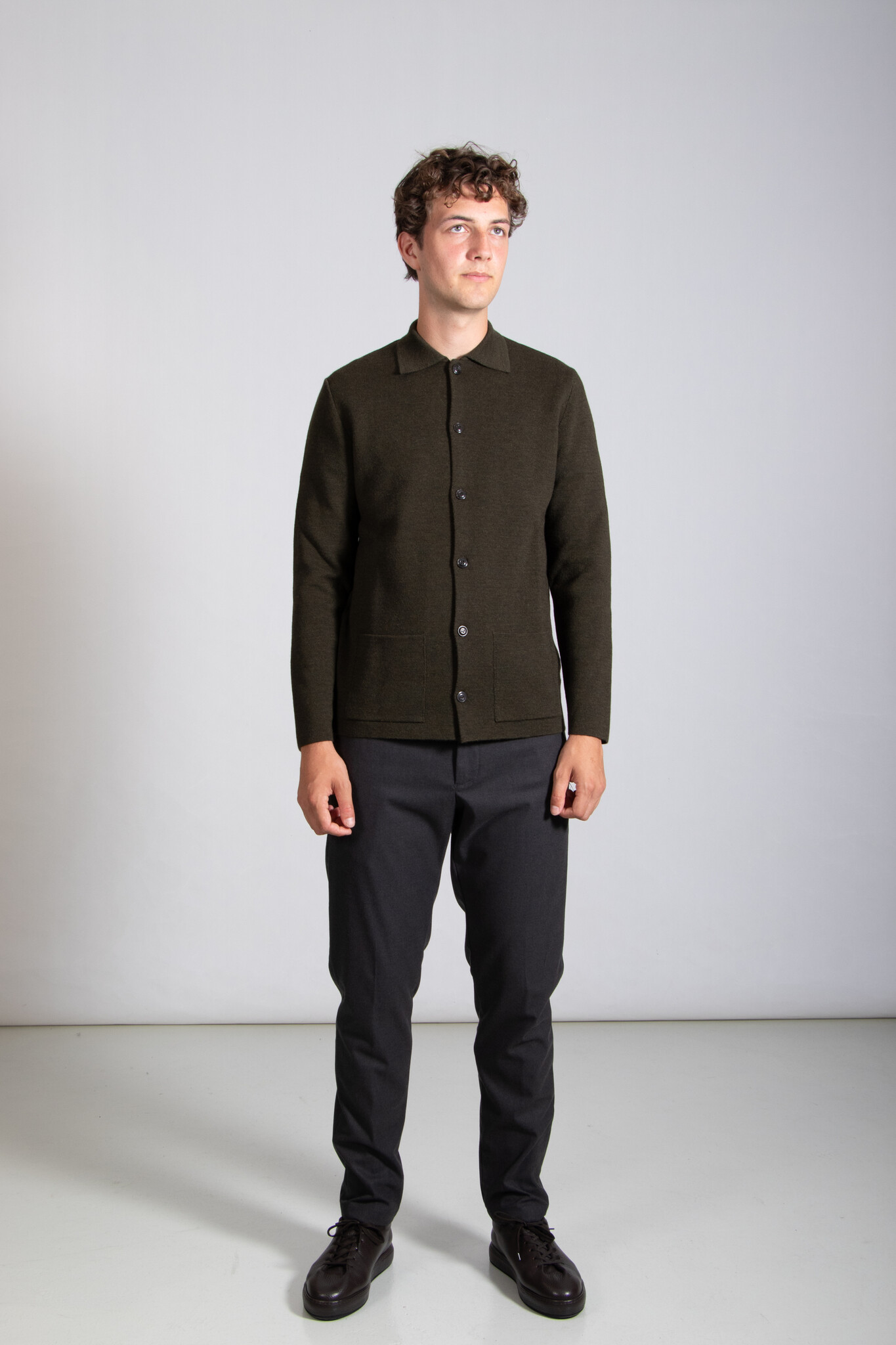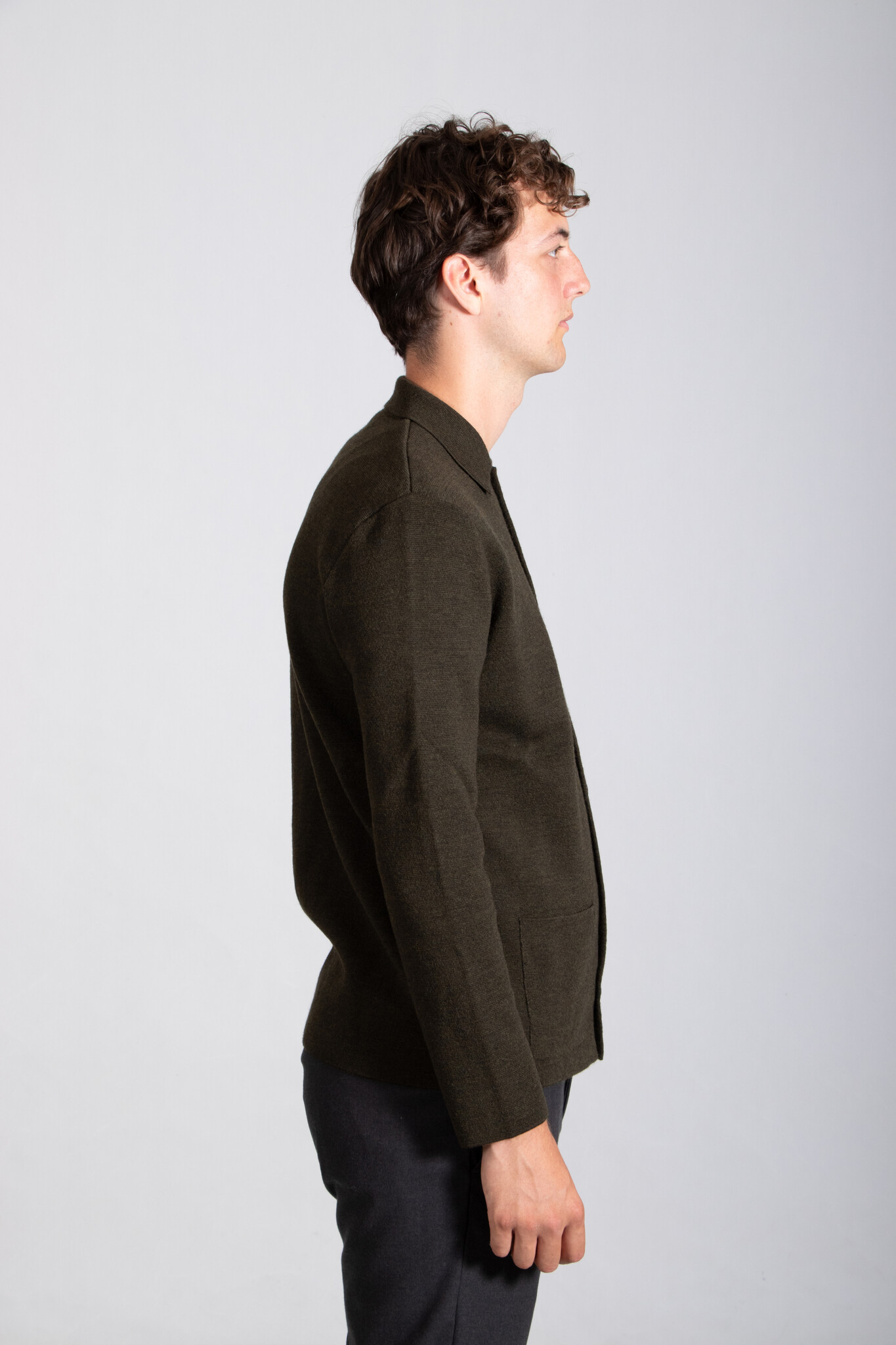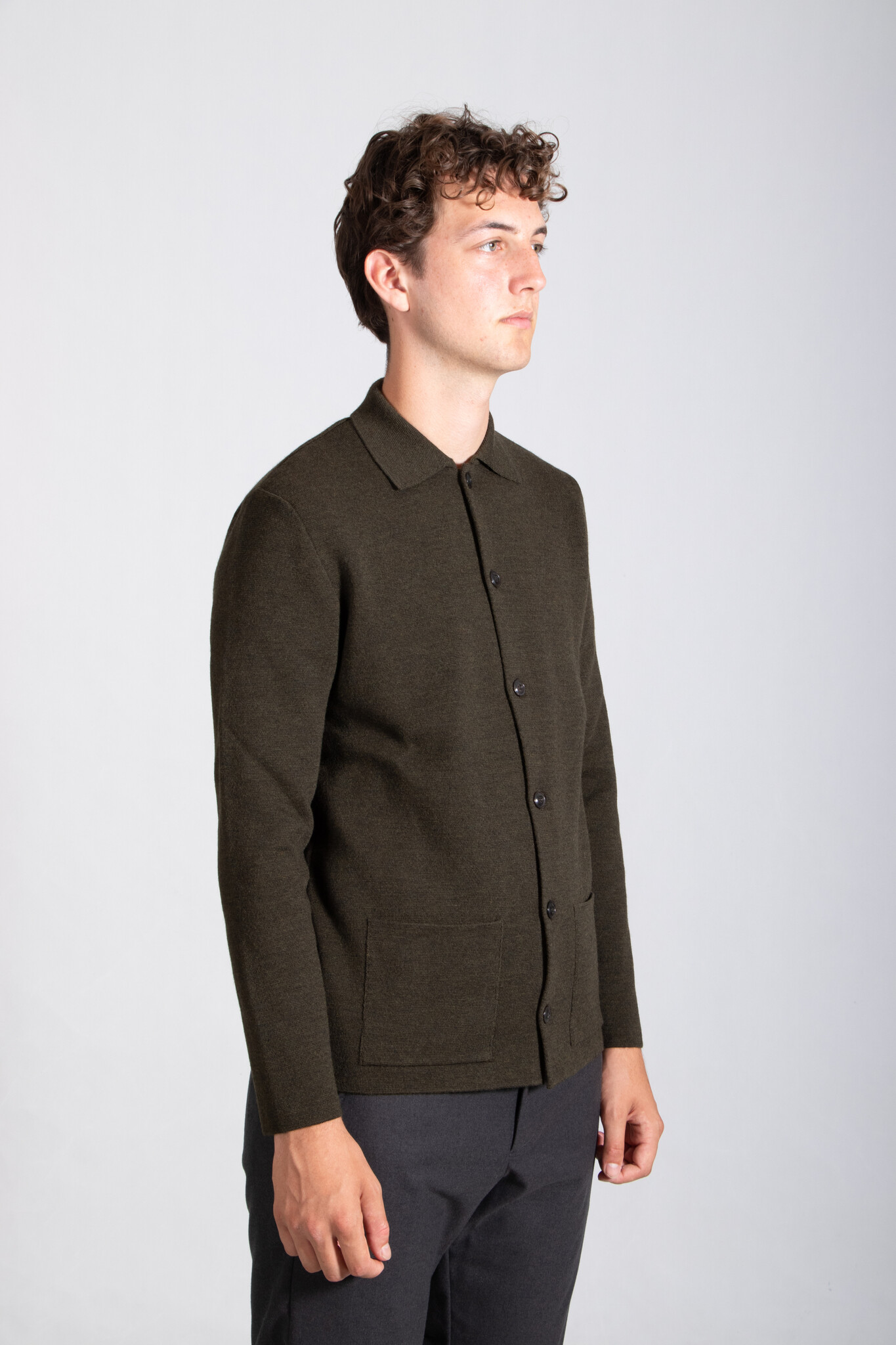 Vest van het Italiaanse breimerk G.R.P. in een gemêleerde grijze kleur. De stof is een stugge, dichtgebreide merinowol. Het vest is voorzien van knopen. Ons model is 192 cm lang en draagt maat XL. | |
