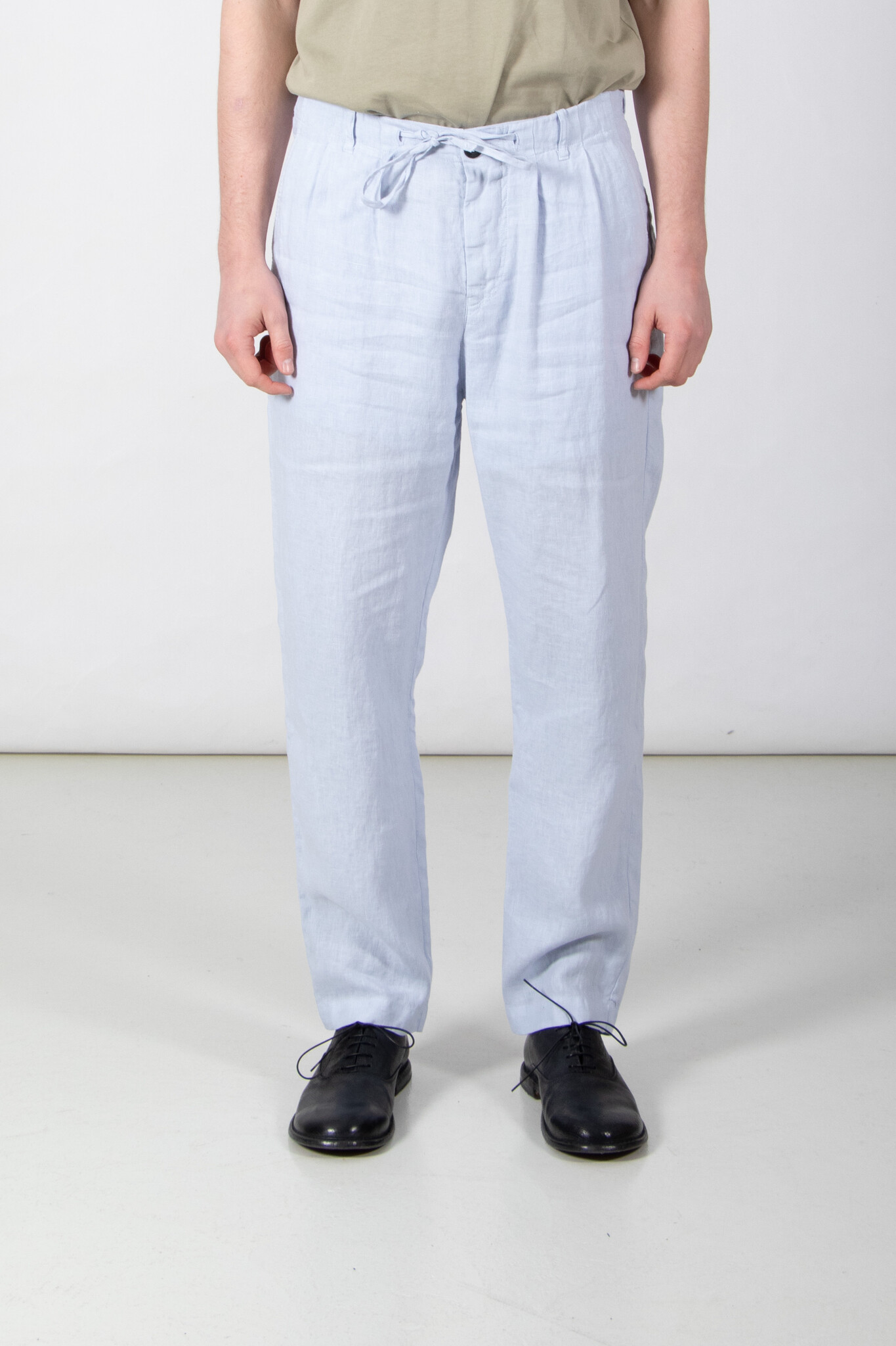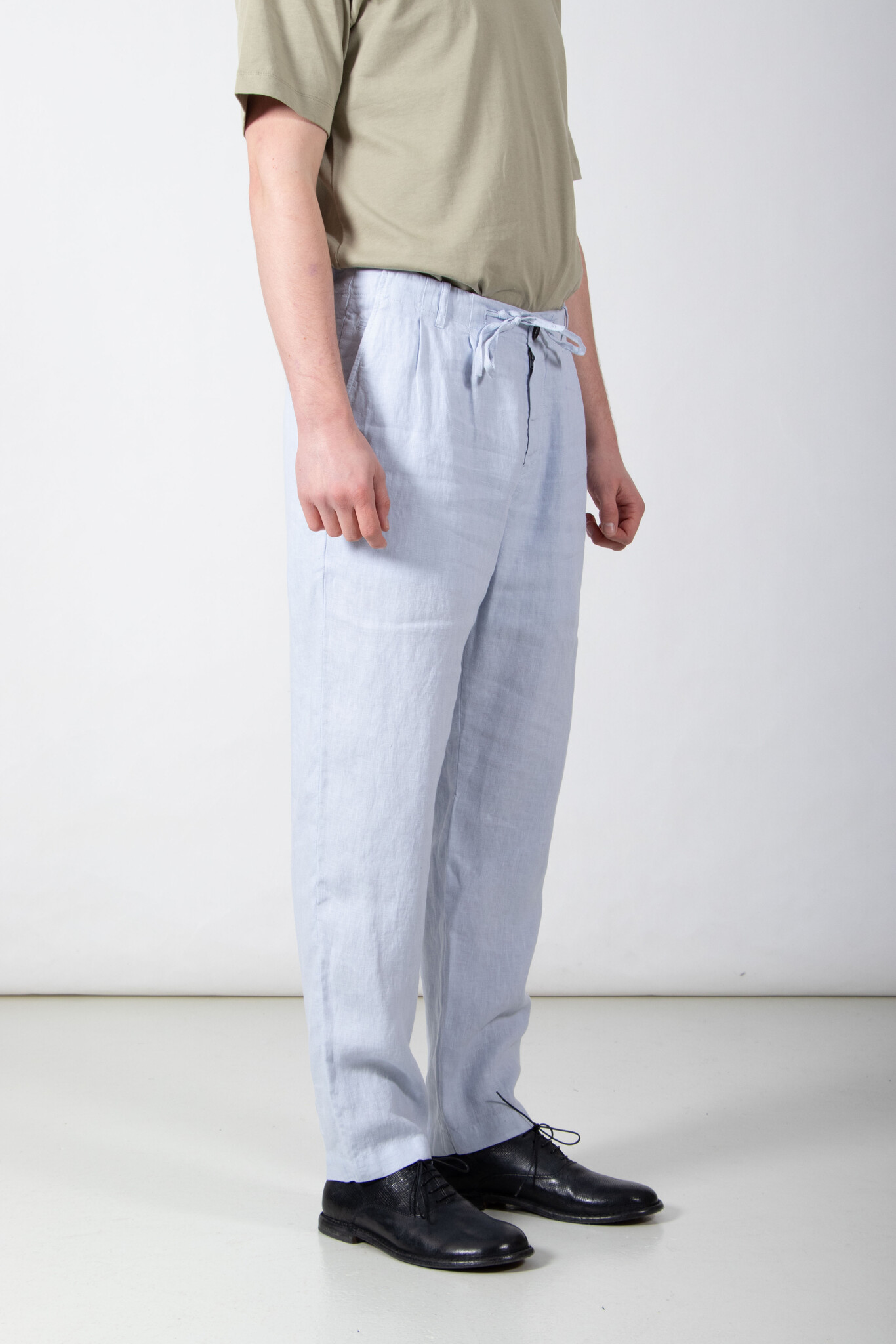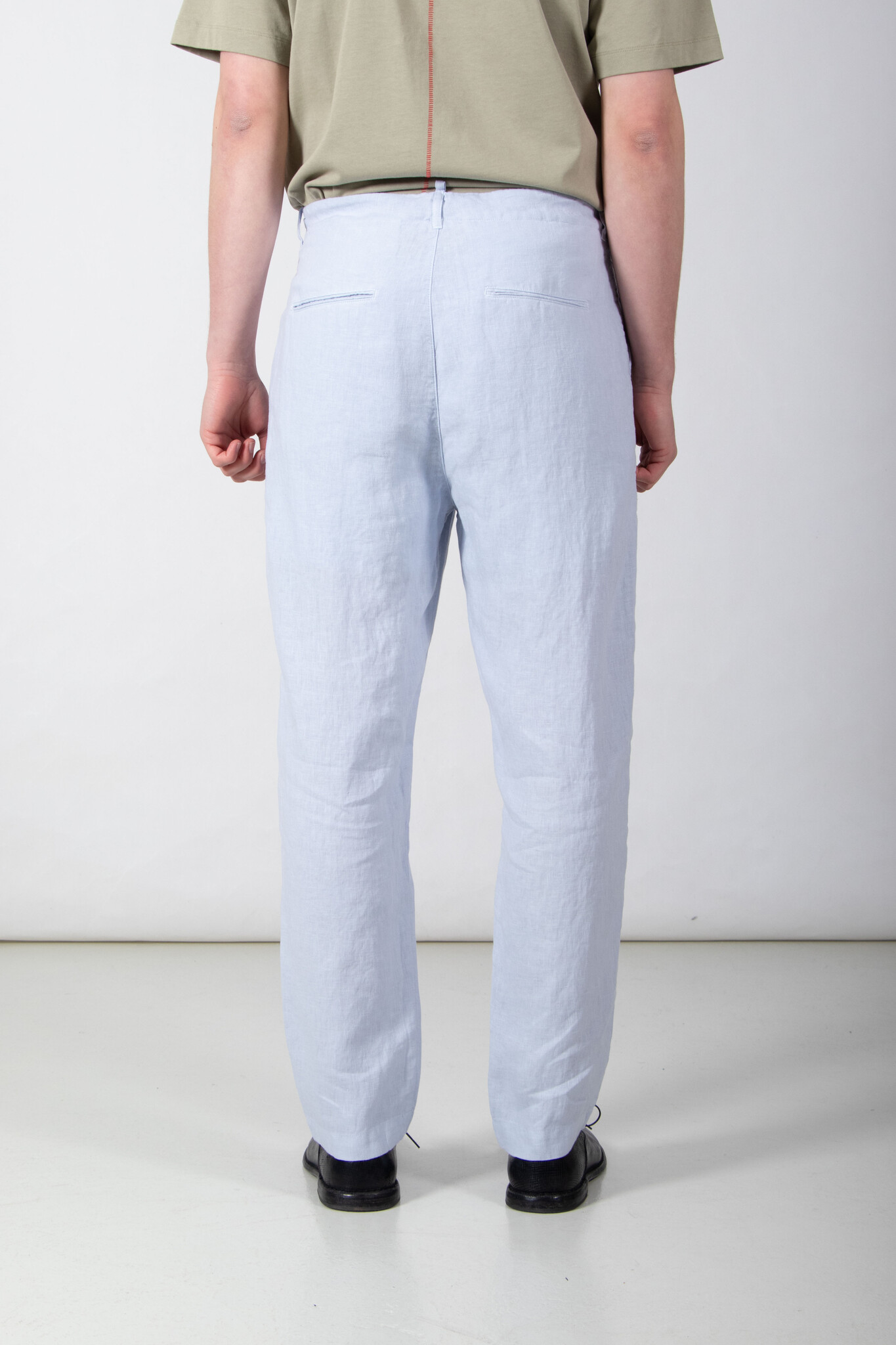 | Broek van Hannes Roether, gemaakt van een wat dikkere, zachte linnen. Ons models is 189 cm lang en draagt een maat M. | |