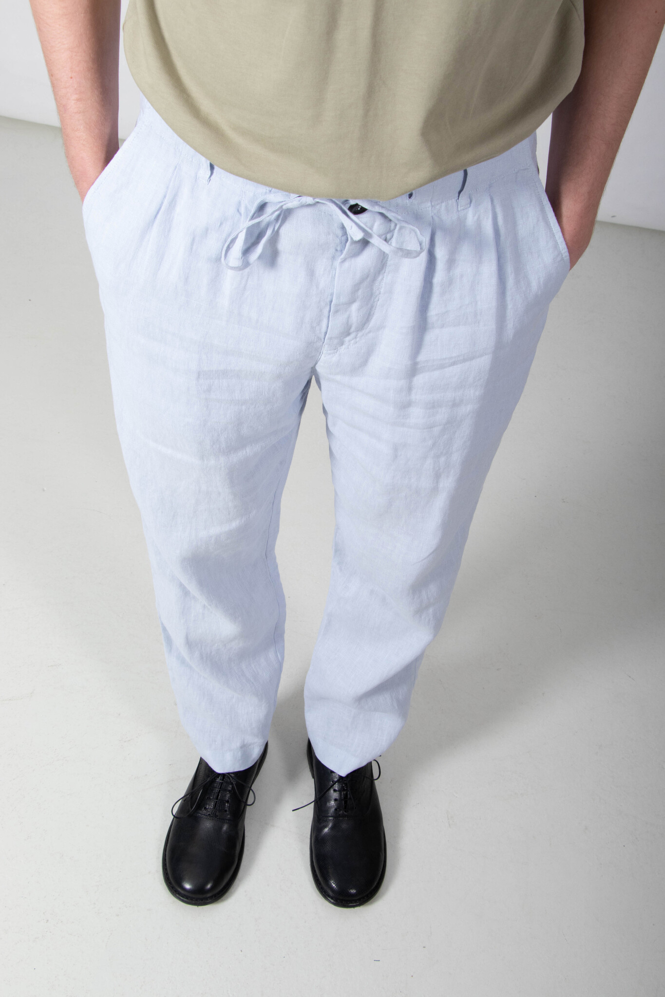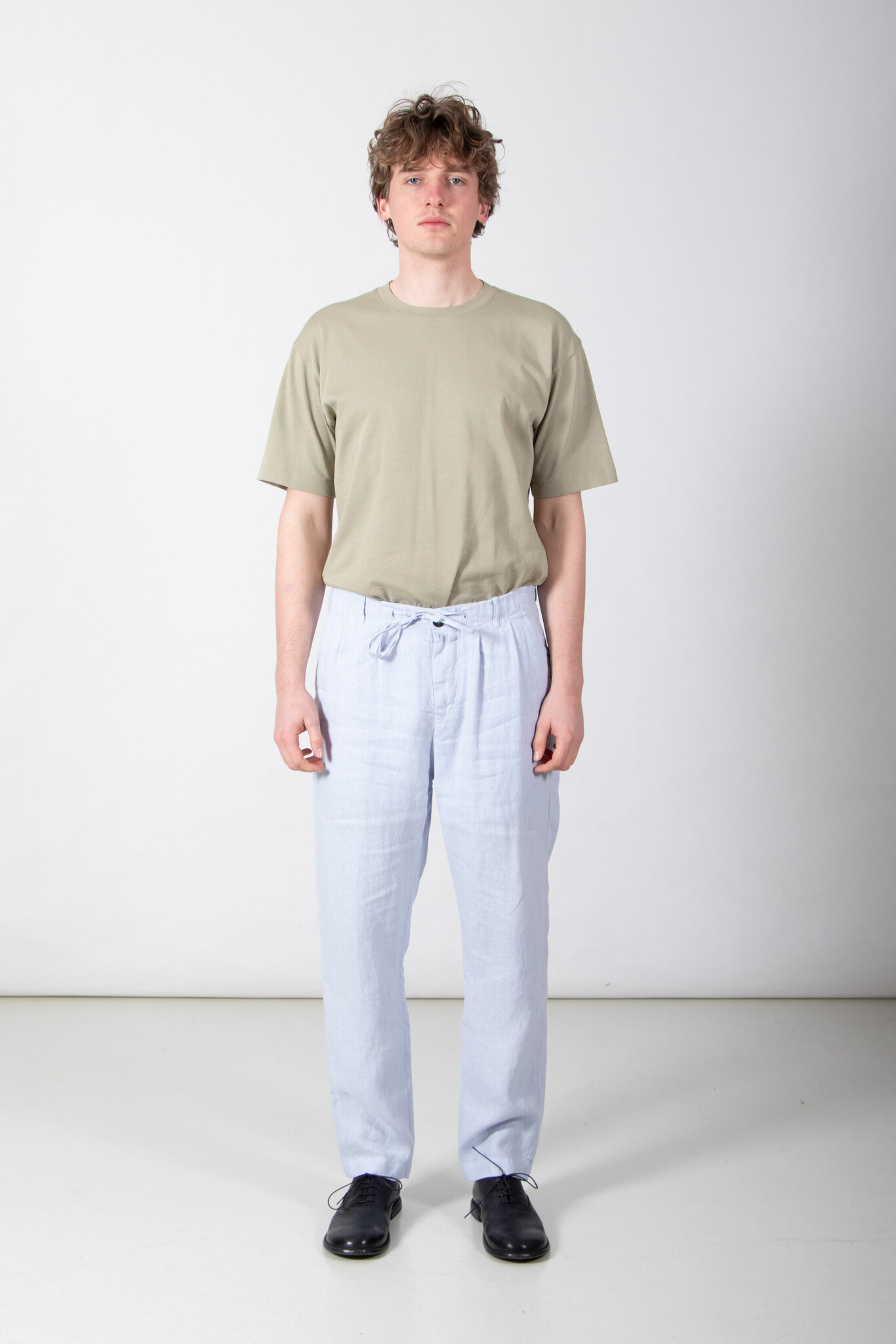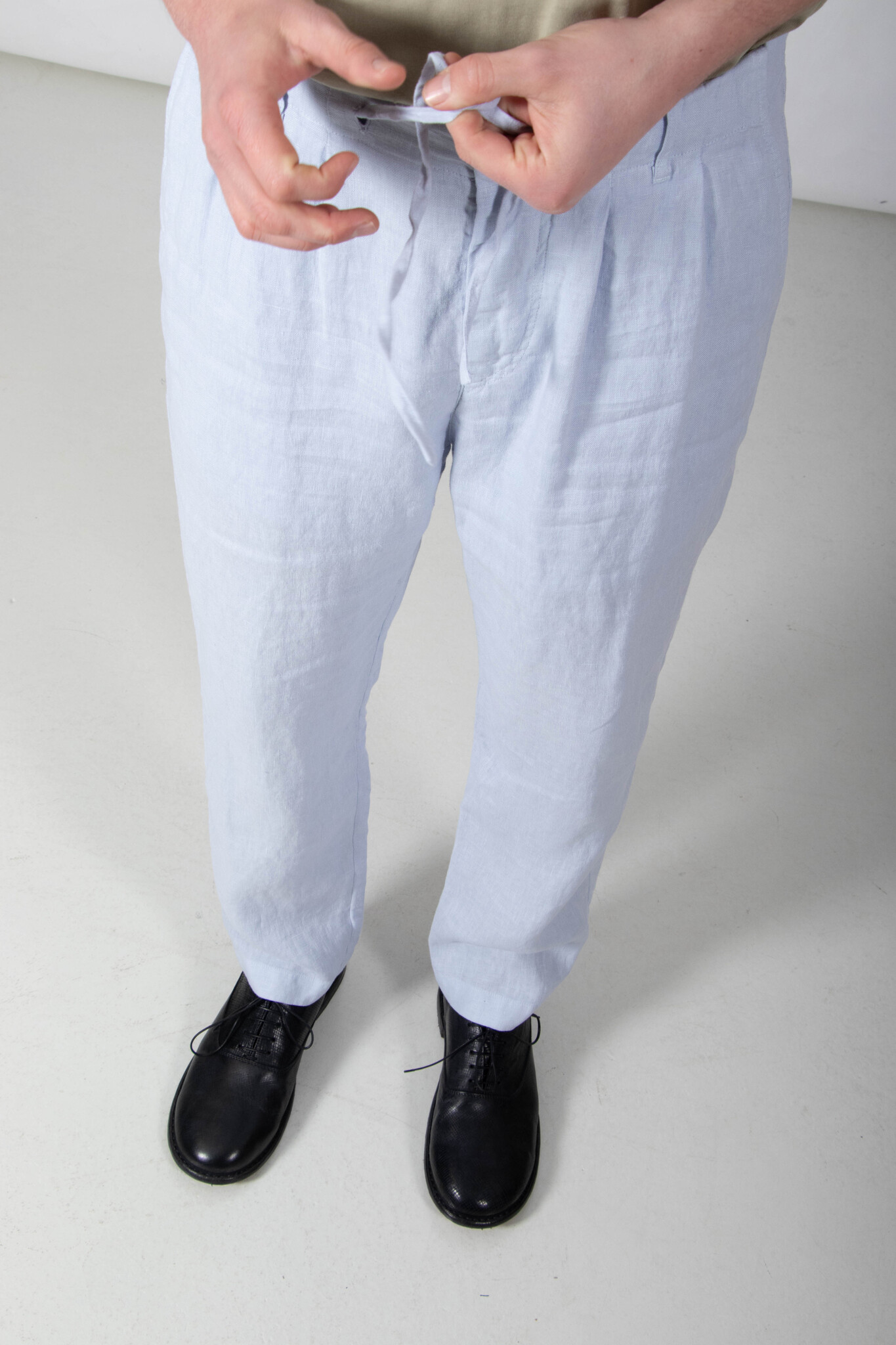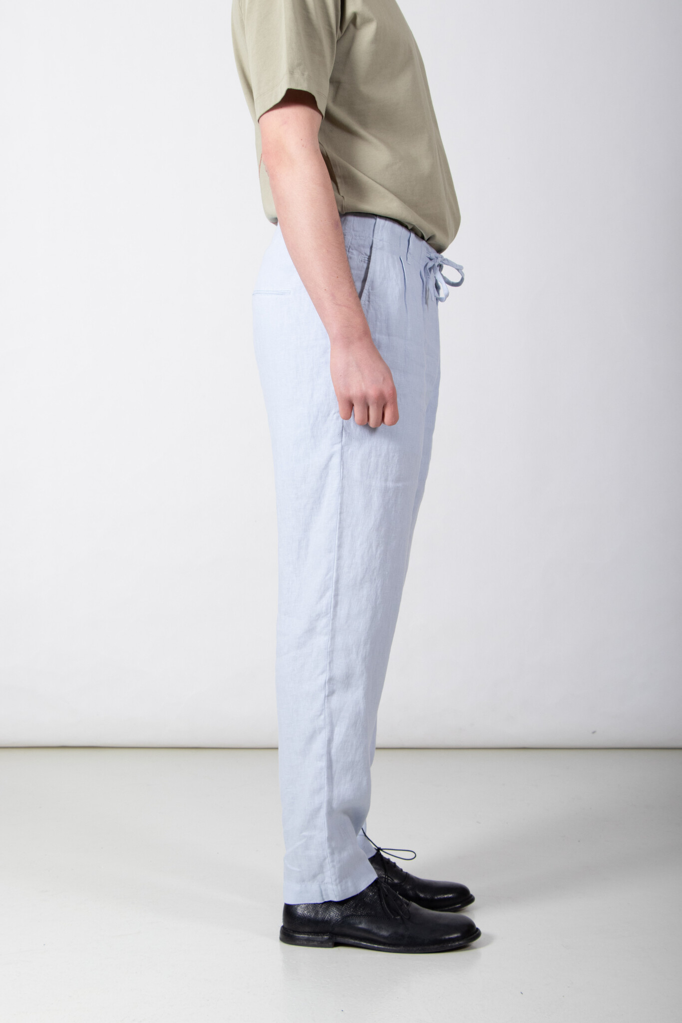 | Broek van Hannes Roether, gemaakt van een wat dikkere, zachte linnen. Ons models is 189 cm lang en draagt een maat M. | |