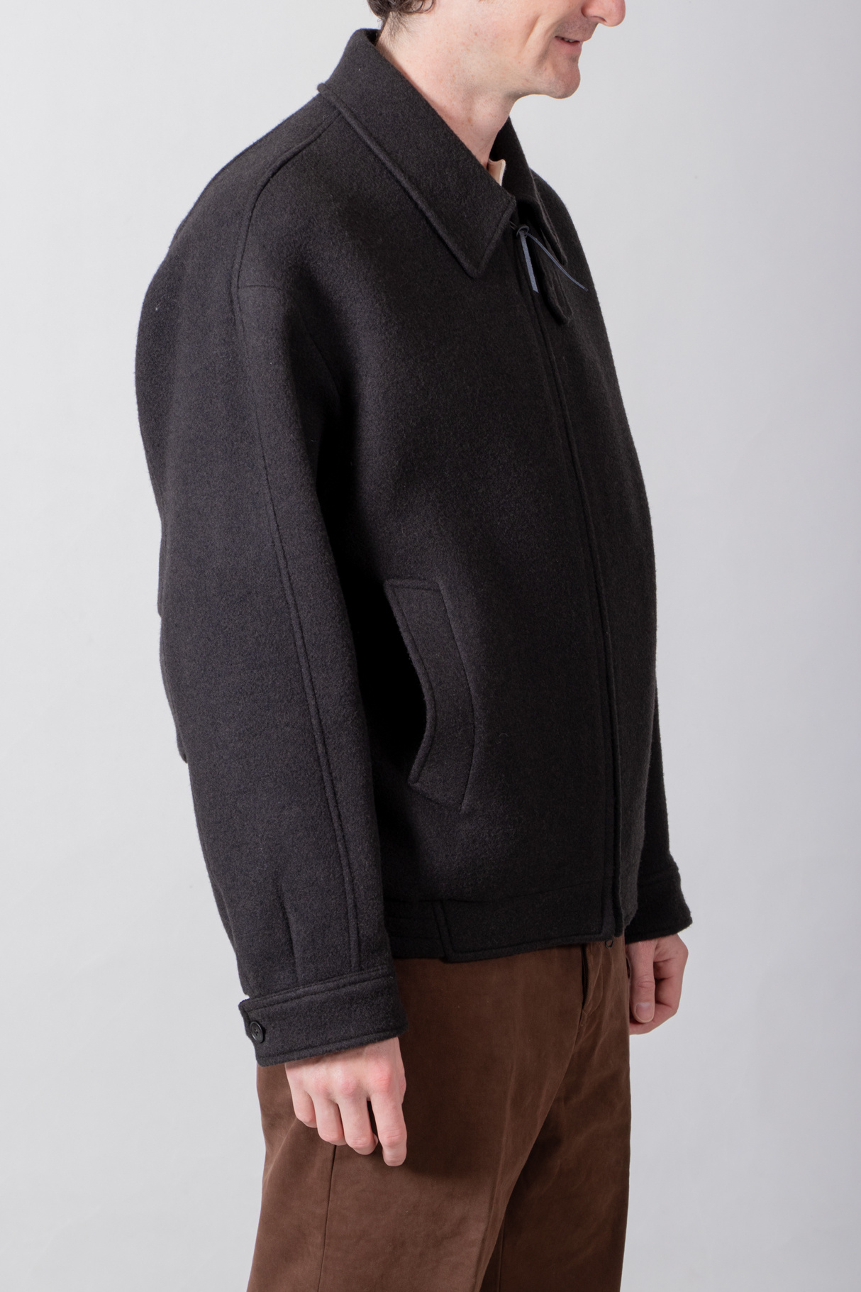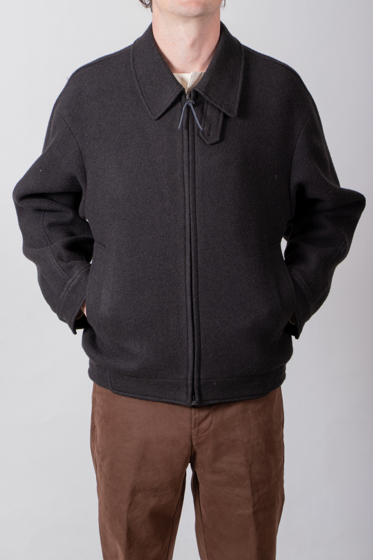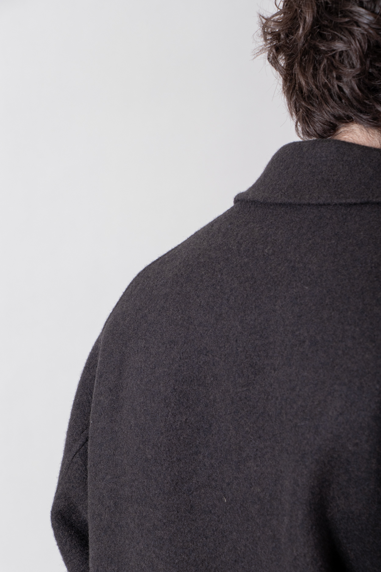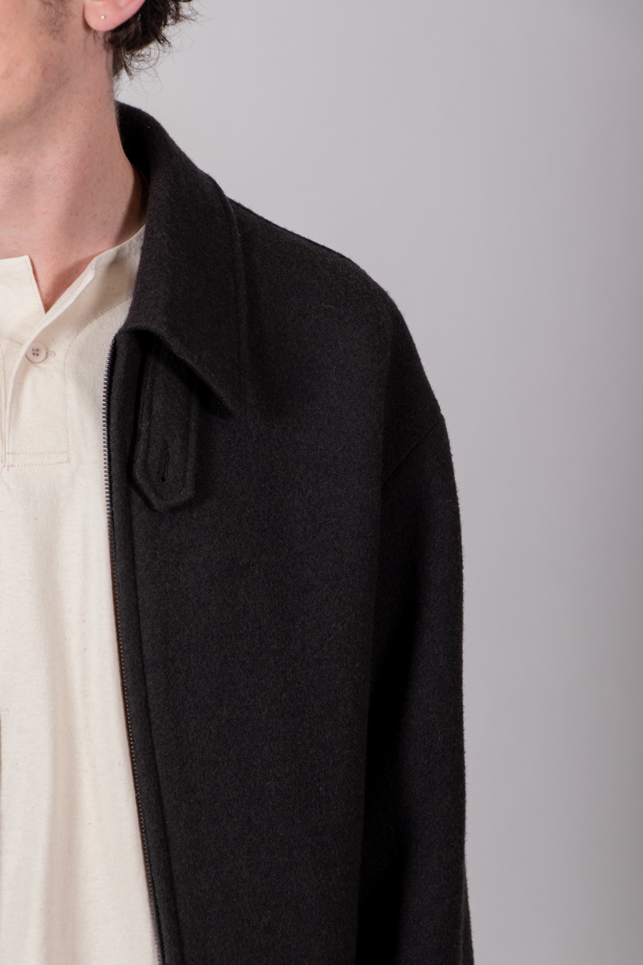 | Wollen jas van het Zuid-Koreaanse Rough Side, gevoerd met een nylon-stof. De jas is voorzien van rits, elastiek in de band, twee zakken en éen binnenzak. Ons model is 189 cm lang en draagt een maat L. | |
