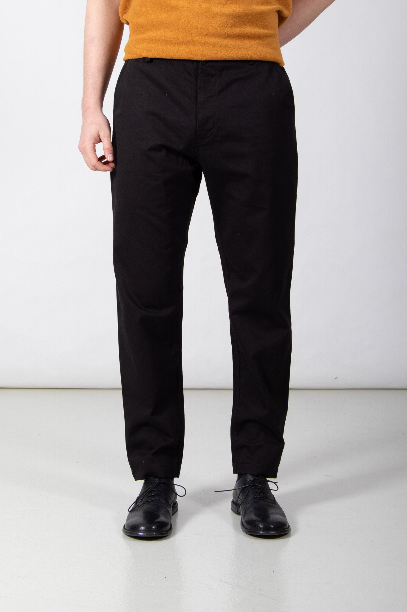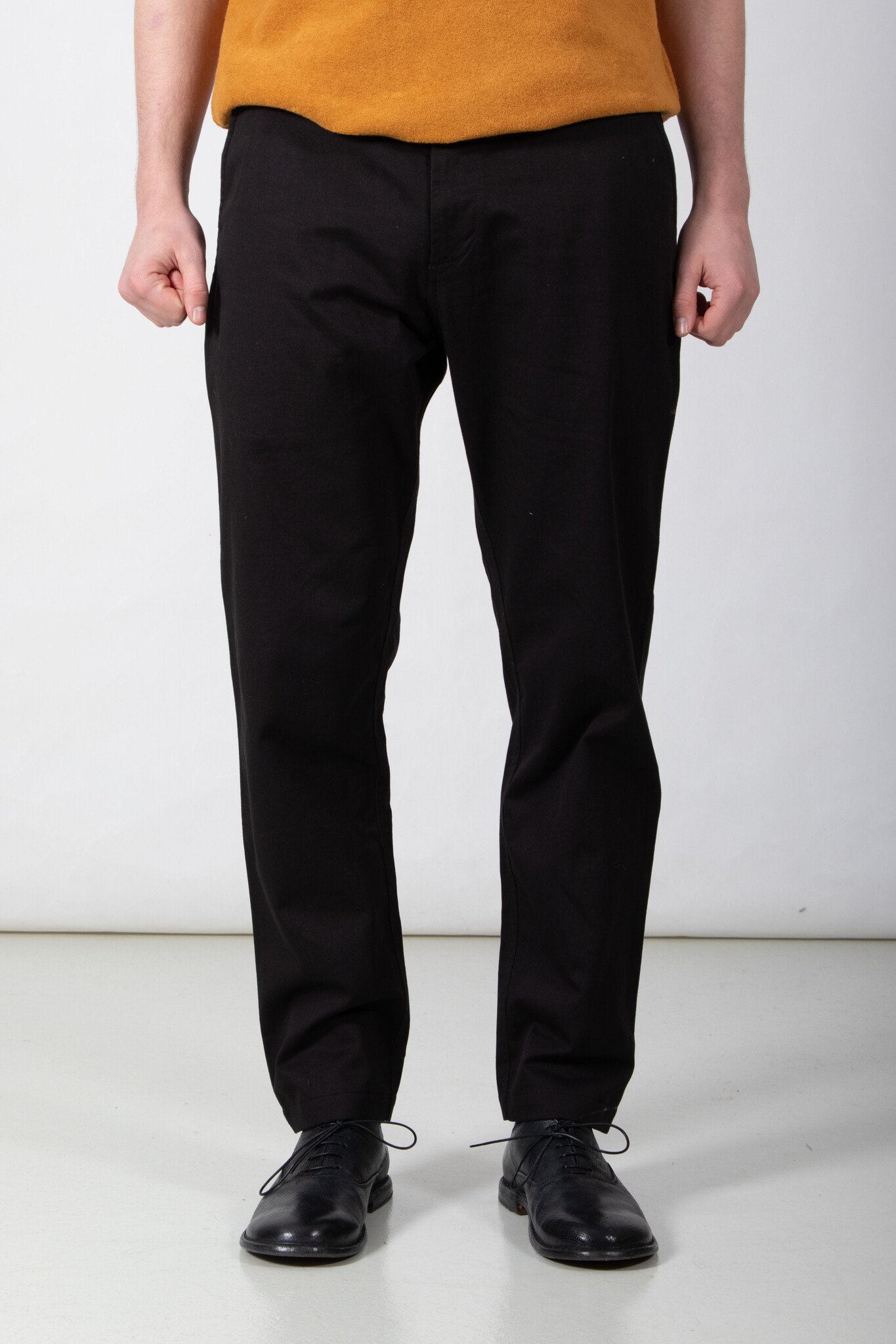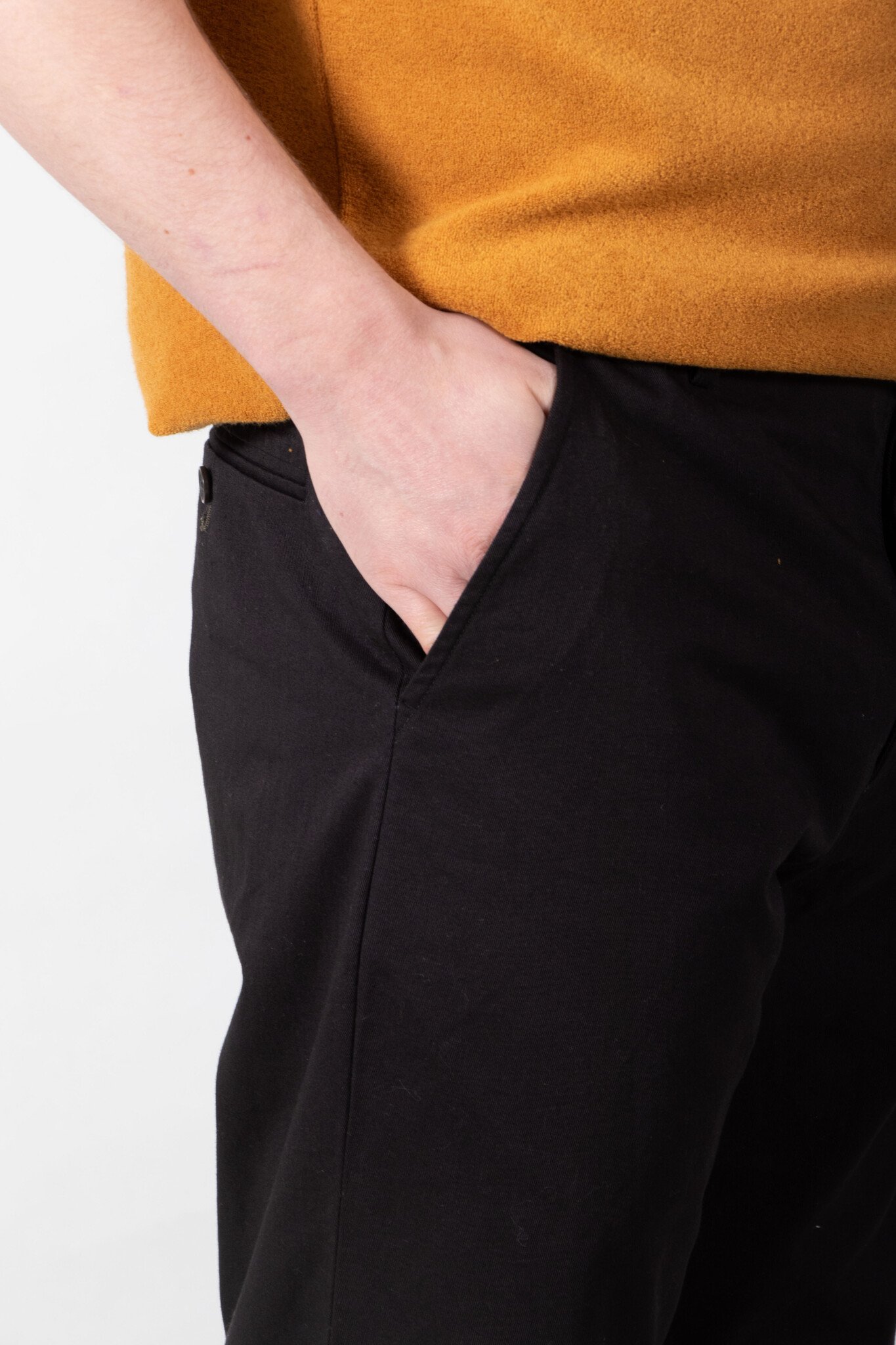 | De Military Chino van Universal Works. Wie kent hem of haar niet? Dit keer in een wat stevige katoenen stof uit Portugal. Ons model is 189 cm lang en draagt een maat 32. | |