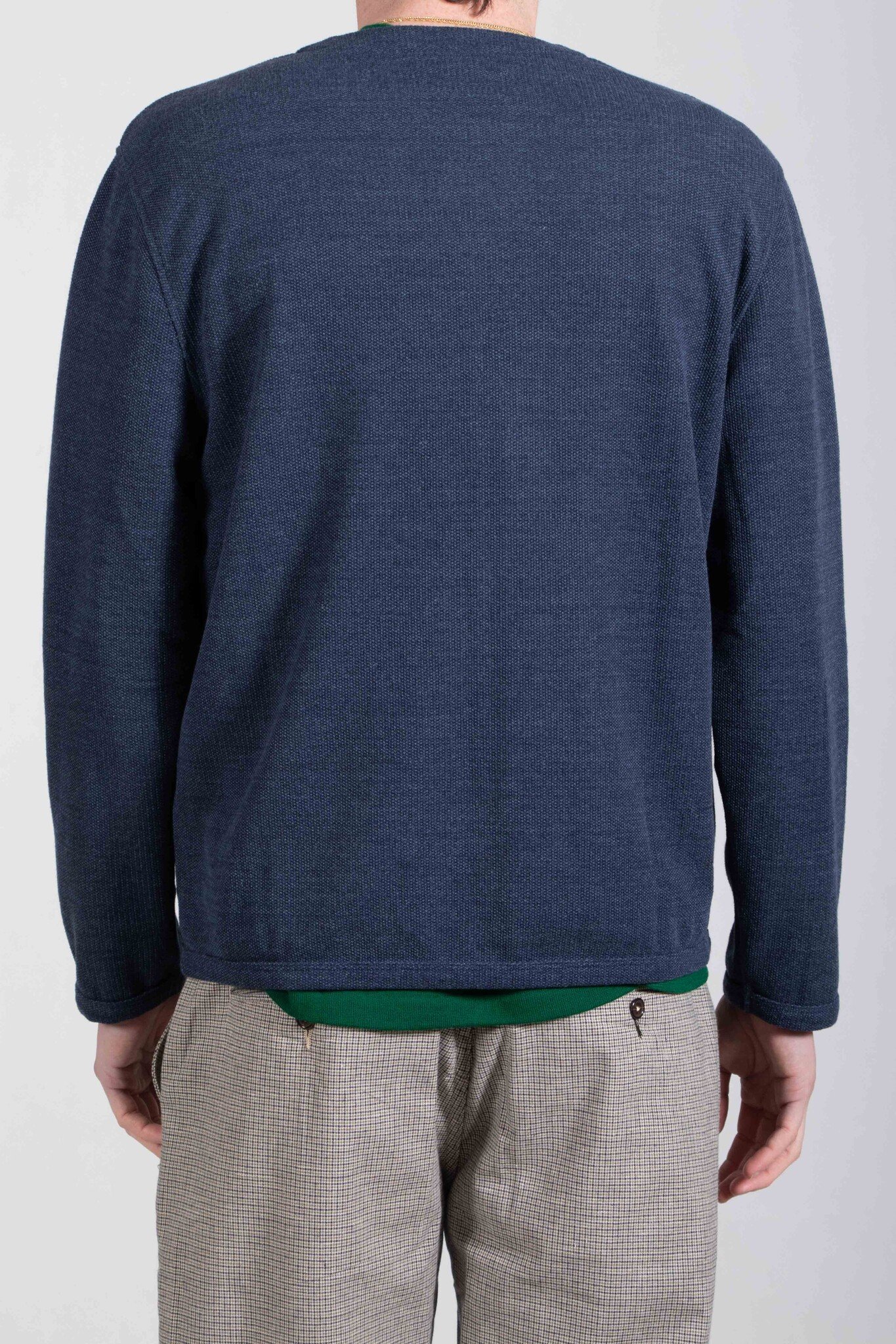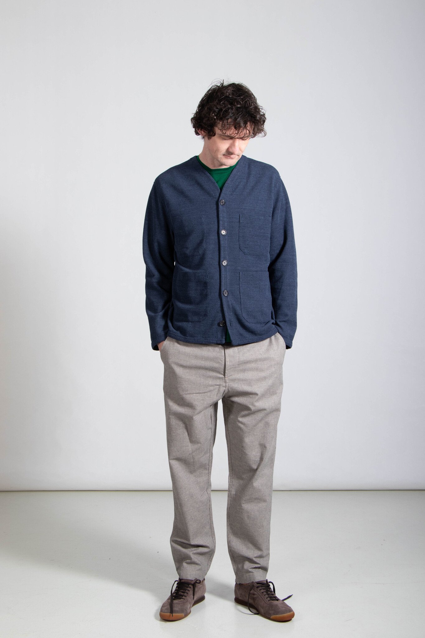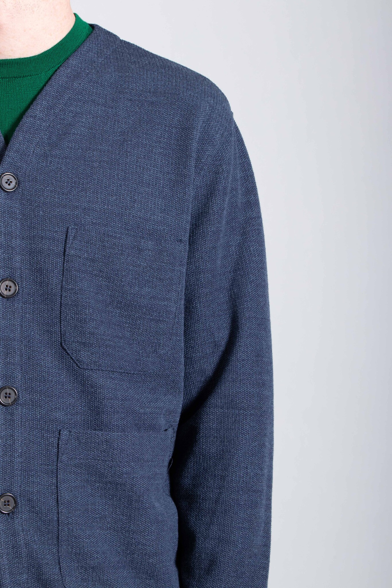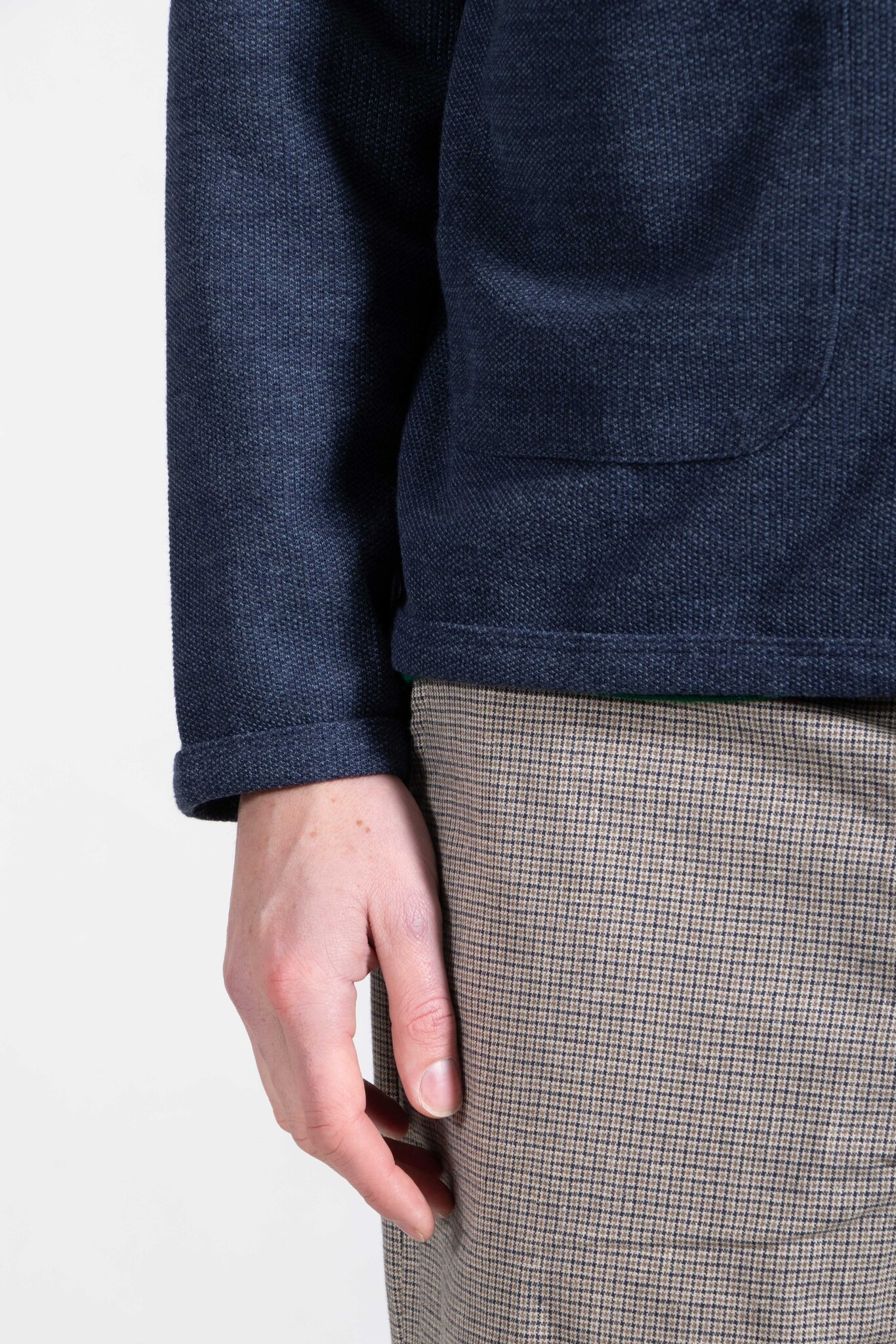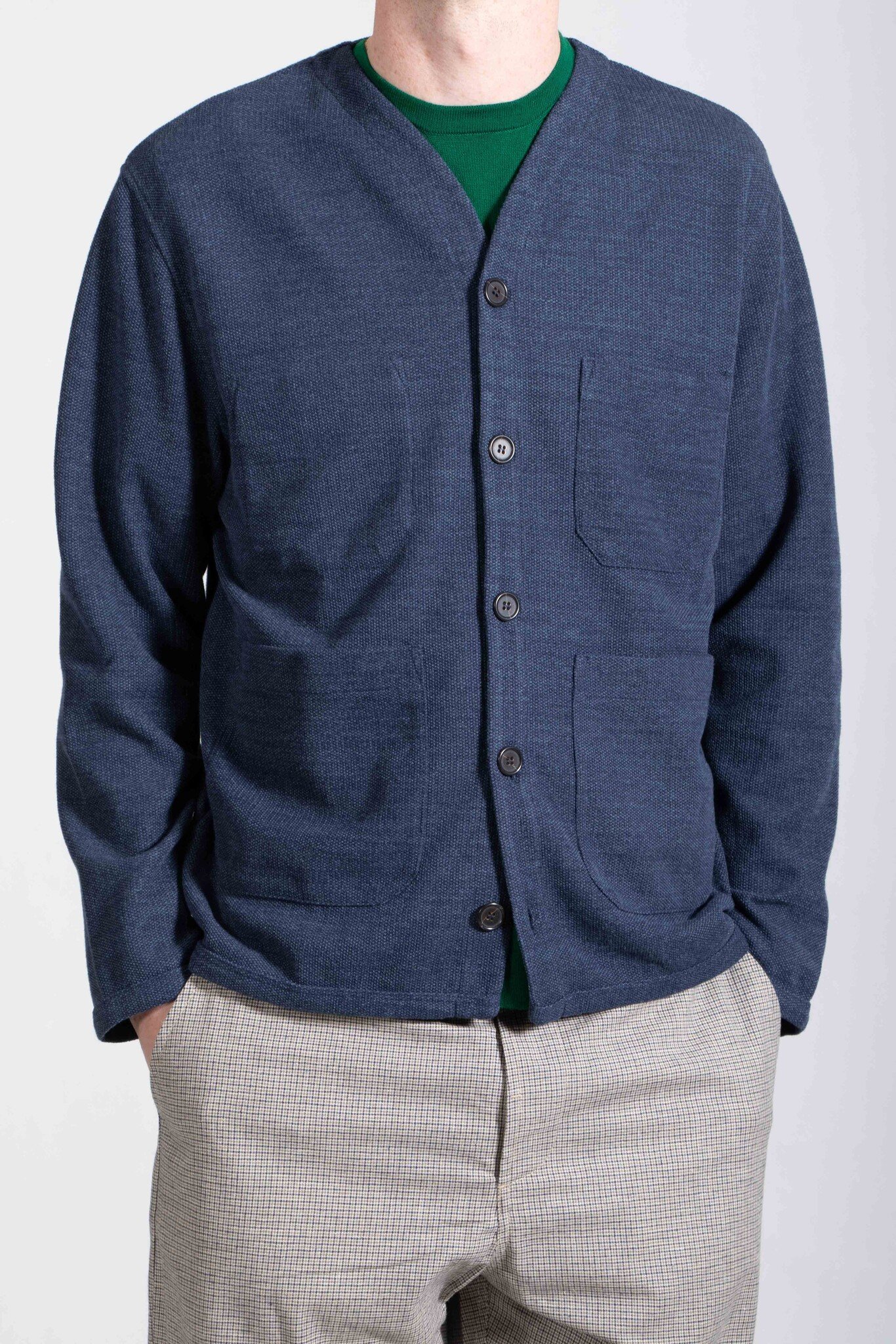 | Een wat dunner zomervest van Universal Works, gemaakt van een mix van katoen, polyester en viscose. Ons model is 189 cm lang en draagt een maat L. | |