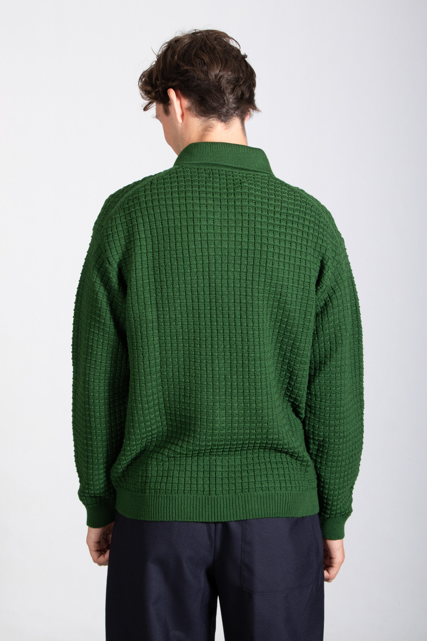 Gebreid vest van het Britse Universal Works. De stof is gebreid in wafelpatroon en gemaakt van merinowol met acryl. Ons model is 192 cm lang en draagt een maat L. | |