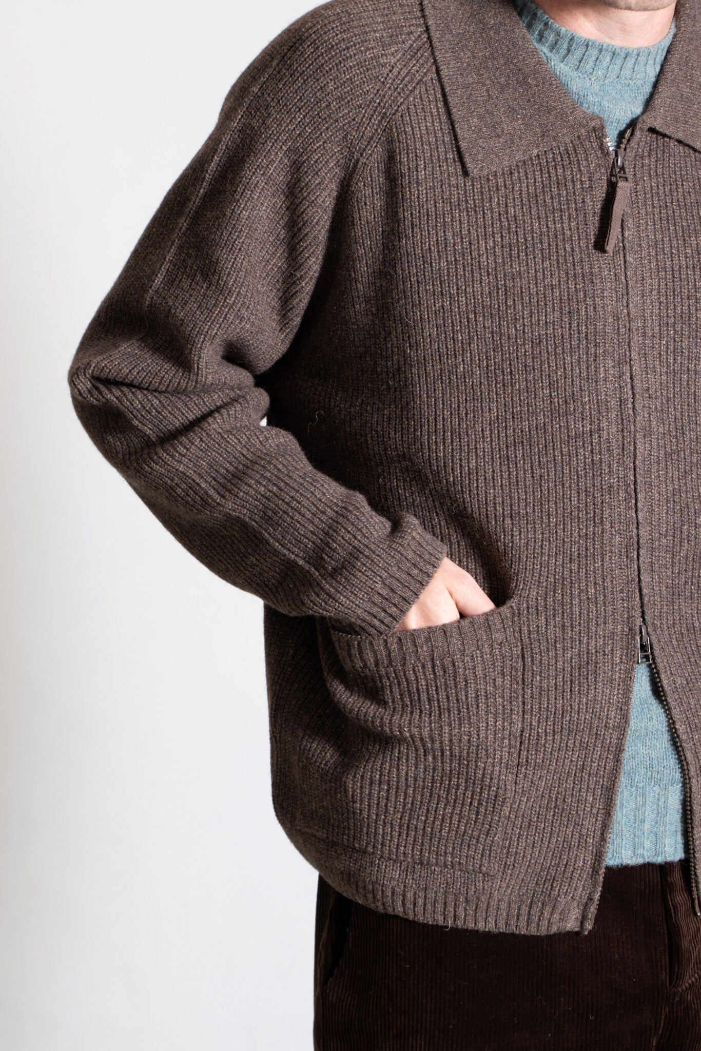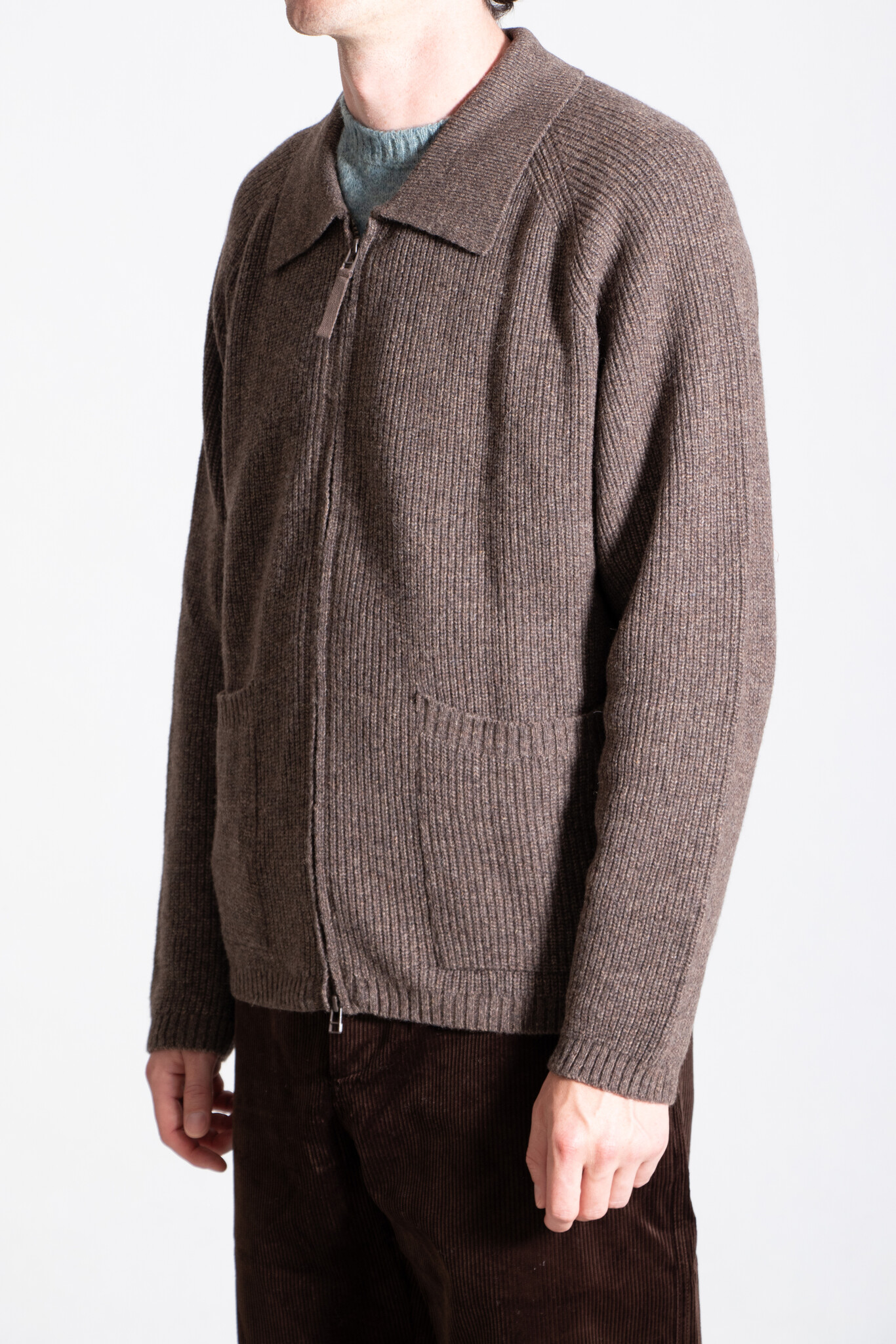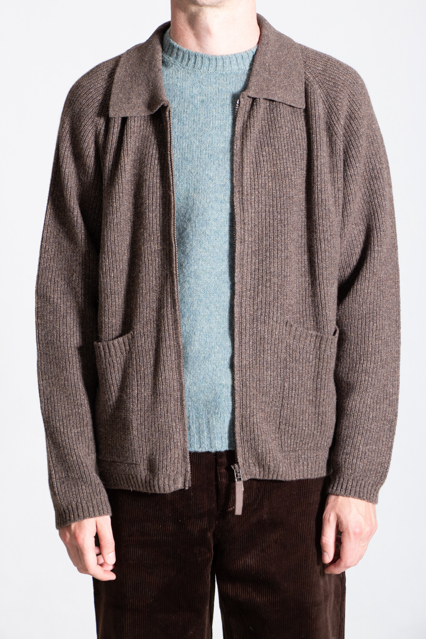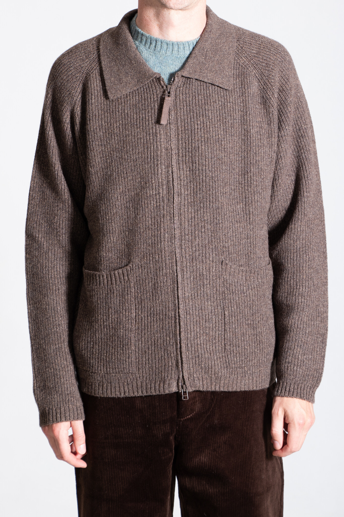 A zip front, knitted jacket with a raglan sleeve, a fully-fashioned collar, and our signature two-way zip.